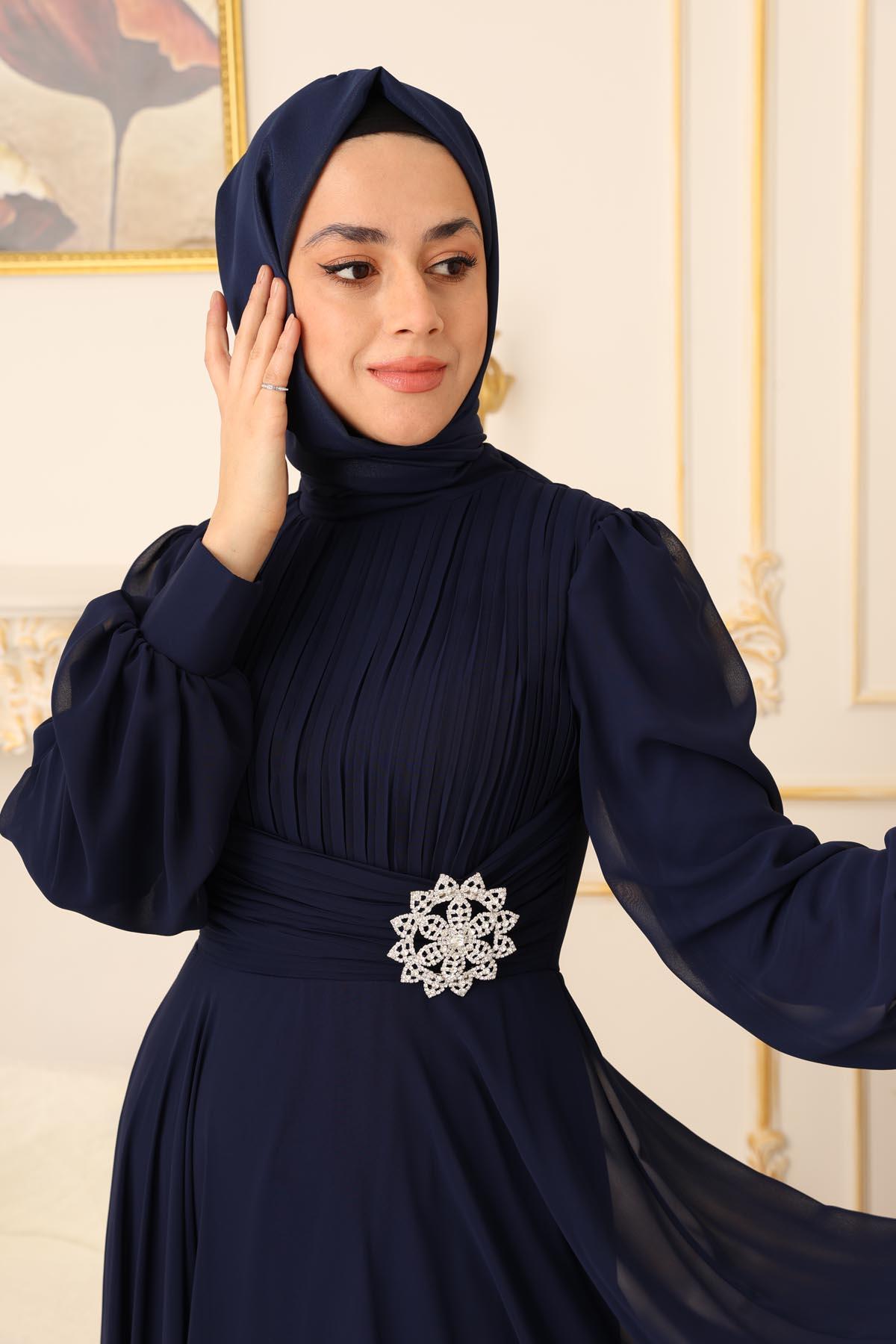Düğün, nişan, mezuniyet gibi özel davetlerinizde veya özel günlerinizde kendinizi özel hissetmenize yardımcı olan Drapeli Kemer Toka Detaylı Şifon Tesettür Abiye, Türkiye'nin önde gelen tesettür moda markalarından biri olan YILDIZ ABİYE tarafından üretilmiştir.