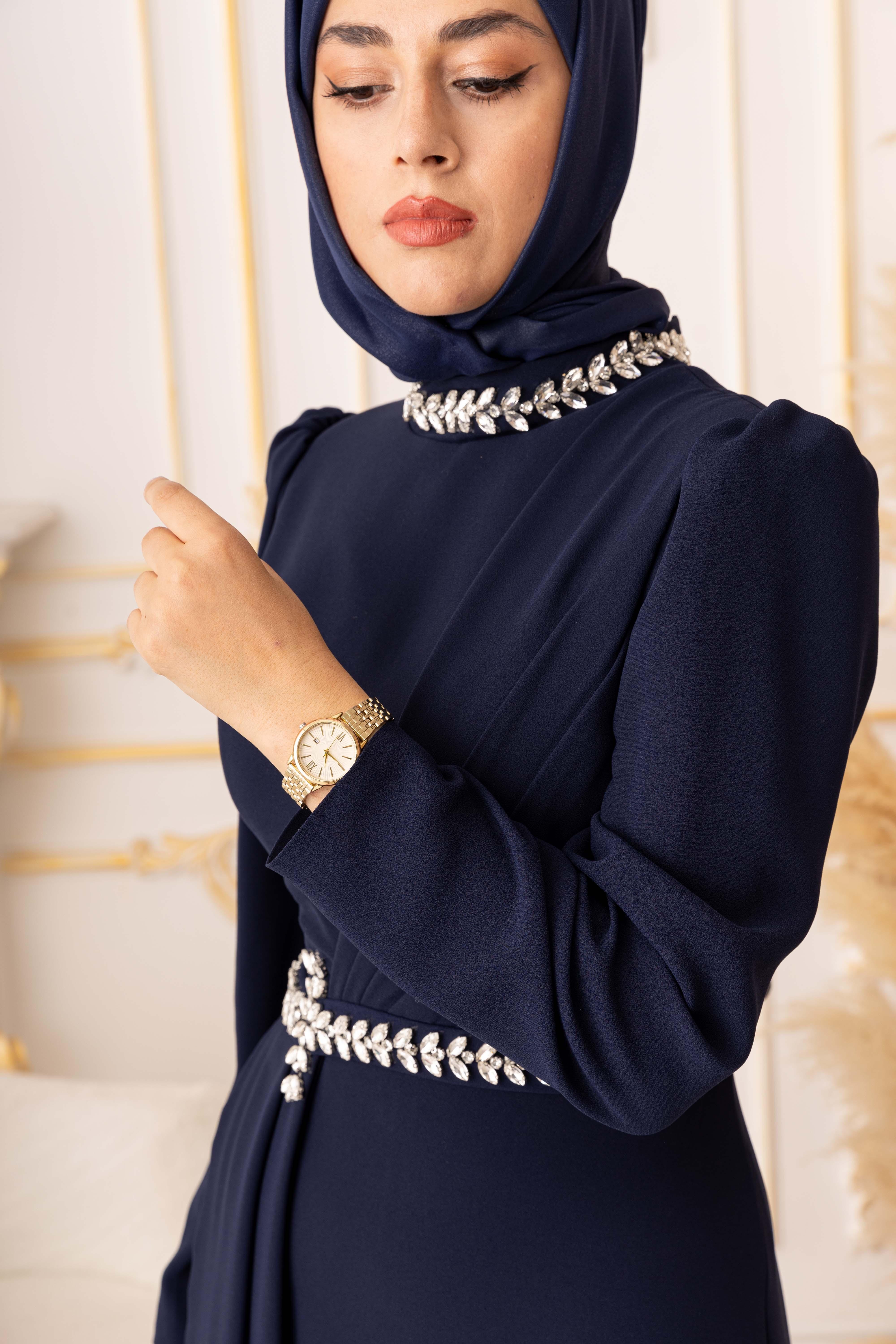yaka ve bel kısmında yer alan kristal taşlar, ürüne özel bir hava katmaktadır. Taşların dizilimleri ve büyüklükleri, ürüne farklı bir dokunuş ve ışıltılı bir görünüm kazandırmaktadır. Ayrıca pileli detaylarla birlikte bu taşlar, tesettürlü kadınların zarafetini ve şıklığını ön plana çıkarmaktadır.