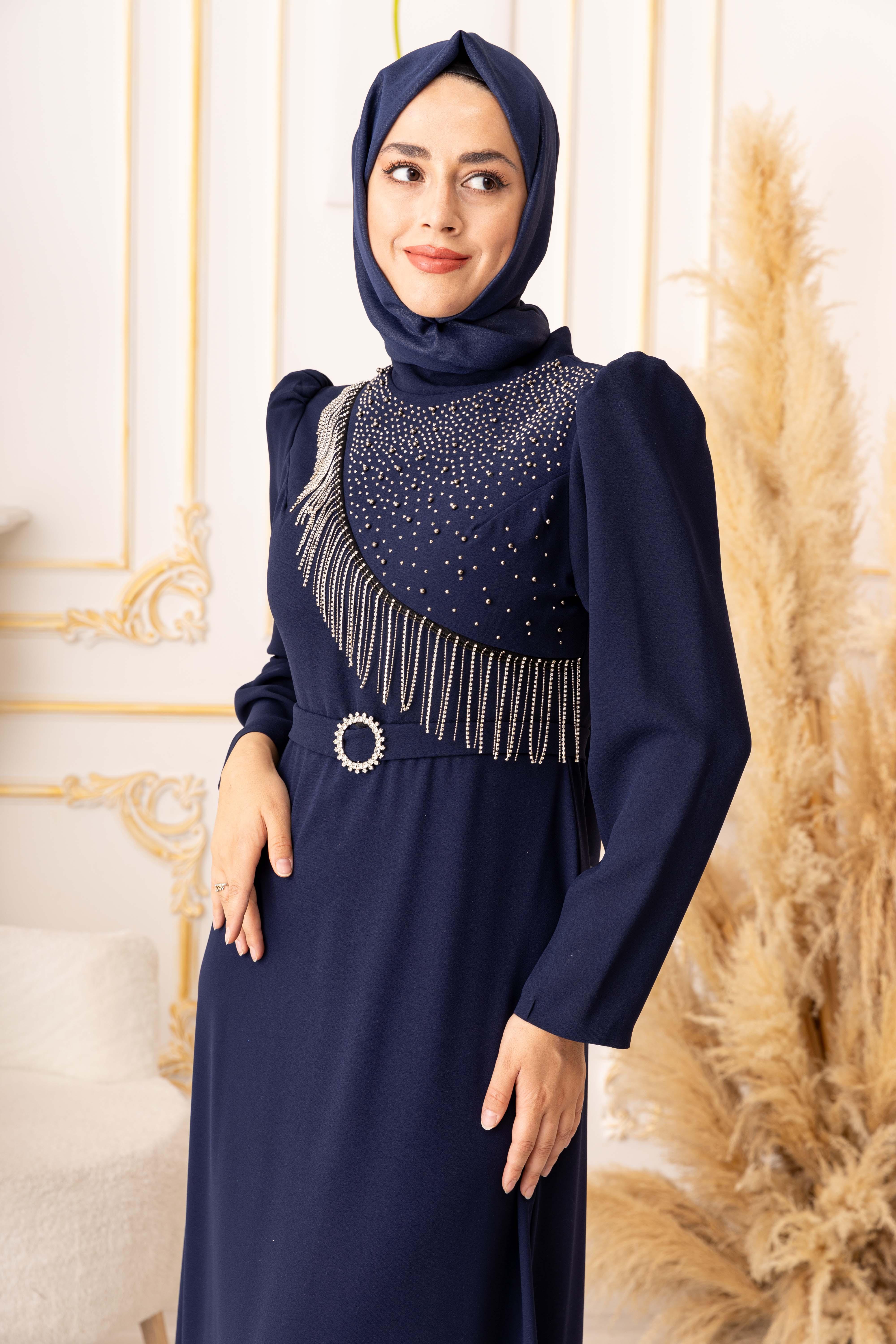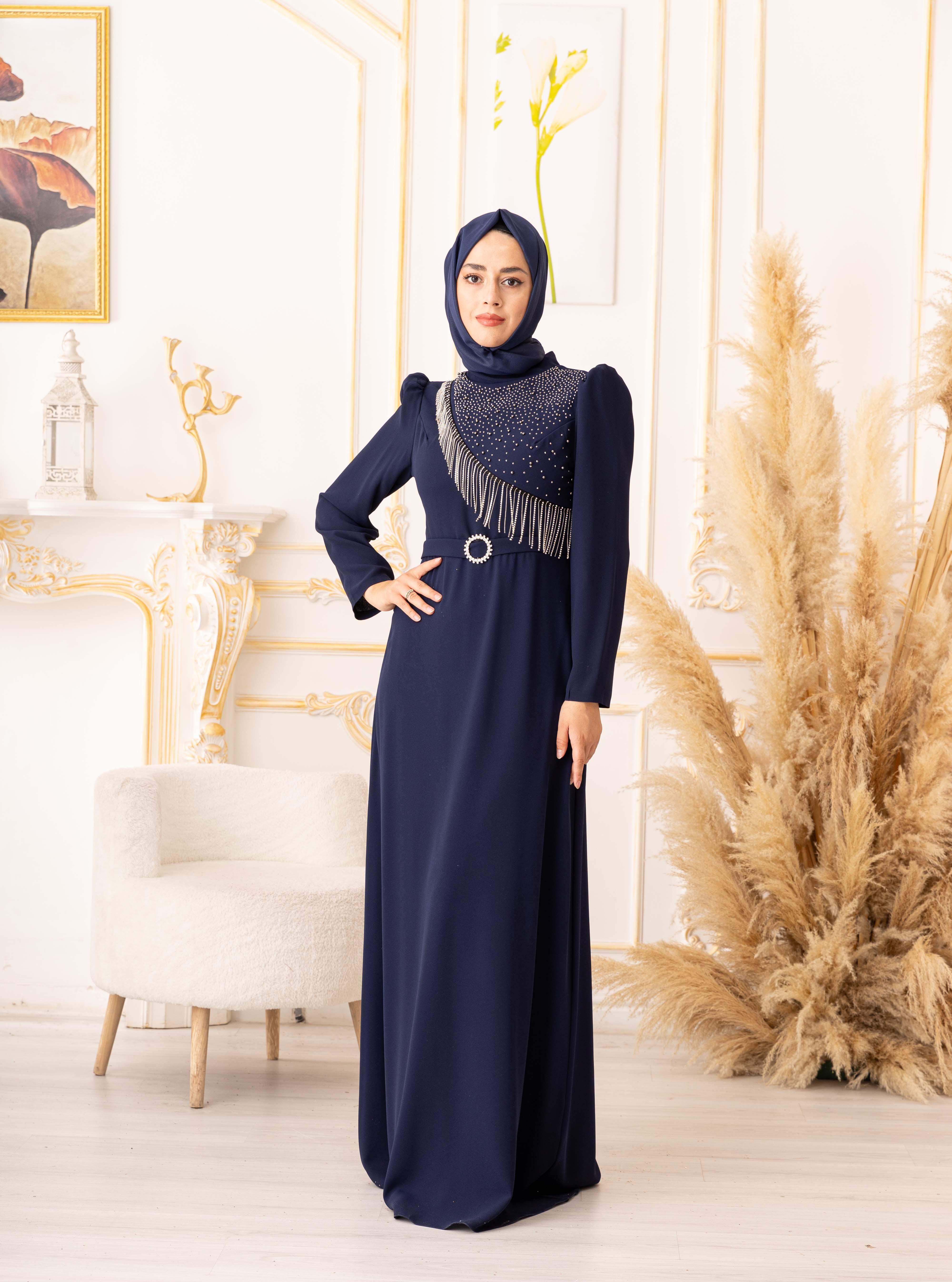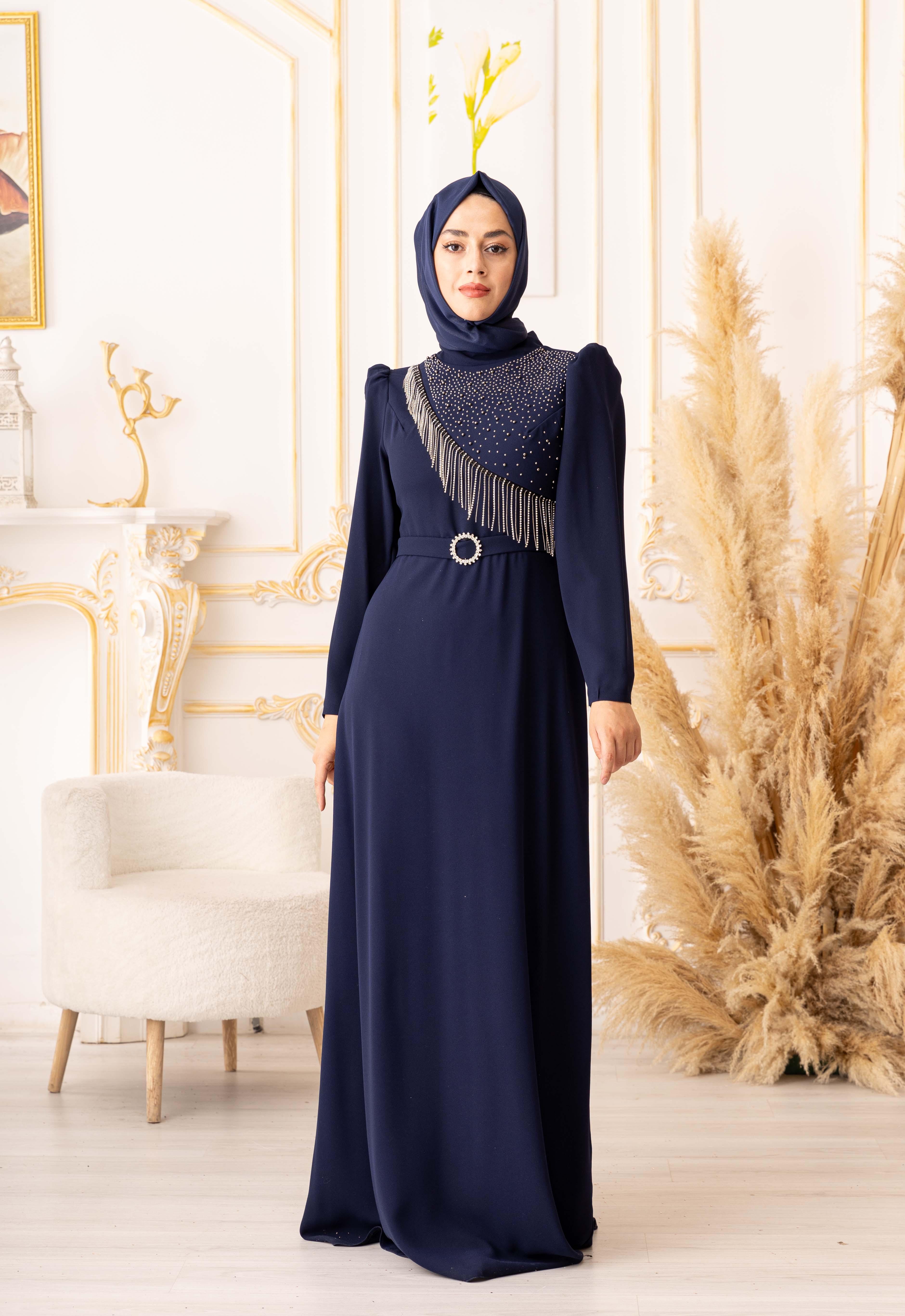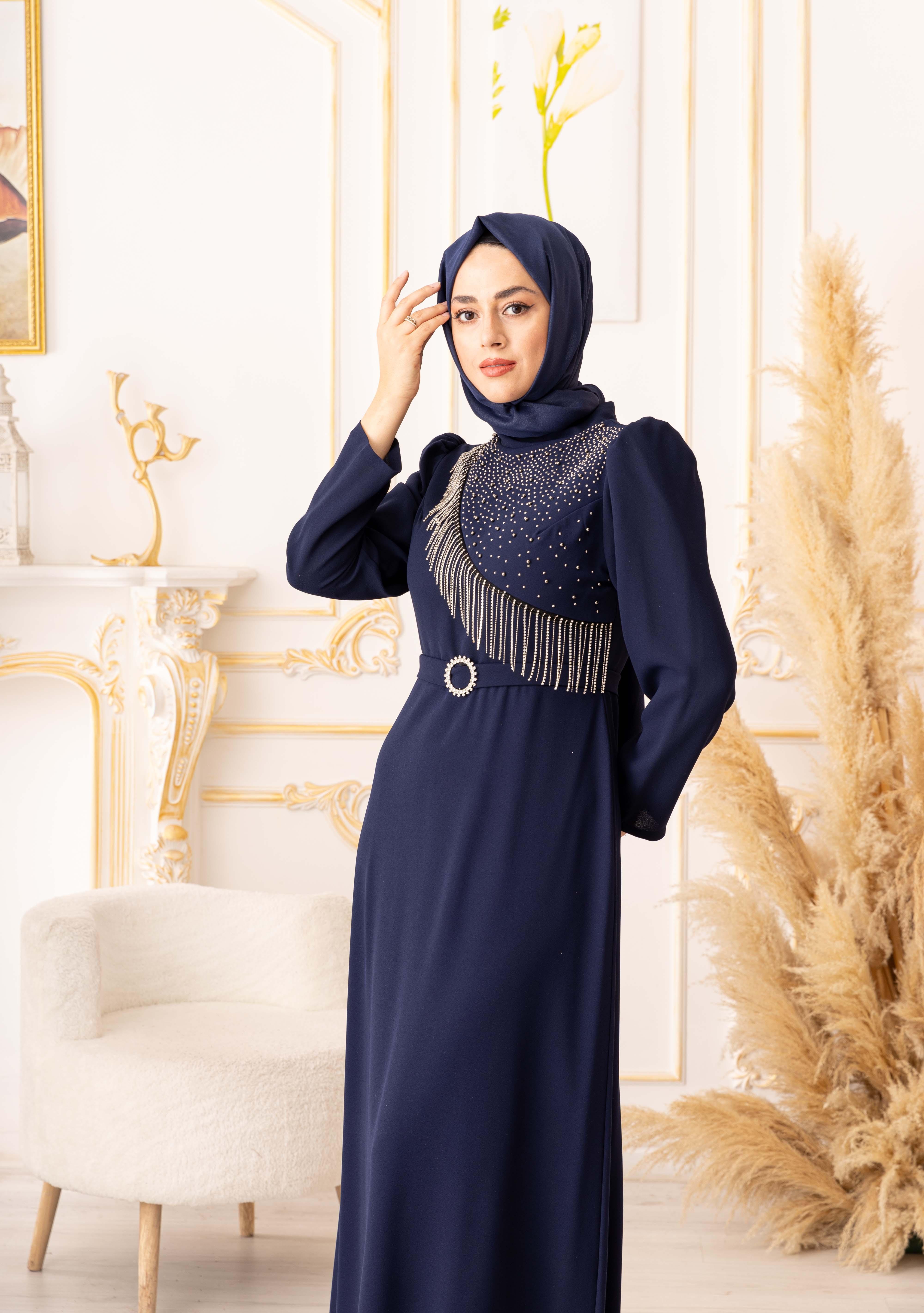GÖĞÜS KISMI TAŞ VE ZİNCİR DETAYLI KREP TESETTÜR ABİYE (K1090), bütün özel gece ve davetlerinizde size eşlik edecek. İster düğün, ister nişan, ister mezuniyet gibi özel günlerde tercih edebilir, isterseniz de özel davetlere katıldığınızda şıklığınızla göz kamaştırabilirsiniz. Üstelik bu abiye, göğüs bölgesindeki ayrıntılar sayesinde şal kullanımını da rahat bir hale getirerek tesettürlü hanımların tercih sebebi olmuştur.