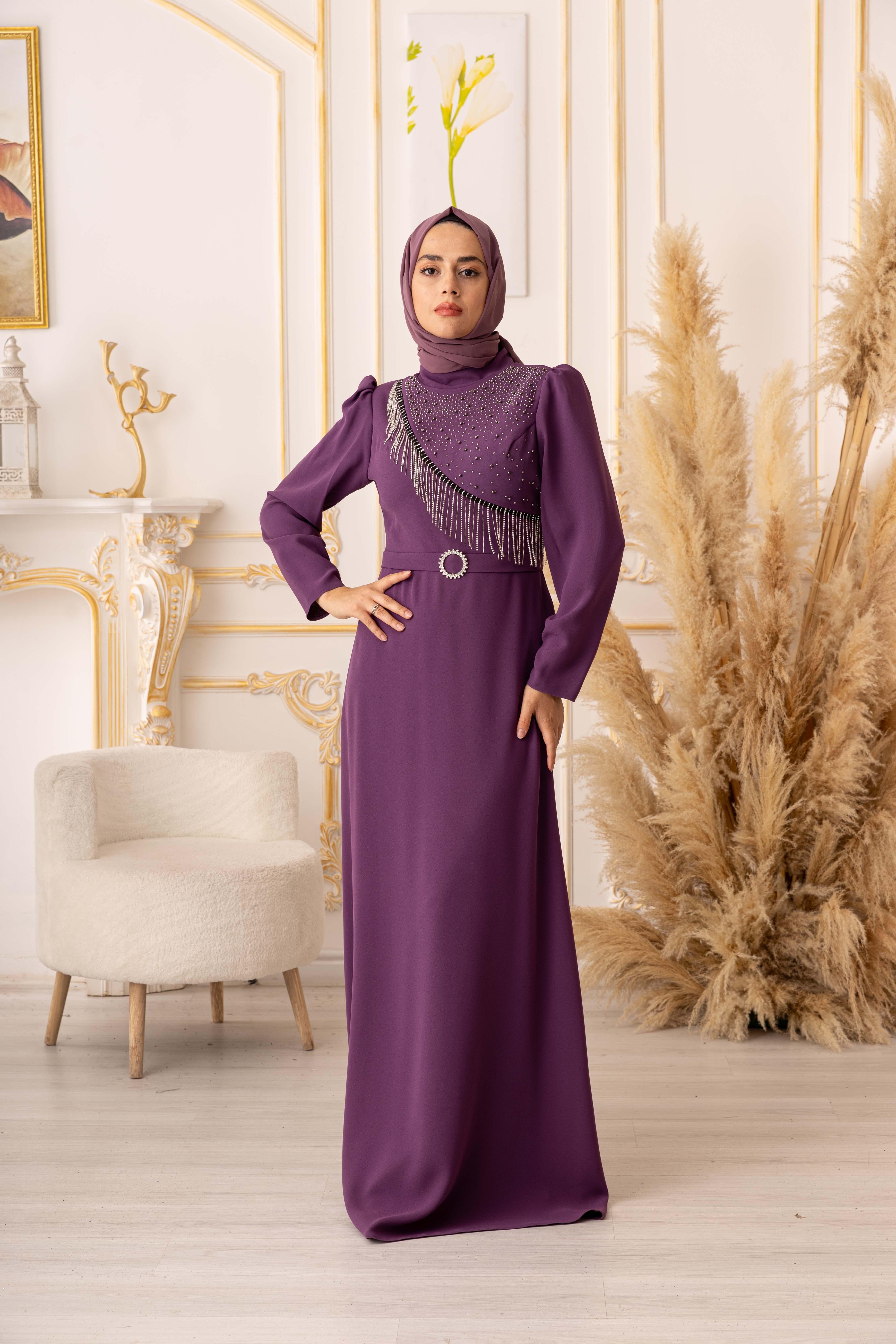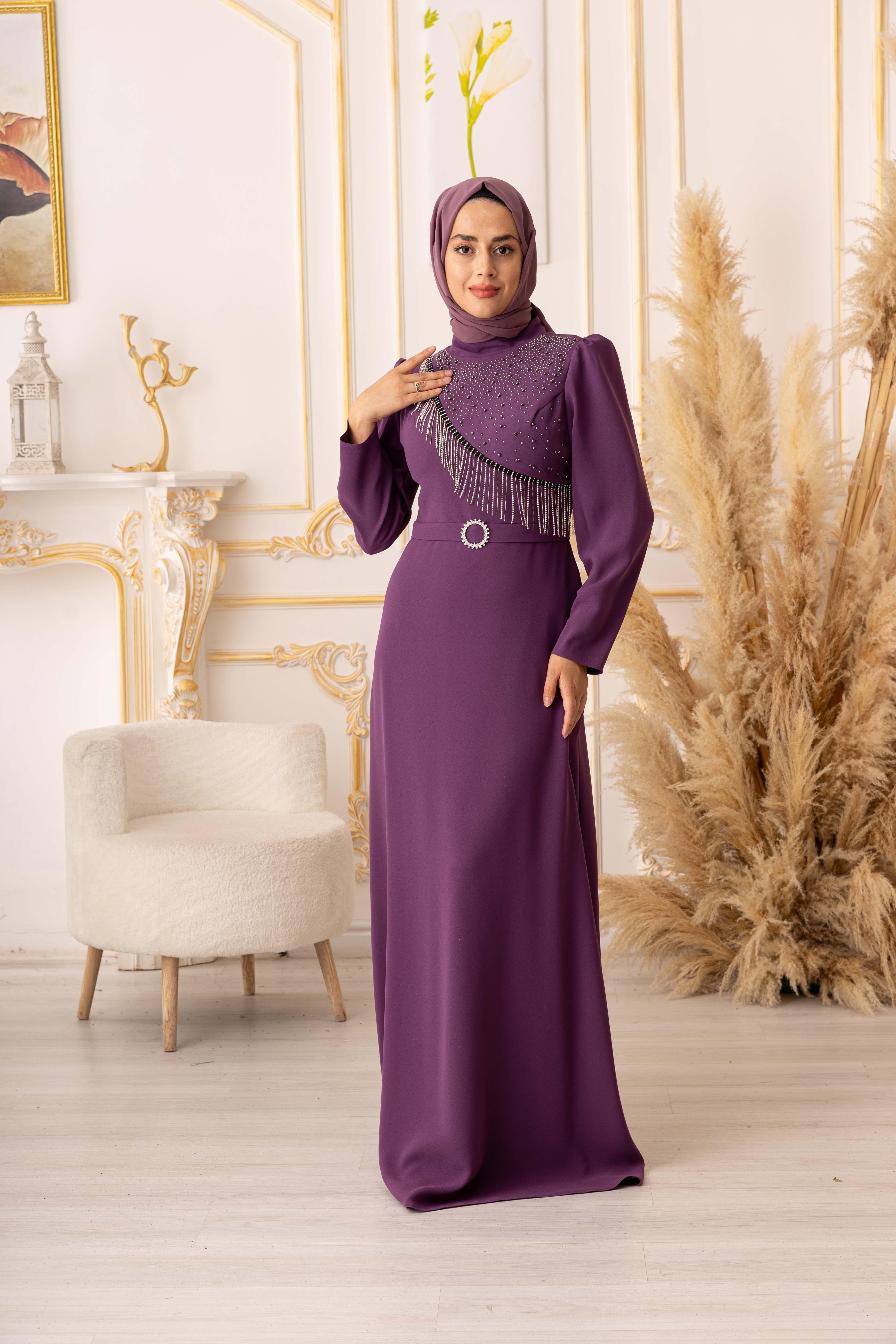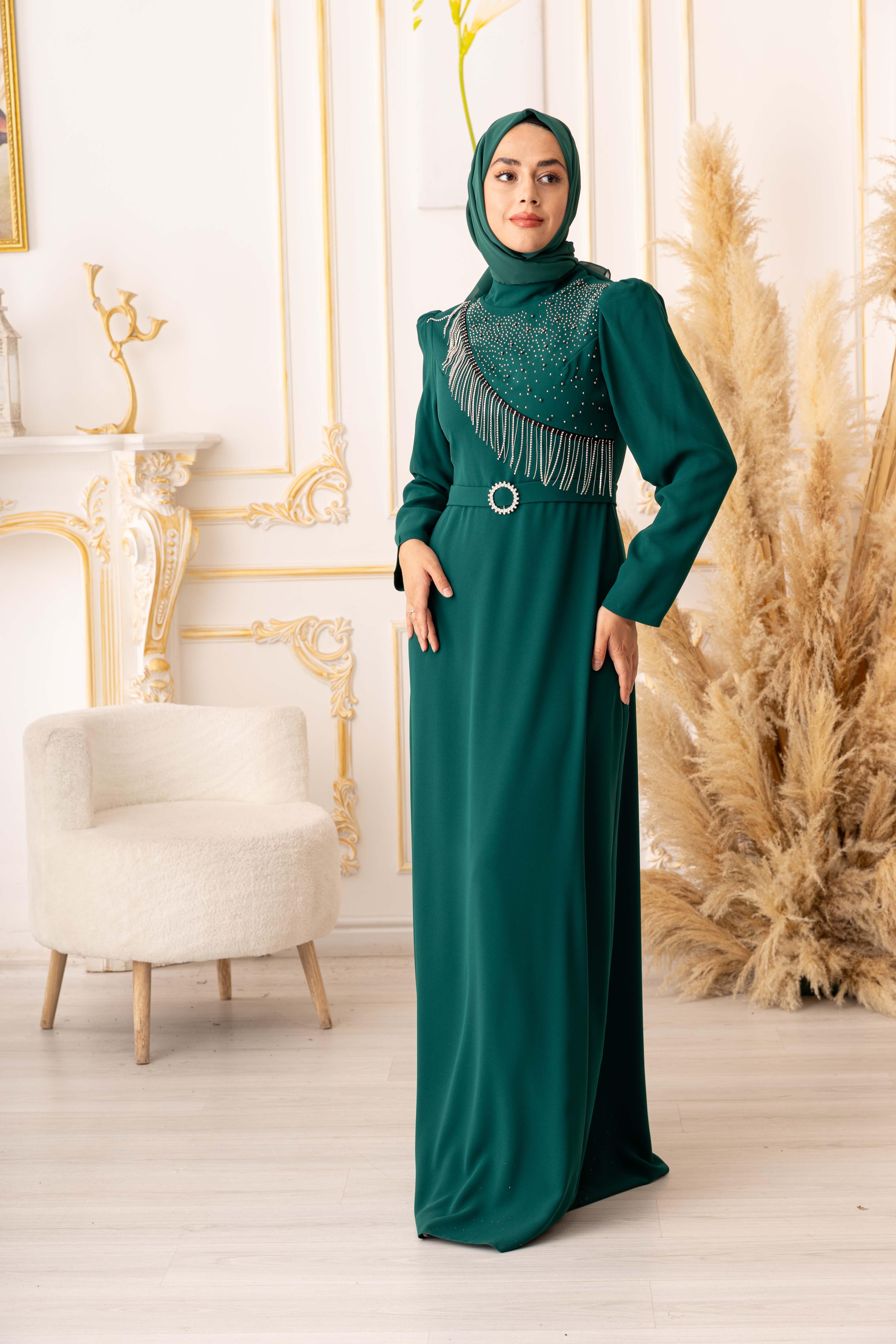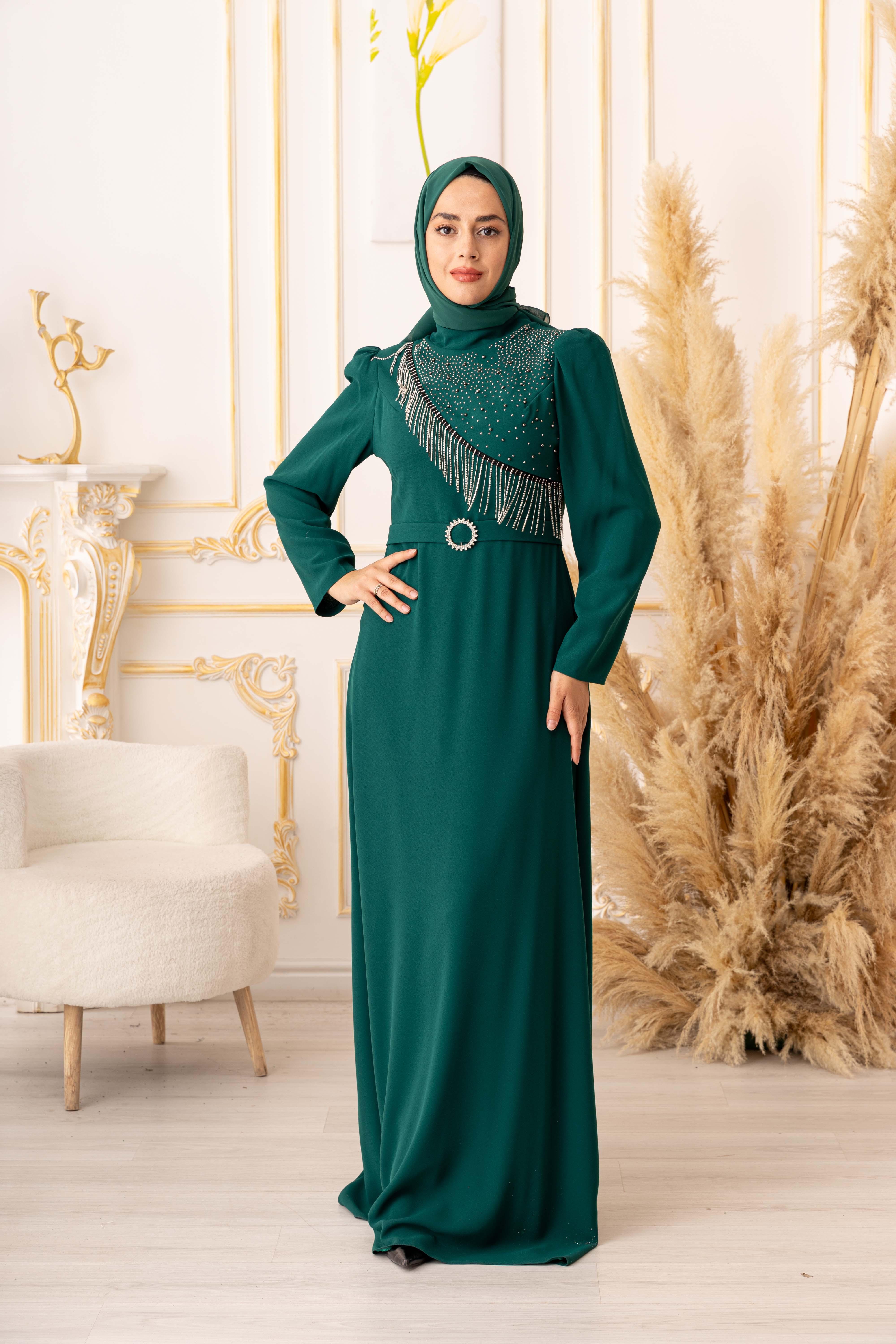 GÖĞÜS KISMI TAŞ VE ZİNCİR DETAYLI KREP TESETTÜR ABİYE (K1090), bütün özel gece ve davetlerinizde size eşlik edecek. İster düğün, ister nişan, ister mezuniyet gibi özel günlerde tercih edebilir, isterseniz de özel davetlere katıldığınızda şıklığınızla göz kamaştırabilirsiniz. Üstelik bu abiye, göğüs bölgesindeki ayrıntılar sayesinde şal kullanımını da rahat bir hale getirerek tesettürlü hanımların tercih sebebi olmuştur.