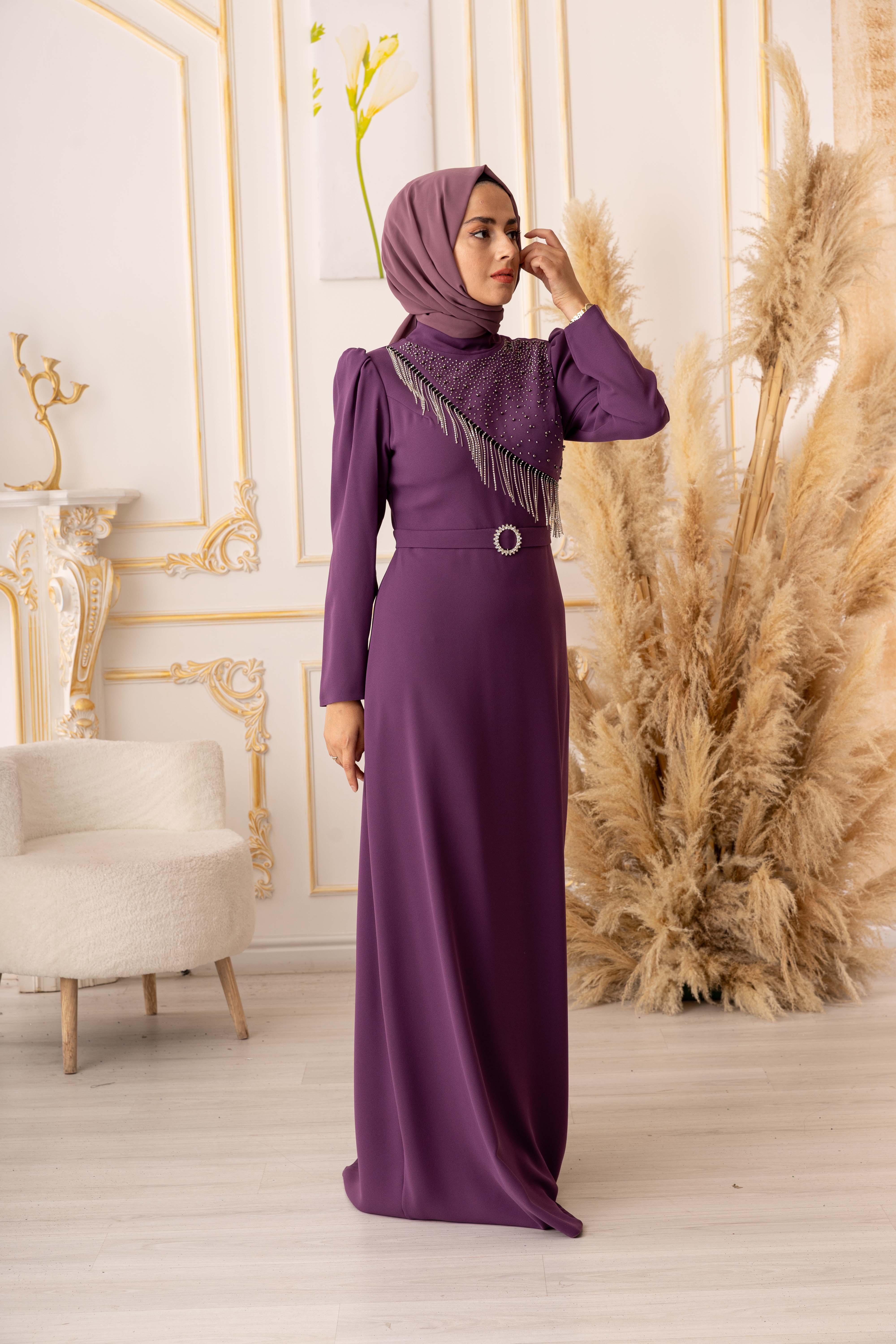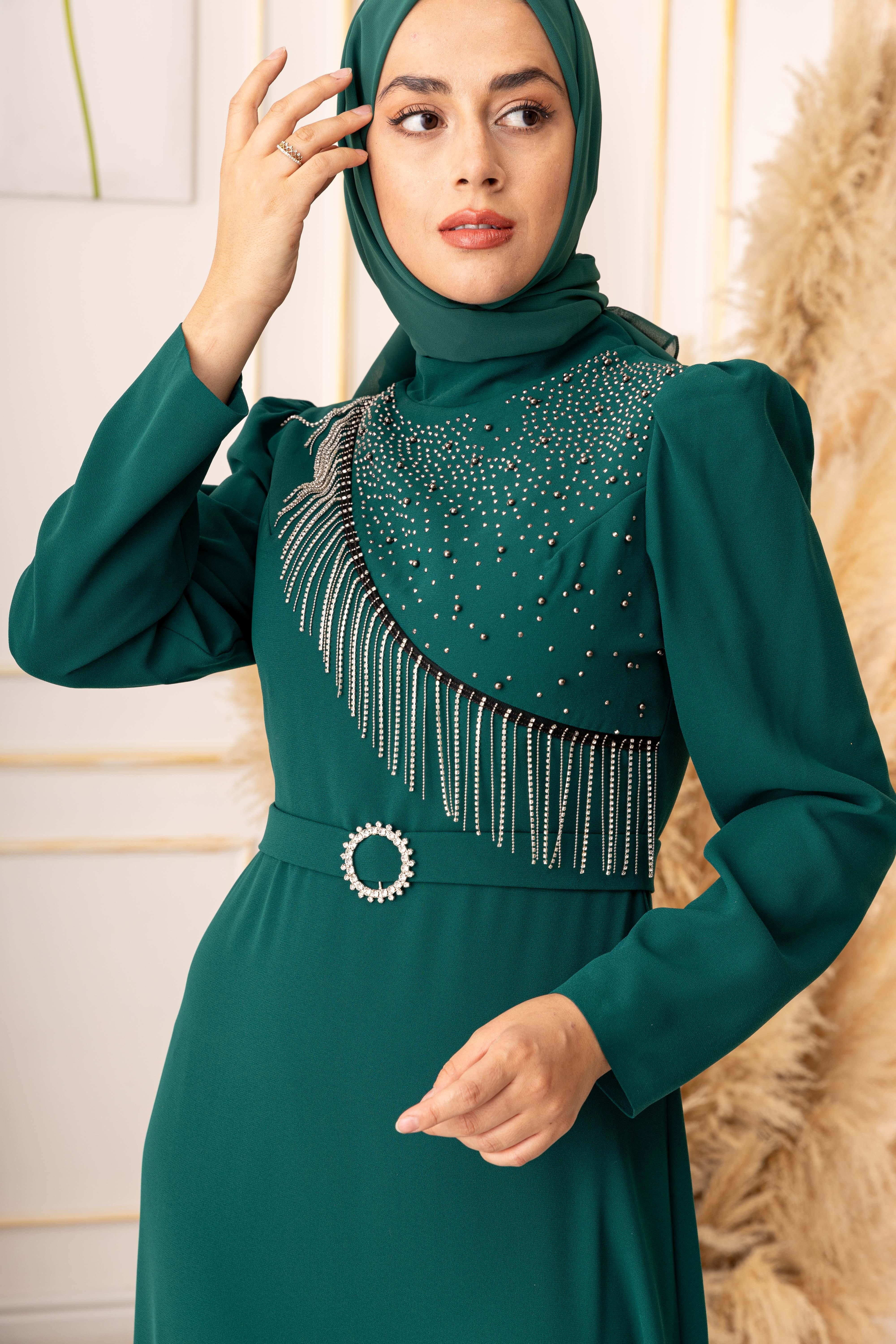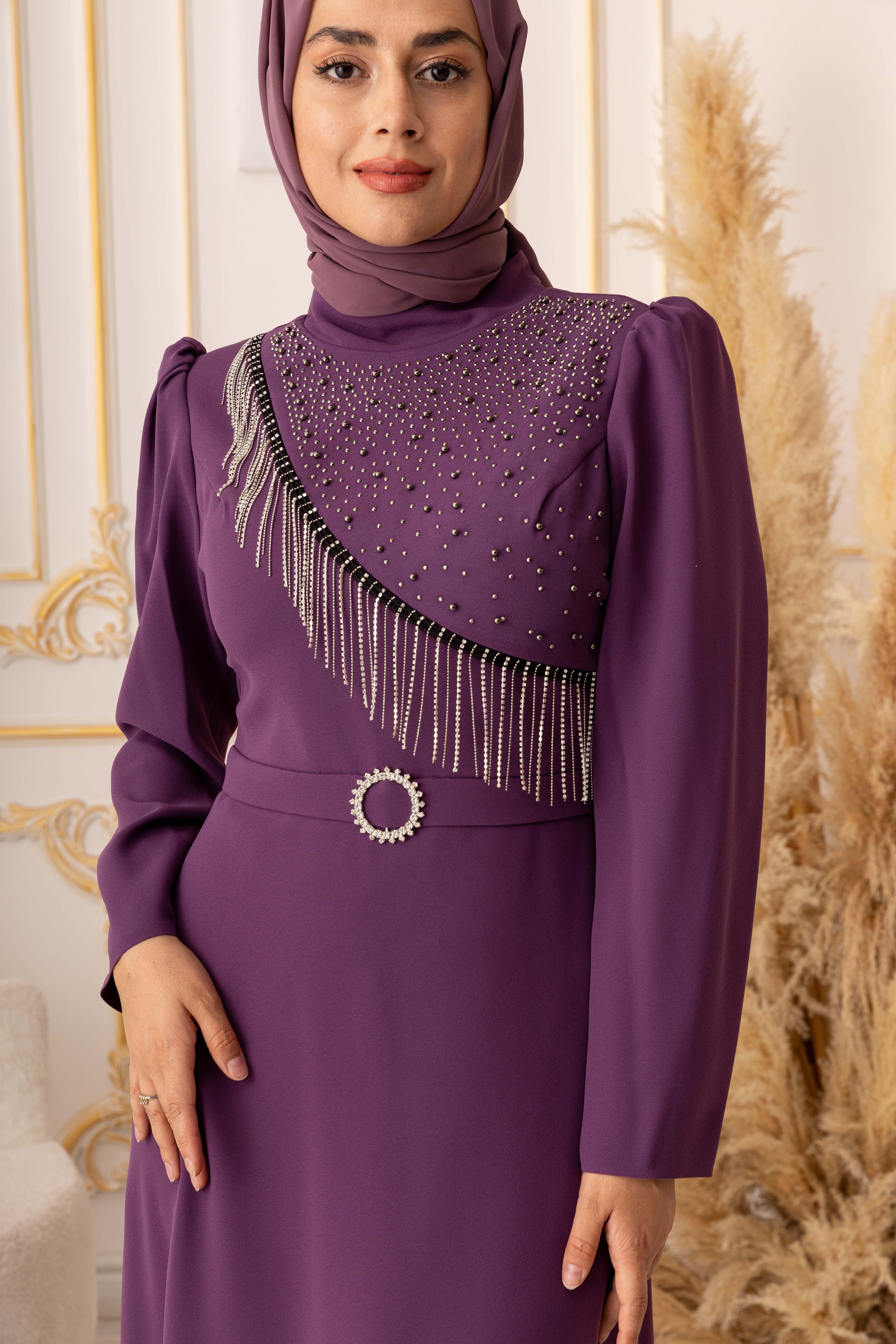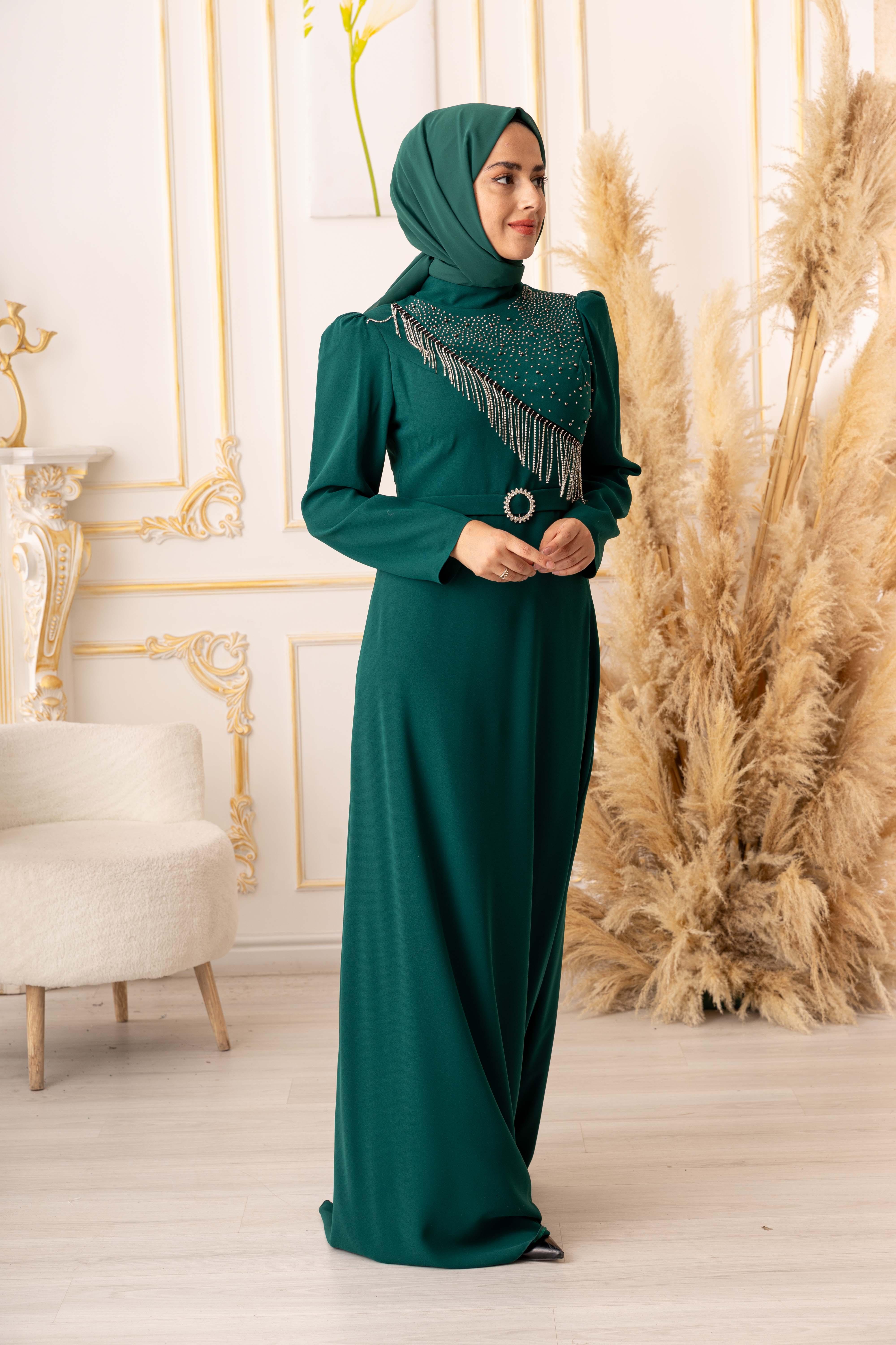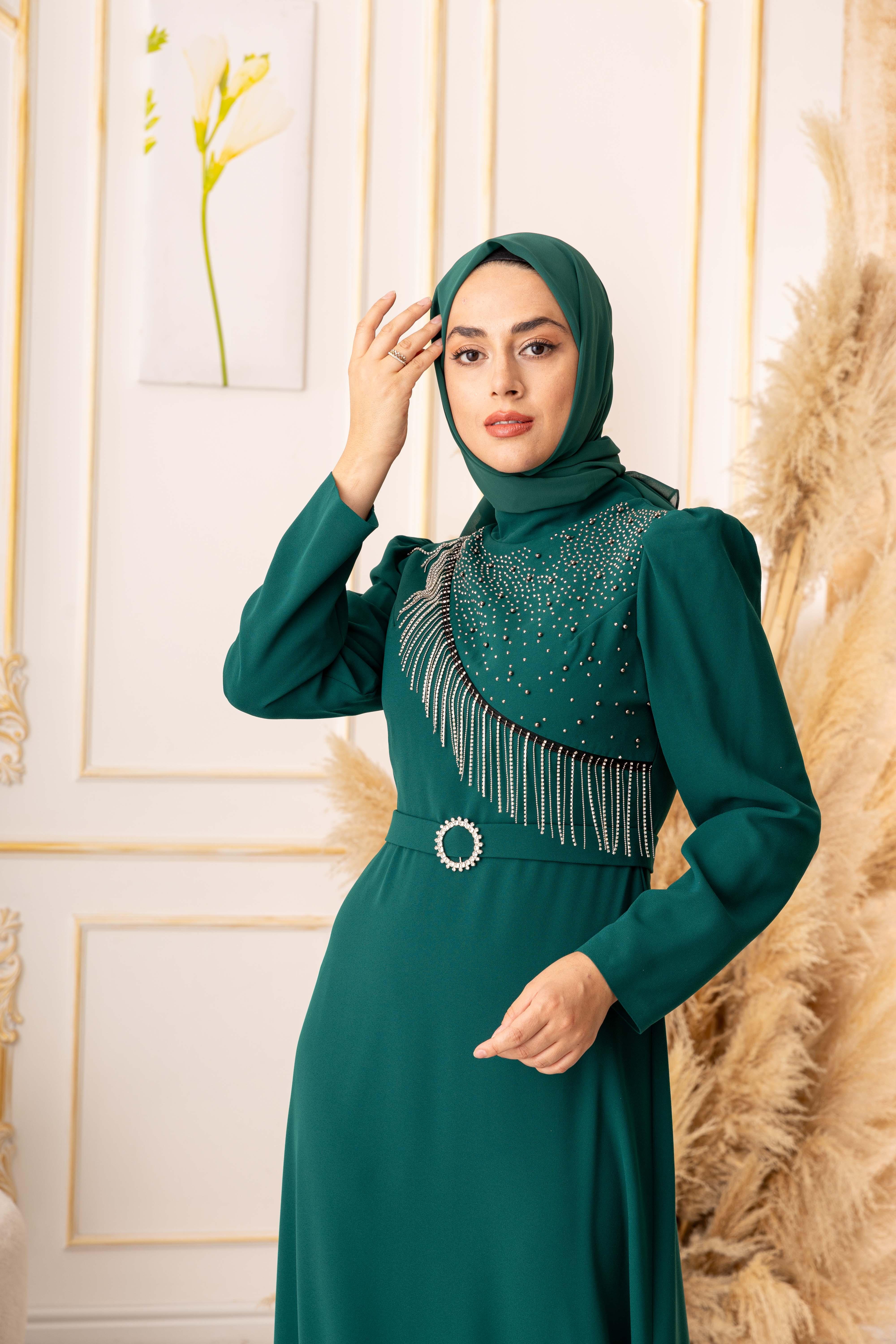 GÖĞÜS KISMI TAŞ VE ZİNCİR DETAYLI KREP TESETTÜR ABİYE (K1090), bütün özel gece ve davetlerinizde size eşlik edecek. İster düğün, ister nişan, ister mezuniyet gibi özel günlerde tercih edebilir, isterseniz de özel davetlere katıldığınızda şıklığınızla göz kamaştırabilirsiniz. Üstelik bu abiye, göğüs bölgesindeki ayrıntılar sayesinde şal kullanımını da rahat bir hale getirerek tesettürlü hanımların tercih sebebi olmuştur.