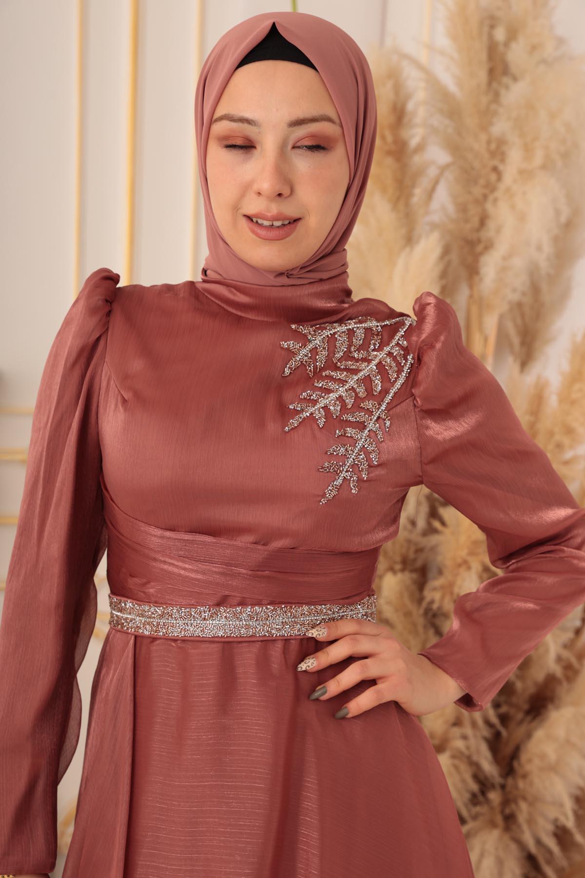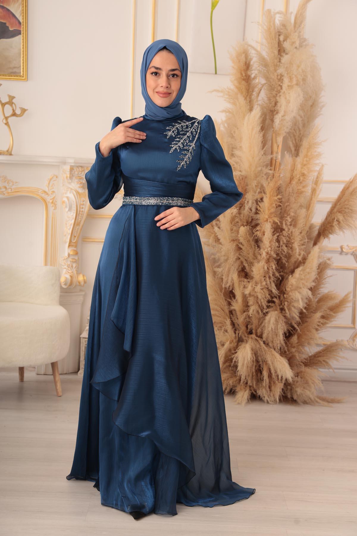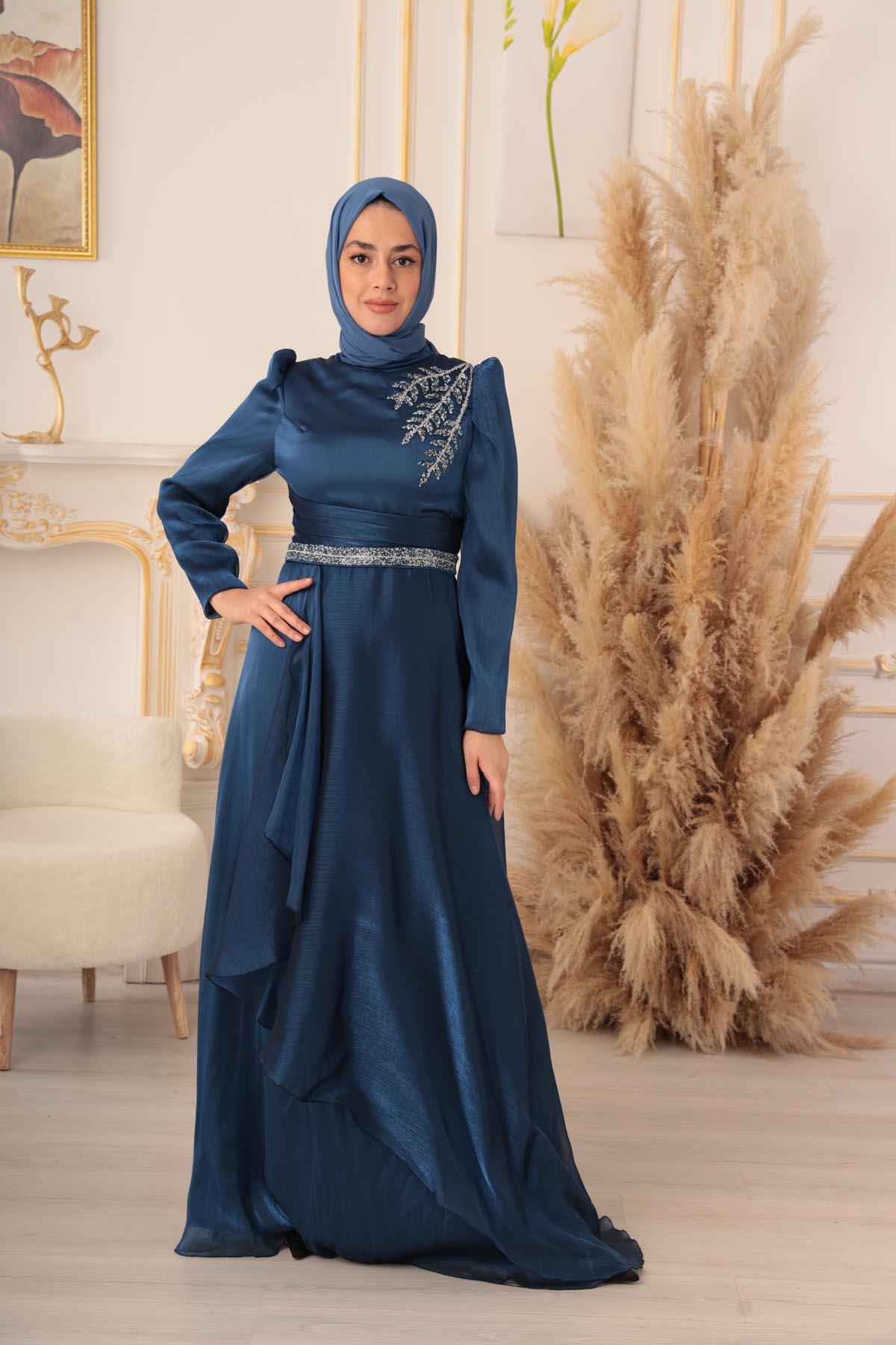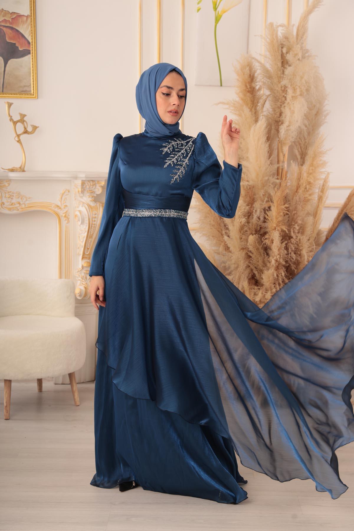Göğüs kısmında yer alan detaylı işlemeler, abiye elbisenin en dikkat çekici özelliklerinden biri. Parlak taşlar ile süslenmiş olan bu detaylar, abiye elbiseye ayrı bir zarafet katıyor. Üst kısmında bulunan dik yaka detayı ise, şık bir görünüme sahip olmanızı sağlıyor. Ayrıca abiye elbisenin tasarımında kullanılan bu detaylar, tesettürlü kadınların gönül rahatlığıyla giyebilecekleri tarzda dizayn edilmiştir.