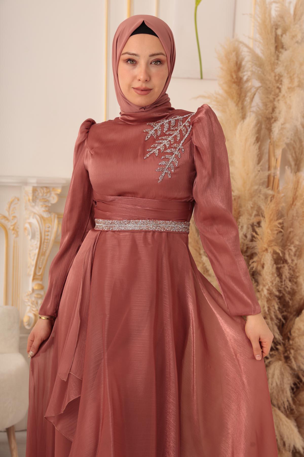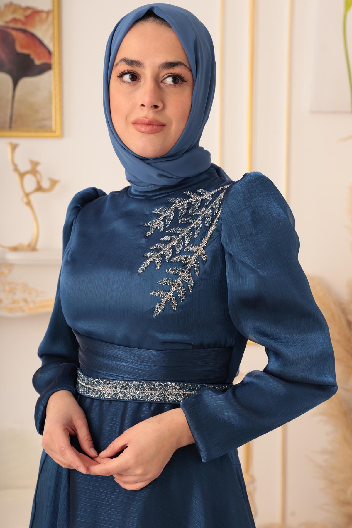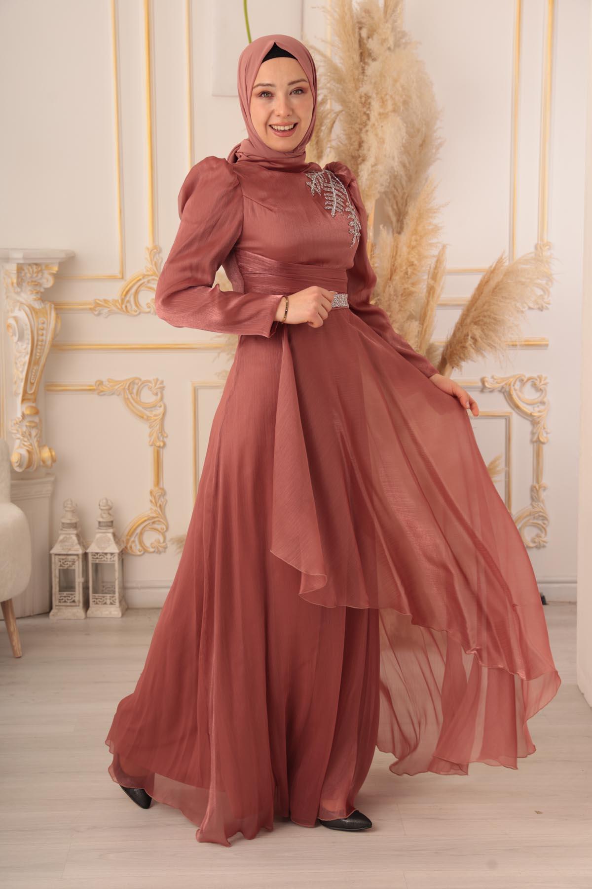 Göğüs kısmında yer alan detaylı işlemeler, abiye elbisenin en dikkat çekici özelliklerinden biri. Parlak taşlar ile süslenmiş olan bu detaylar, abiye elbiseye ayrı bir zarafet katıyor. Üst kısmında bulunan dik yaka detayı ise, şık bir görünüme sahip olmanızı sağlıyor. Ayrıca abiye elbisenin tasarımında kullanılan bu detaylar, tesettürlü kadınların gönül rahatlığıyla giyebilecekleri tarzda dizayn edilmiştir.
