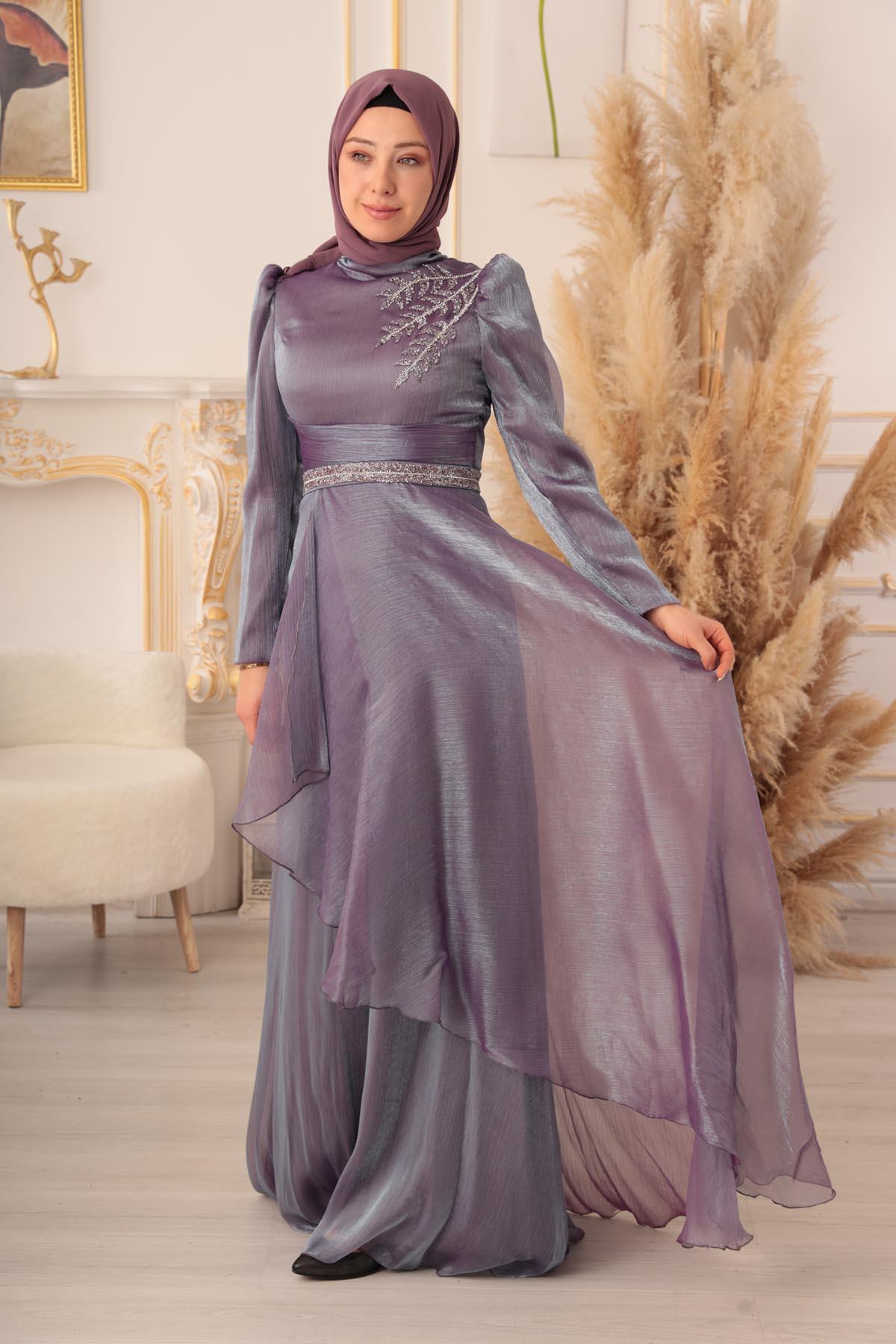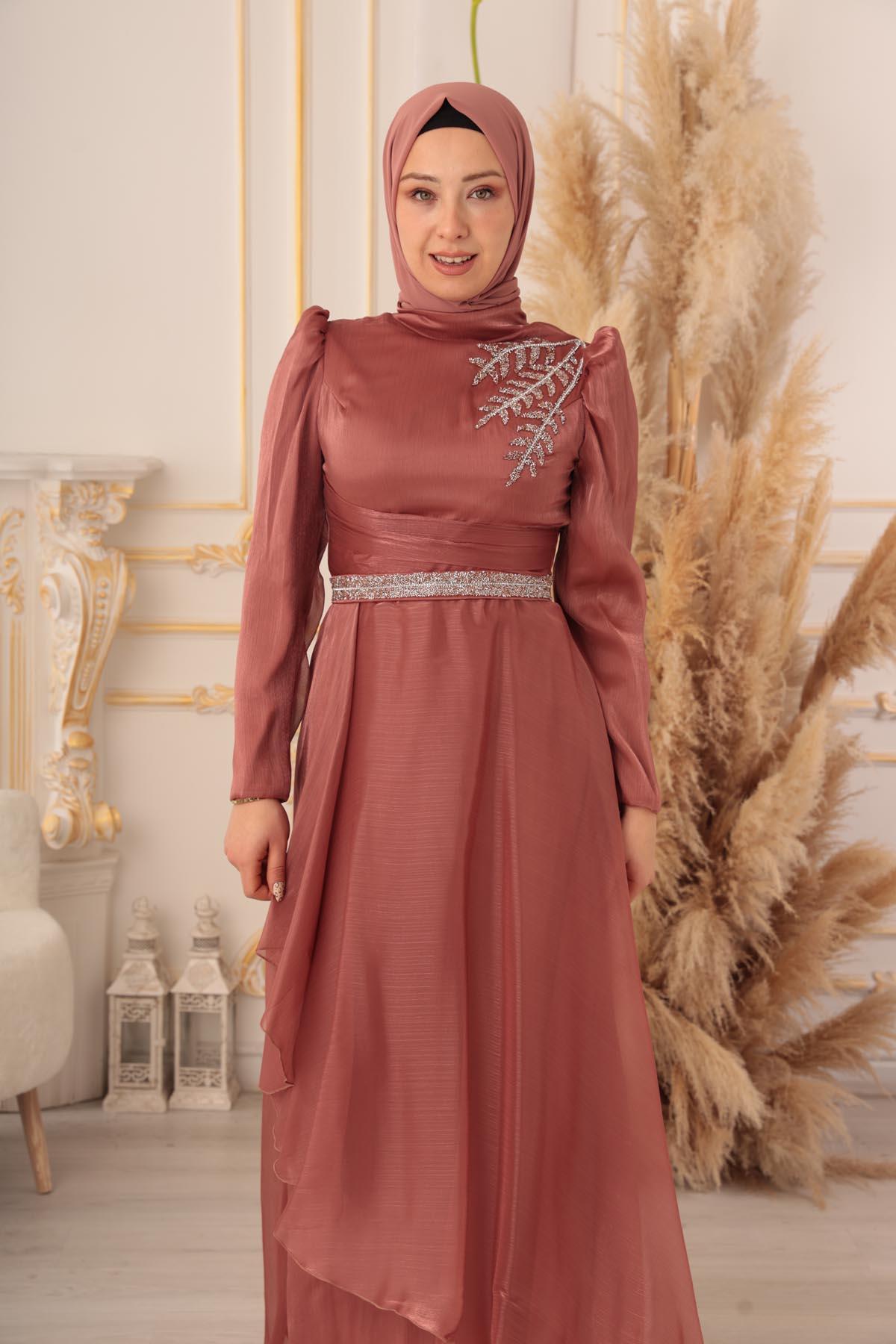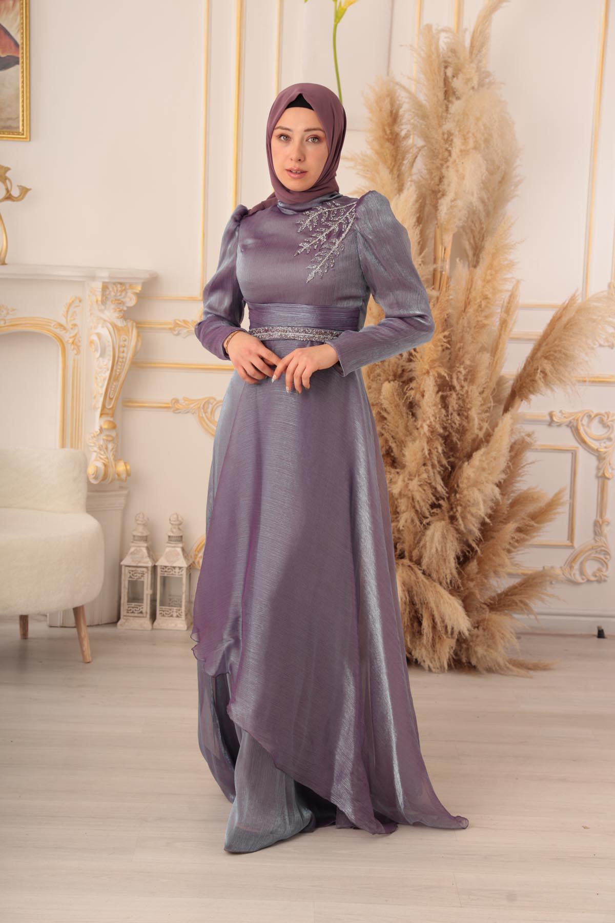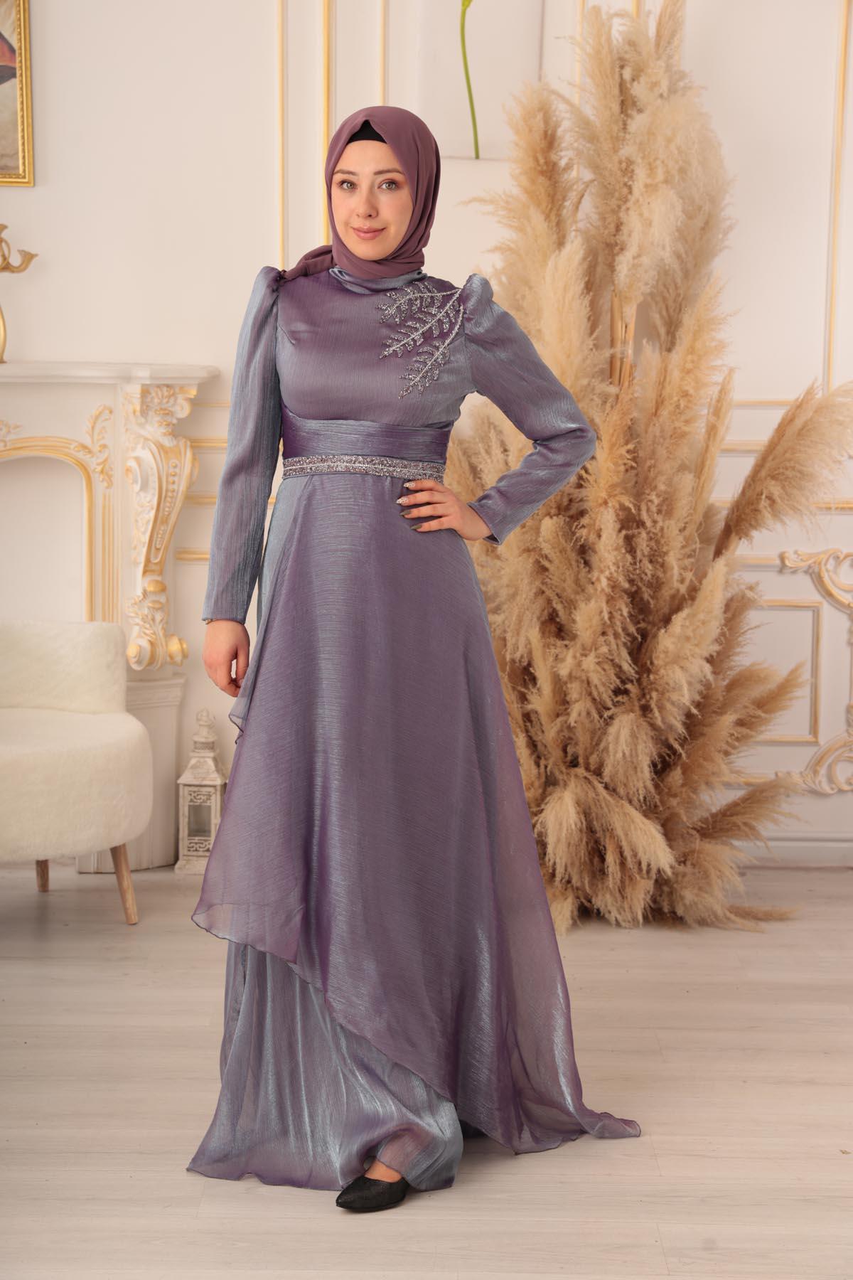 Göğüs kısmında yer alan detaylı işlemeler, abiye elbisenin en dikkat çekici özelliklerinden biri. Parlak taşlar ile süslenmiş olan bu detaylar, abiye elbiseye ayrı bir zarafet katıyor. Üst kısmında bulunan dik yaka detayı ise, şık bir görünüme sahip olmanızı sağlıyor. Ayrıca abiye elbisenin tasarımında kullanılan bu detaylar, tesettürlü kadınların gönül rahatlığıyla giyebilecekleri tarzda dizayn edilmiştir.