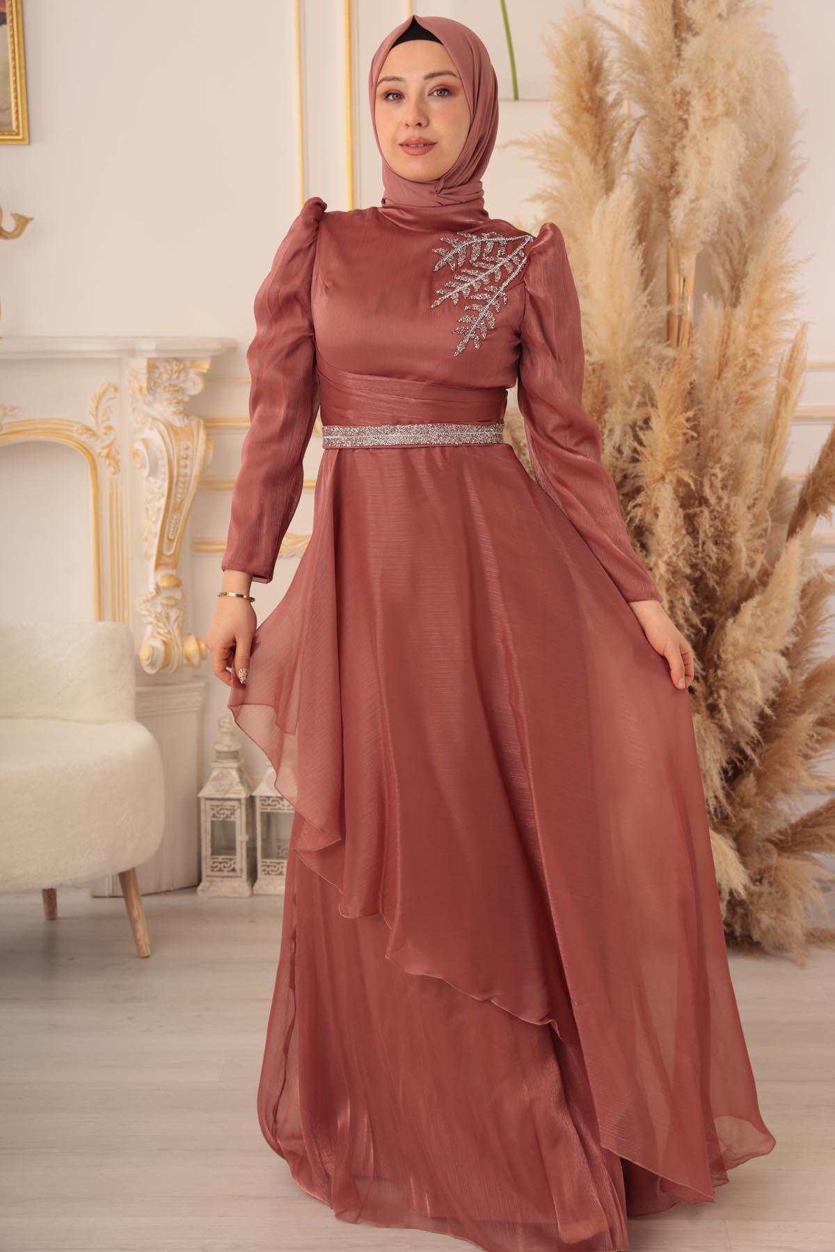 Etek kısmında yer alan kat kat tül detayı da, Göğüs ve Kemeri Parıltılı Tesettür Abiye'ye ayrı bir hava katıyor. Tül, elbisenin hareketli ve zarif bir görünüme sahip olmasını sağlarken, aynı zamanda hem rahat hem de asil bir duruş sergiliyor.