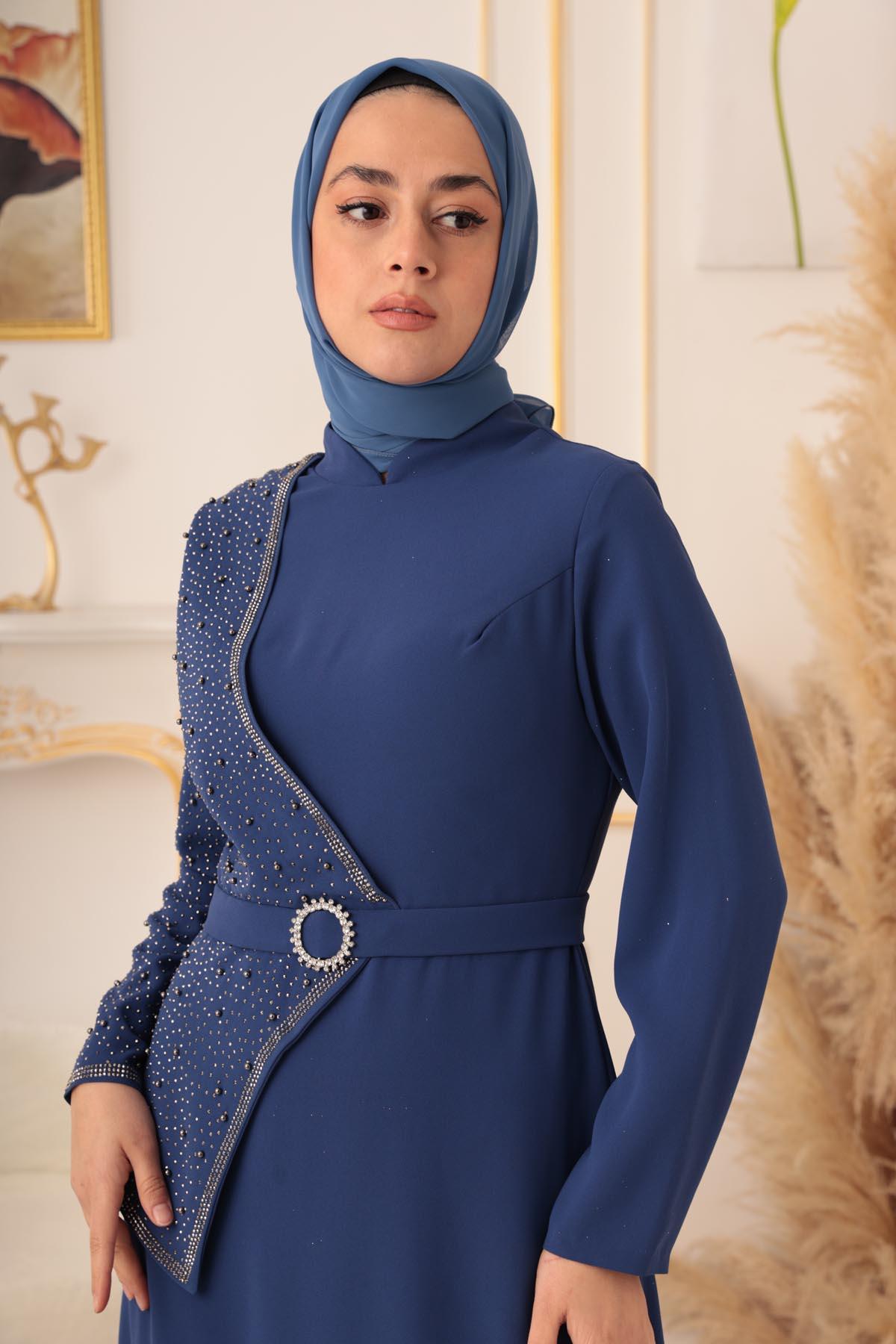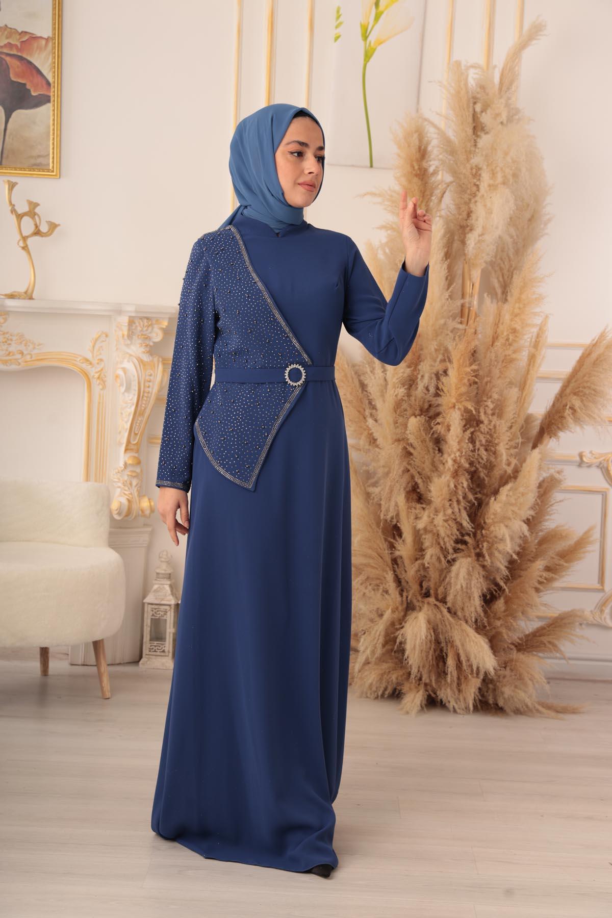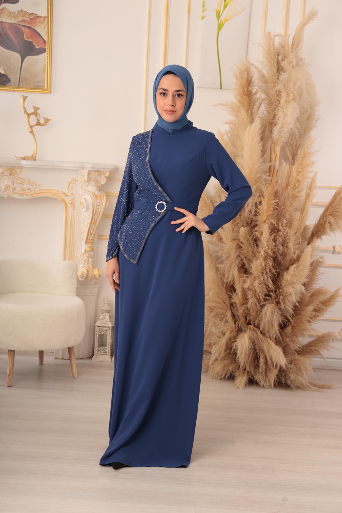 İnci ve Taş Detaylı Yarım Kapaklı Tesettür Abiye (K1130), zarif ve şık tasarımıyla göz kamaştıran bir abiye elbise modelidir. Bu muhteşem abiye elbise, Tesettür giyim konusunda son trendleri yakalayarak tesettürlü kadınların en özel gecelerde şıklıklarını tamamlamak için özel olarak tasarlanmıştır.