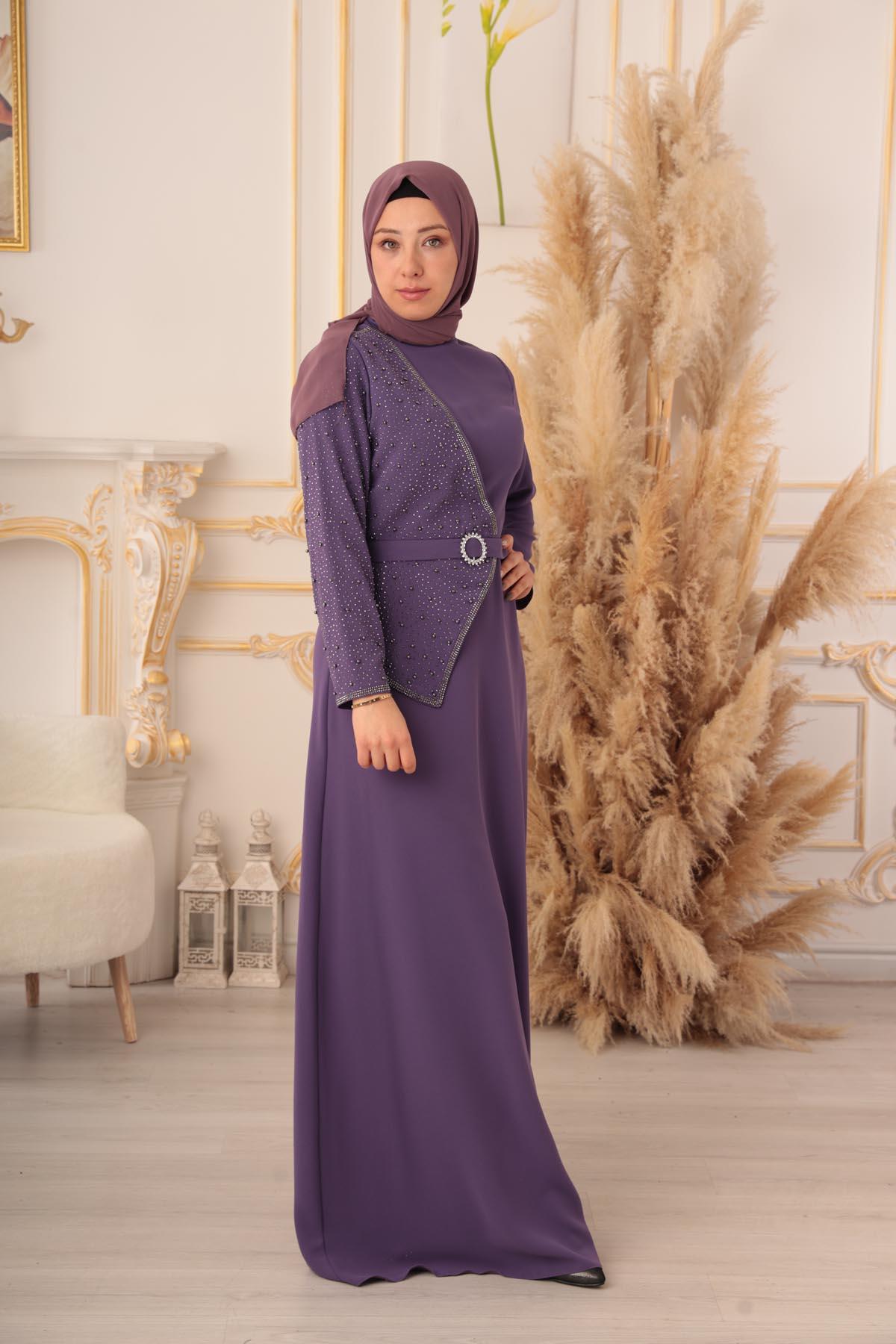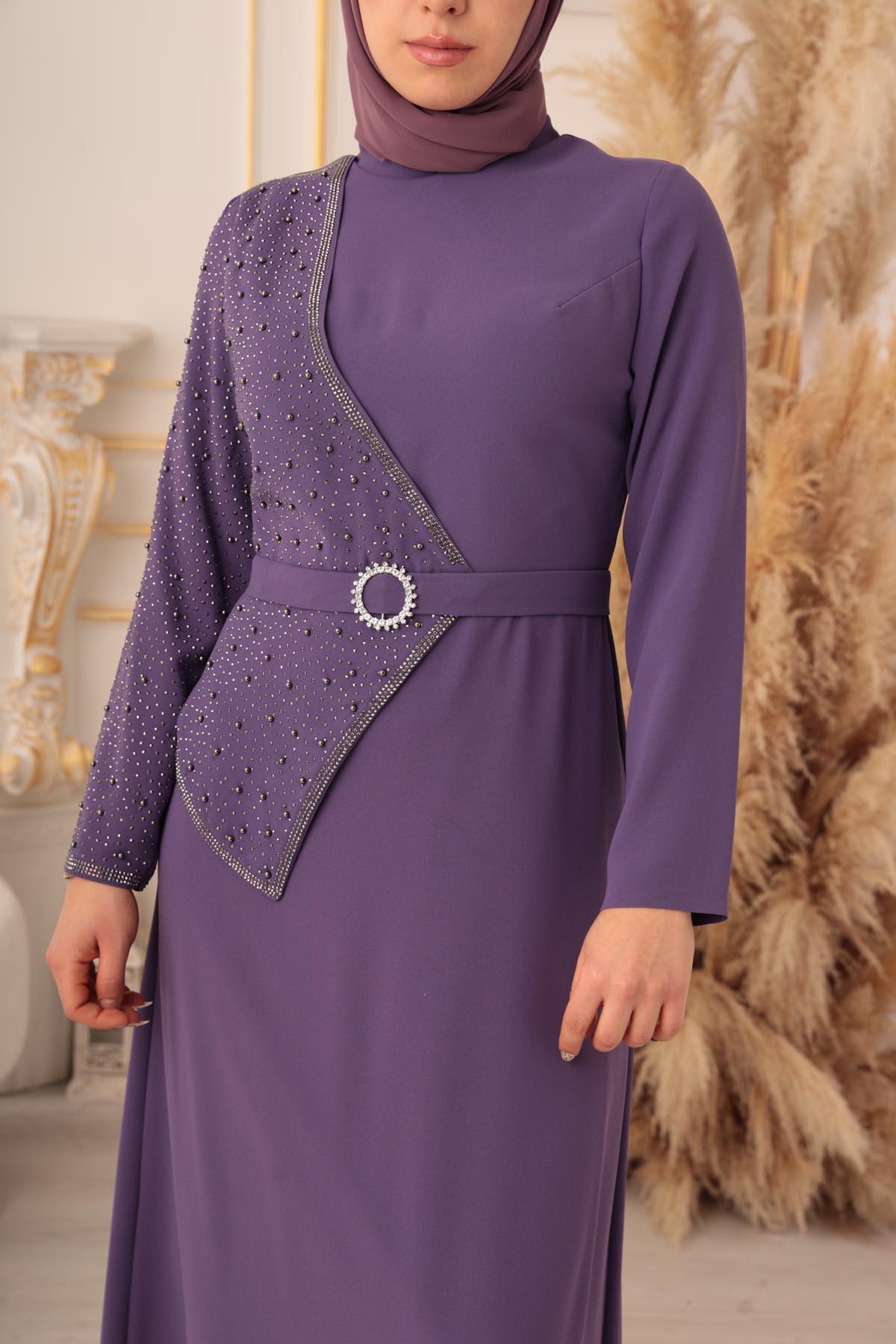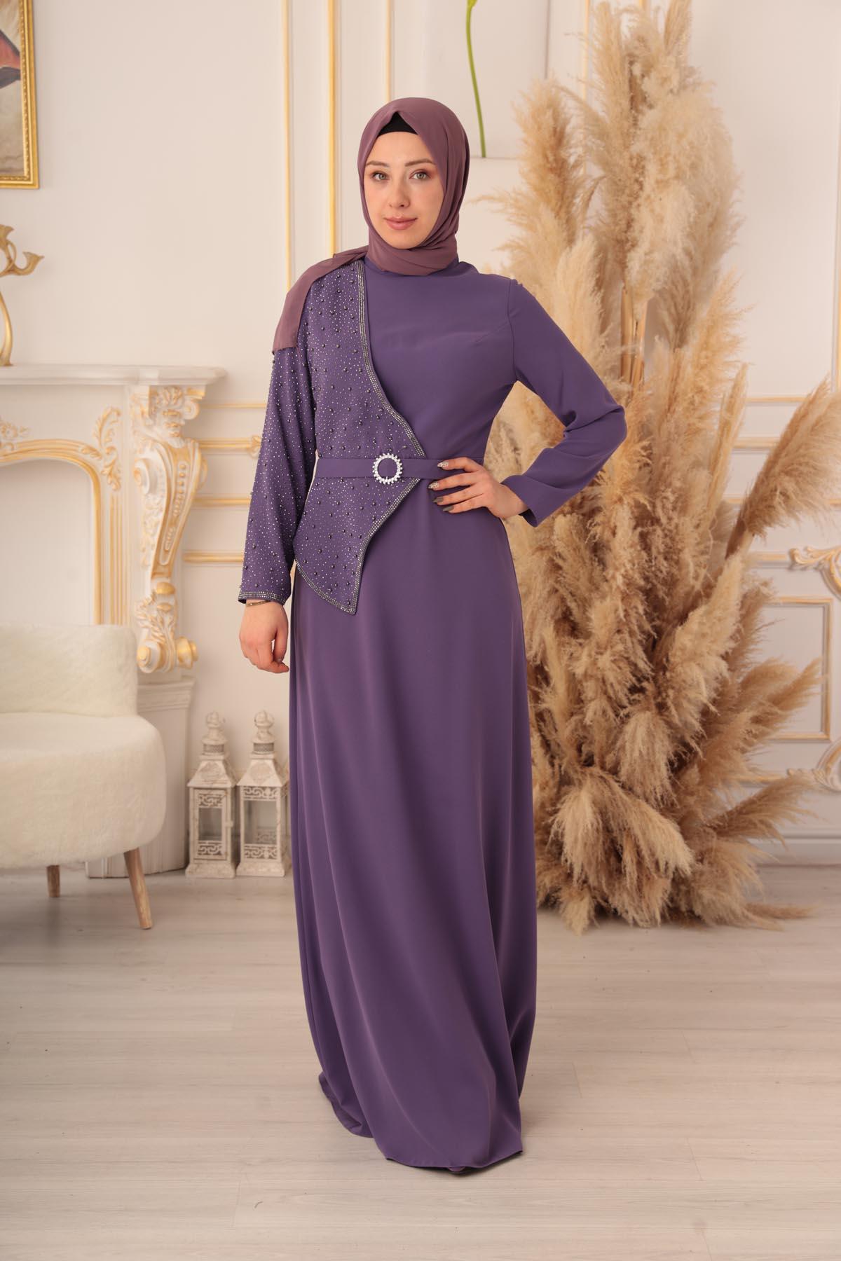 İnci ve Taş Detaylı Yarım Kapaklı Tesettür Abiye (K1130), zarif ve şık tasarımıyla göz kamaştıran bir abiye elbise modelidir. Bu muhteşem abiye elbise, Tesettür giyim konusunda son trendleri yakalayarak tesettürlü kadınların en özel gecelerde şıklıklarını tamamlamak için özel olarak tasarlanmıştır.