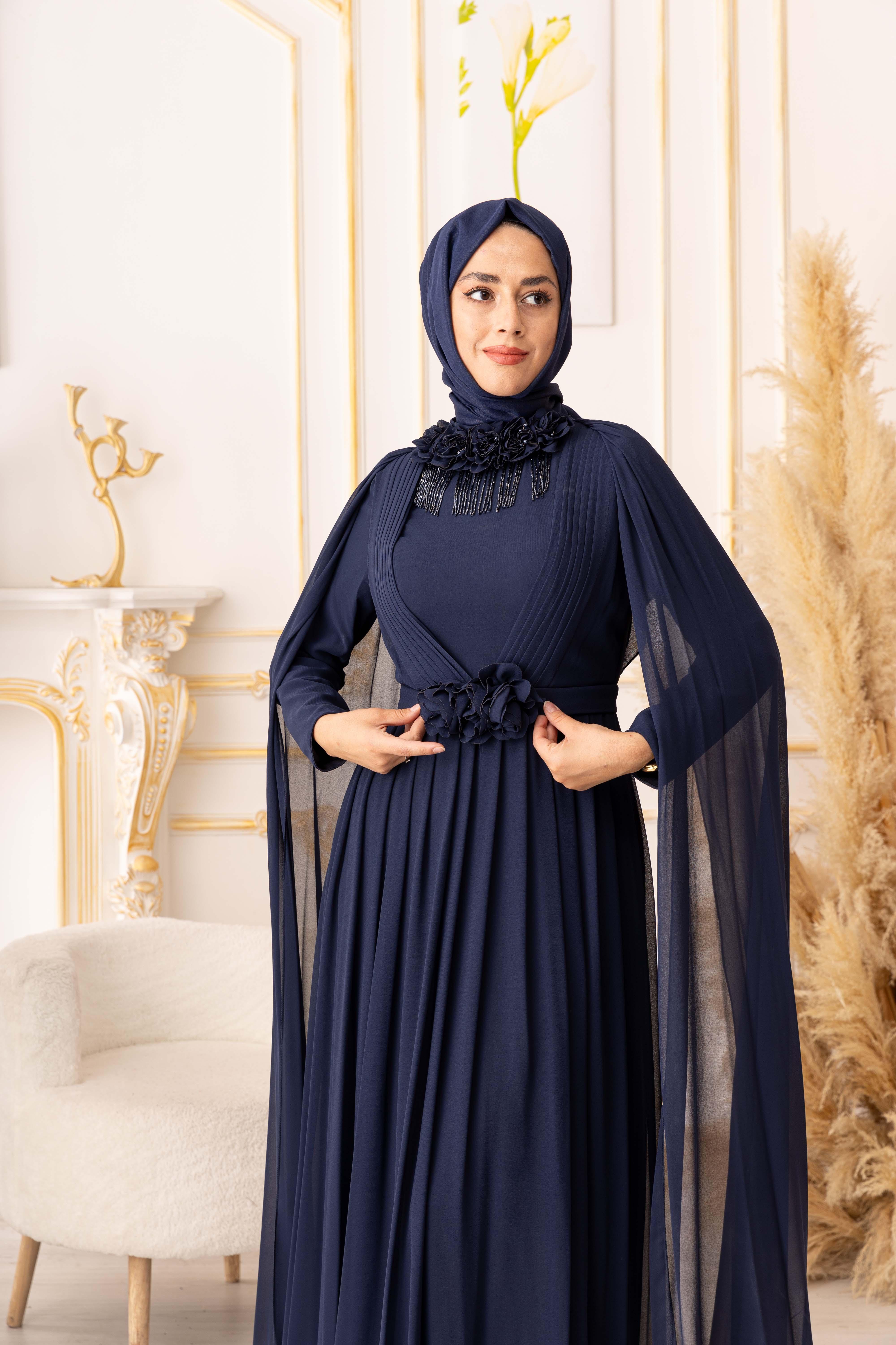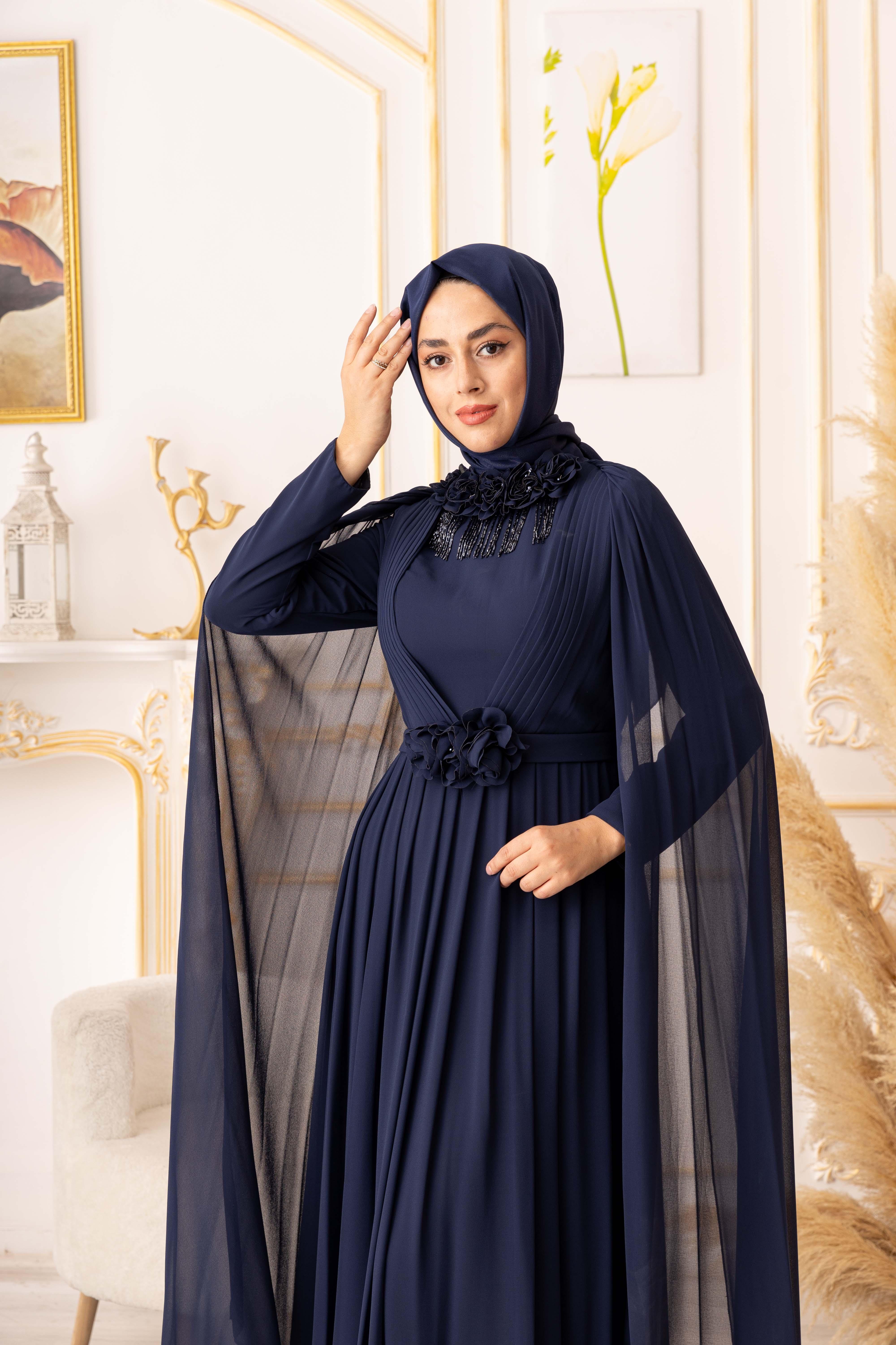 OMUZDAN PELERİNLİ ŞİFON KUMAŞ ÇİÇEK VE SALLANAN TAŞ DETAYLI TESETTÜR ABİYE (K13560), zarafeti ve şıklığı ile göz dolduran bir tesettür giyim ürünüdür. Özellikle özel gecelerde ya da davetlerde tercih edebileceğiniz bu abiye, tasarımıyla adeta göz kamaştırmaktadır.