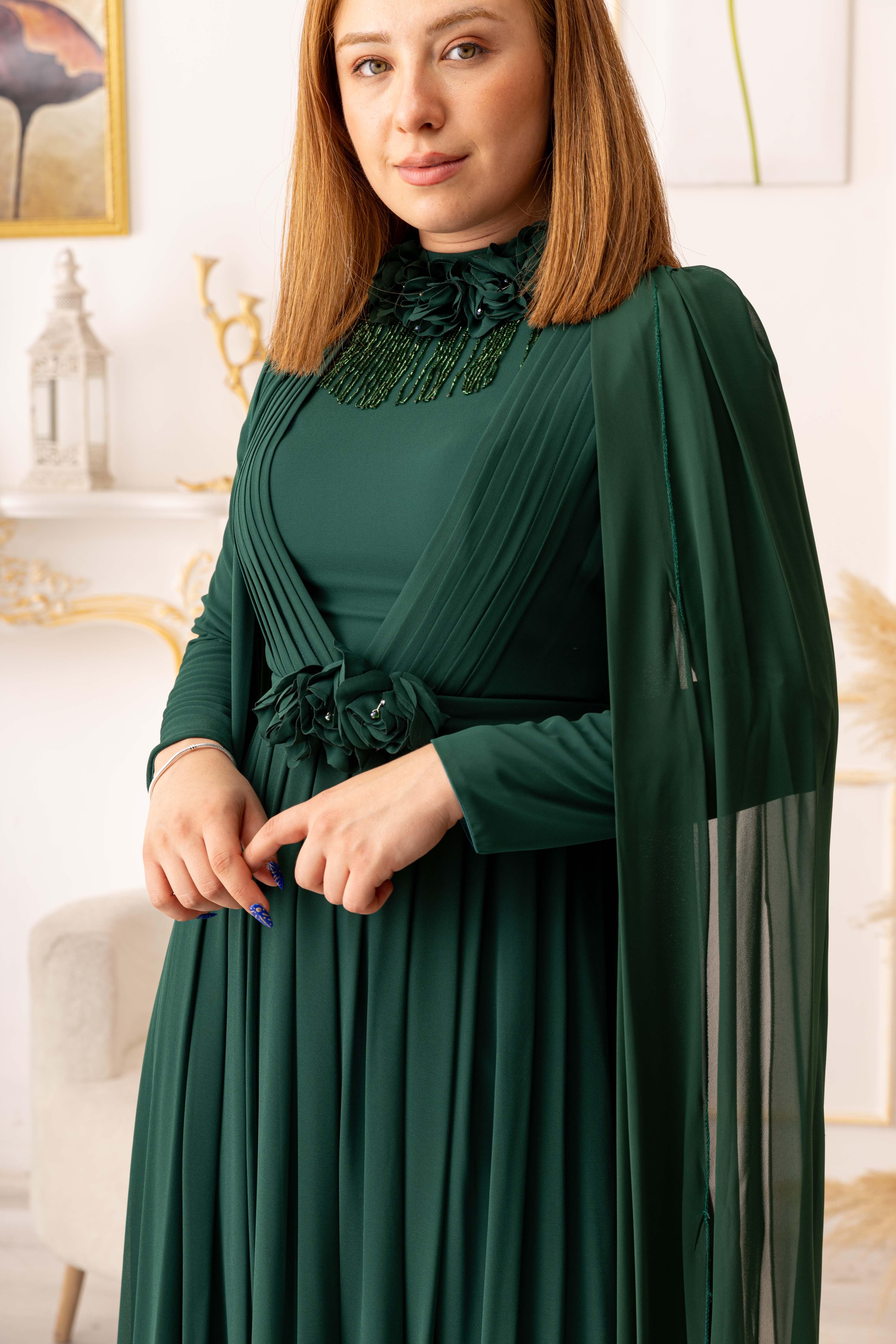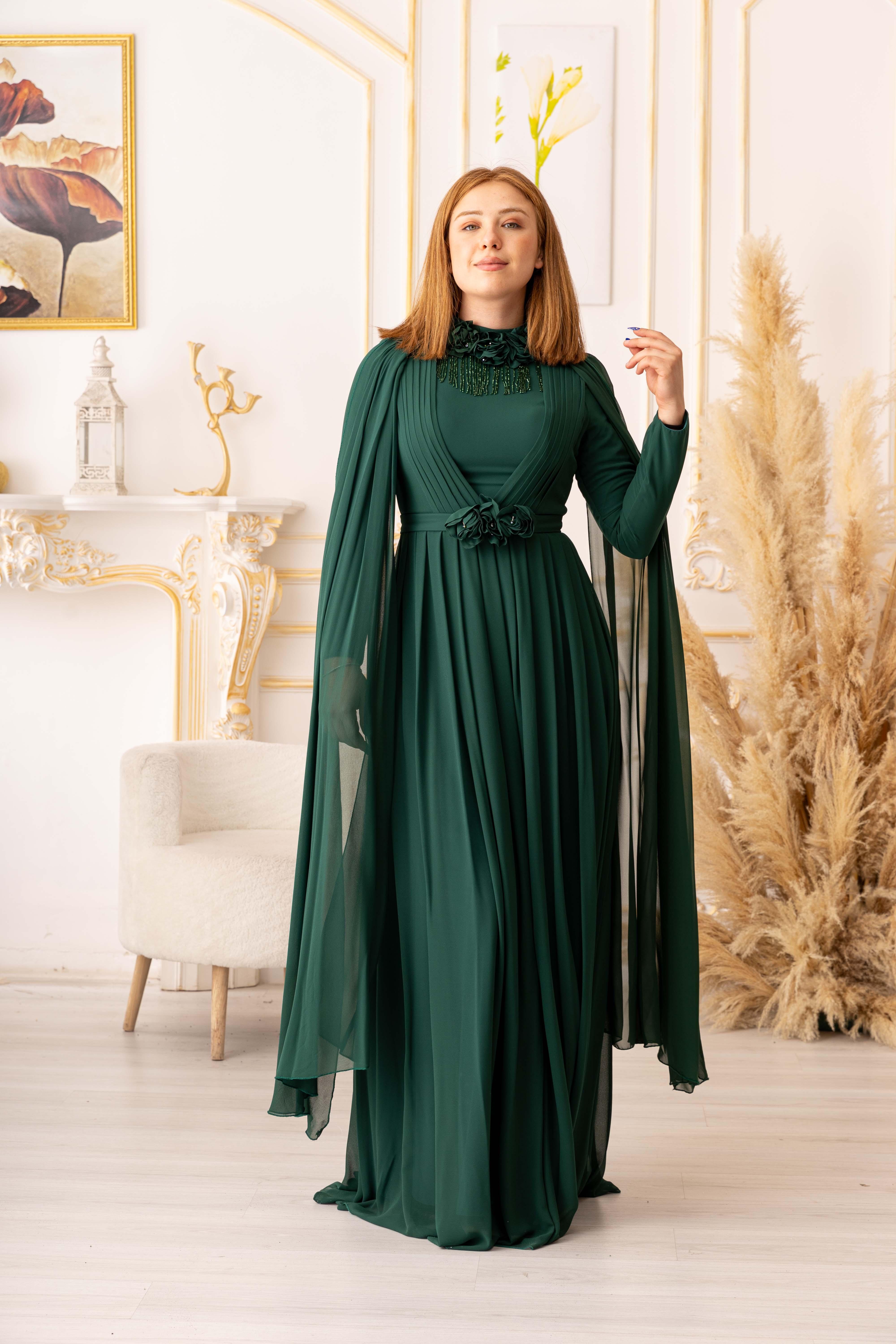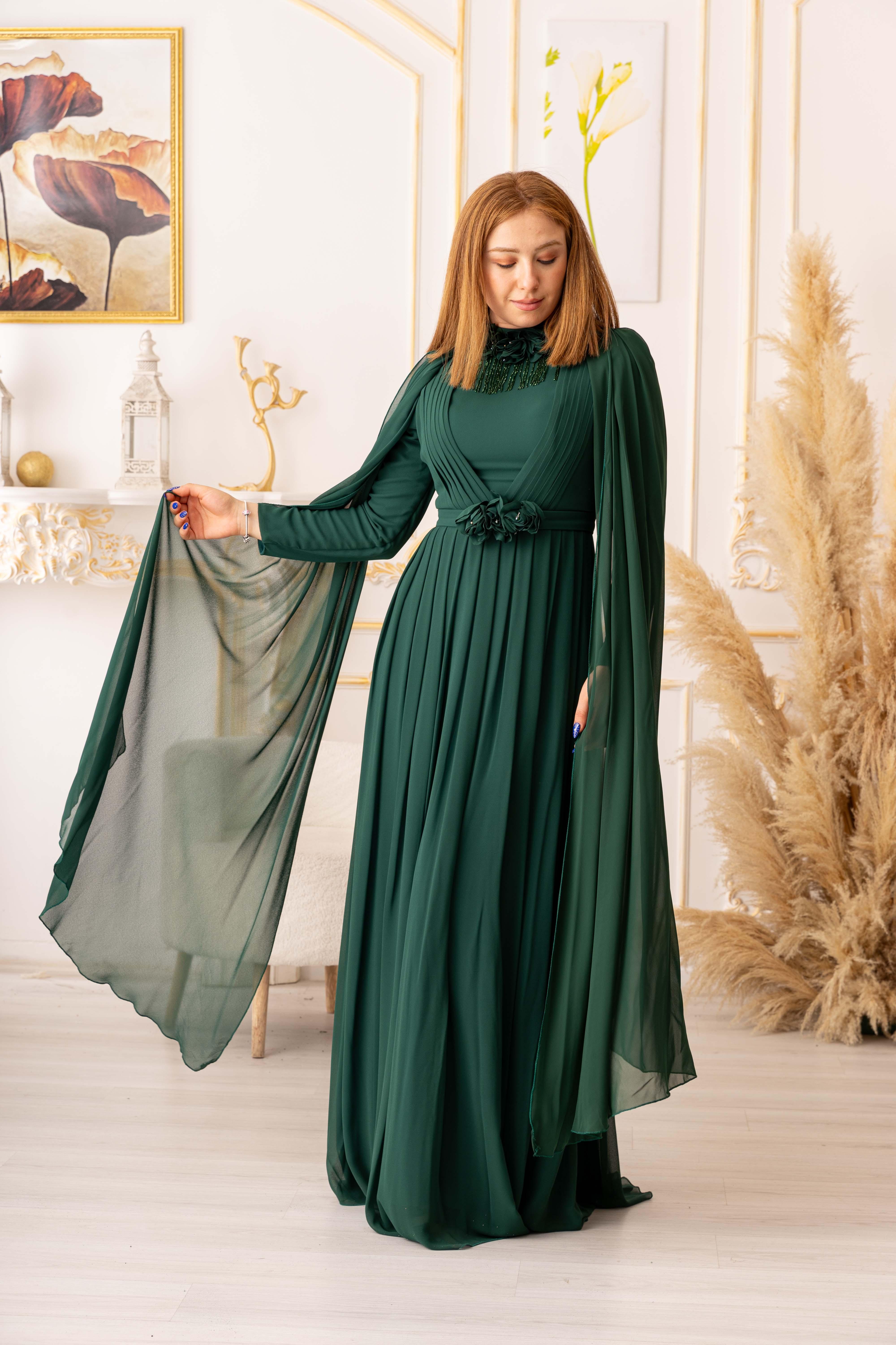 Omuzdan pelerin şeklinde olan abiye, taş detaylar ve çiçek motifleriyle zenginleştirilmiş şifon kumaştan üretilmiştir. Bu sayede hem hafif hem de yumuşak bir dokuya sahiptir, giydiğinizde size ferah bir his yaşatacaktır. Ayrıca, sallanan taş detayları ile de baştan aşağı şıklık ve zarafet yansıtır.