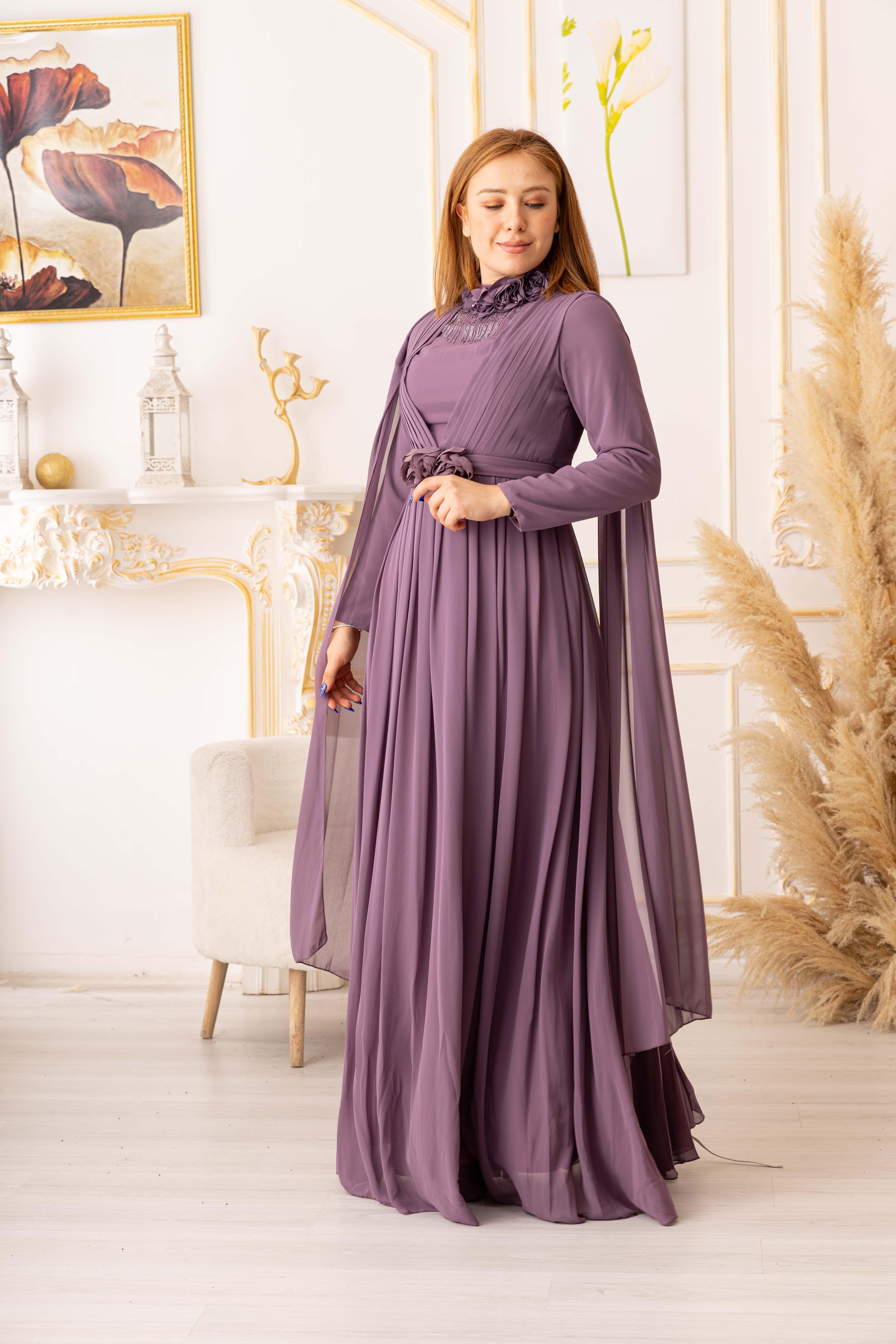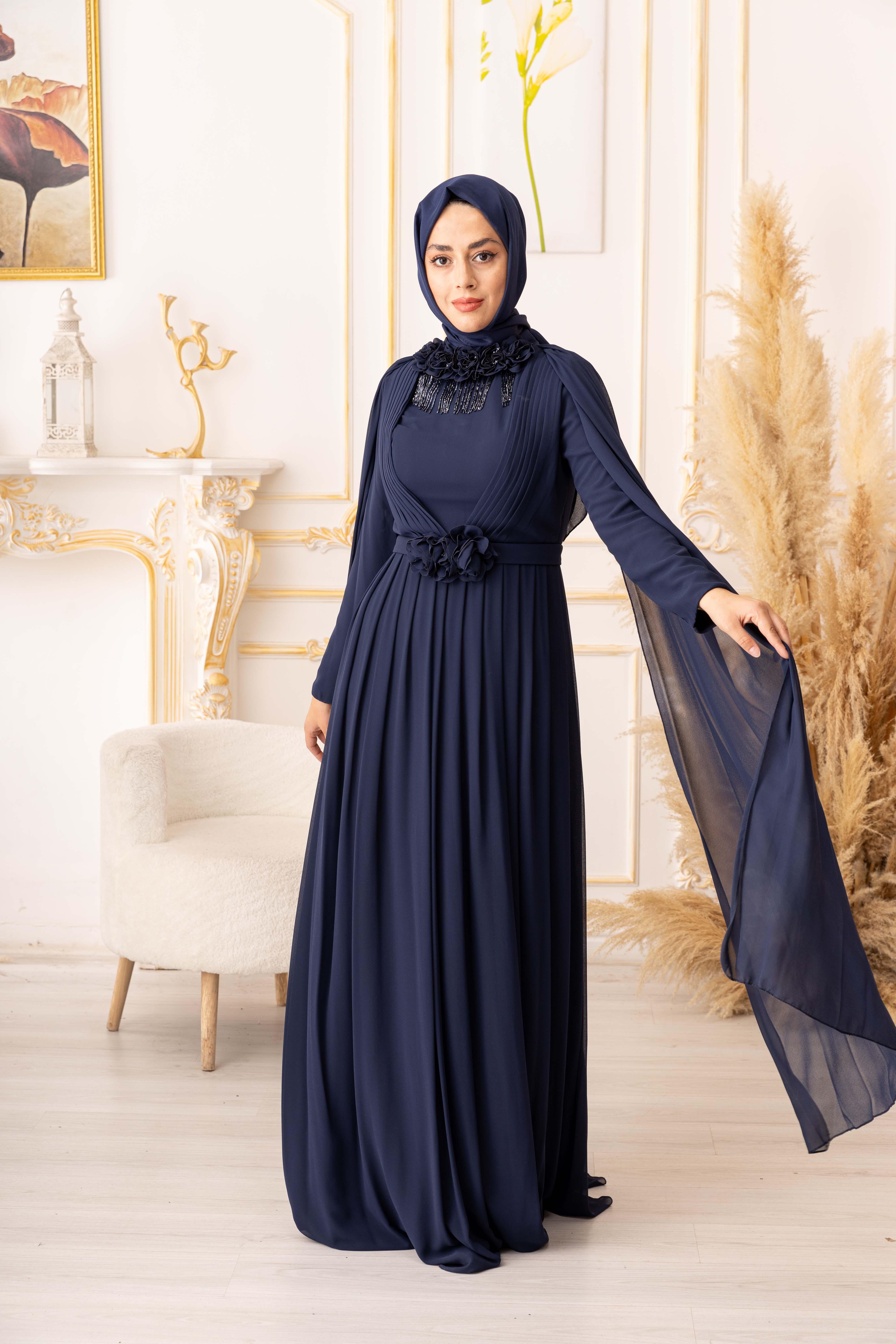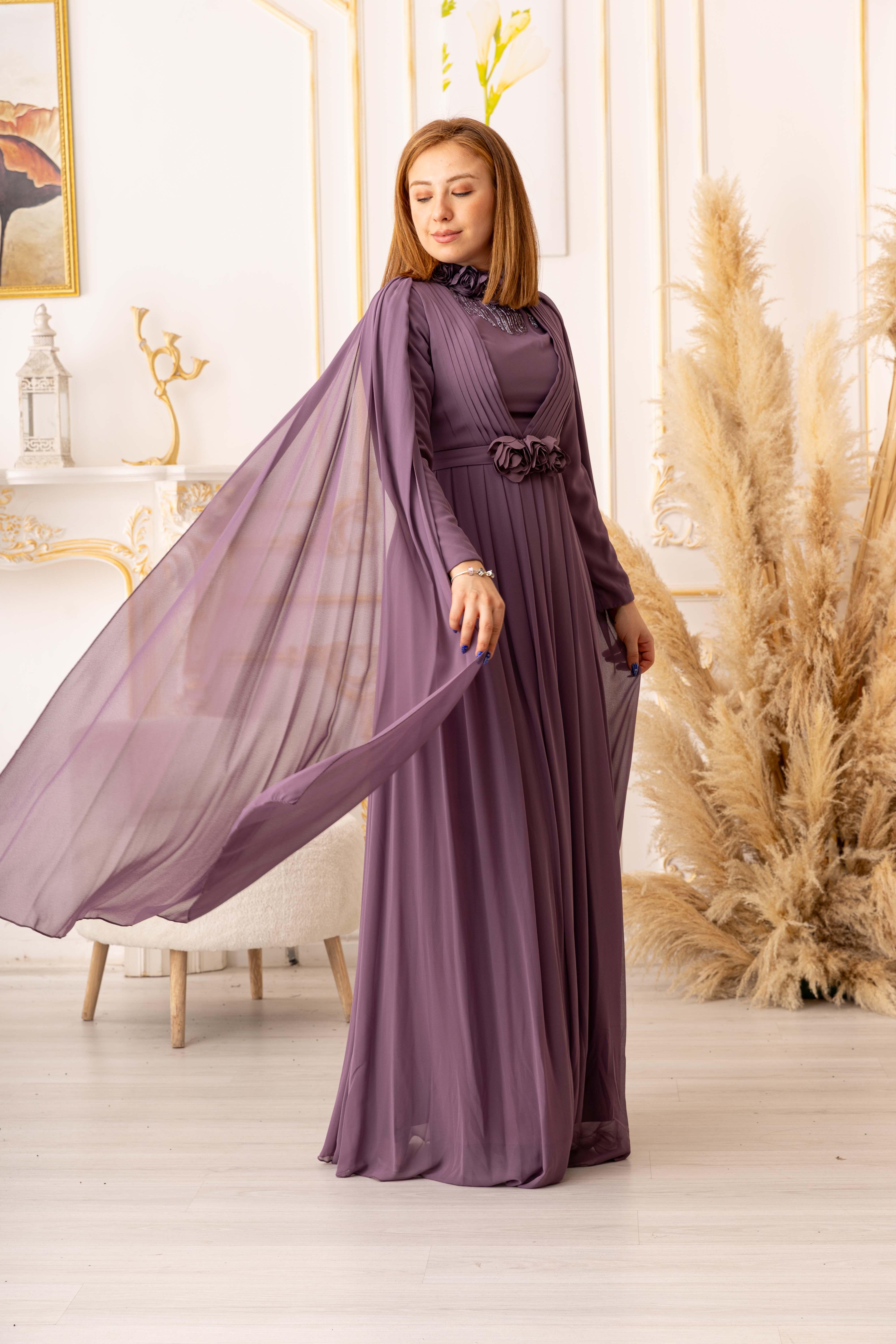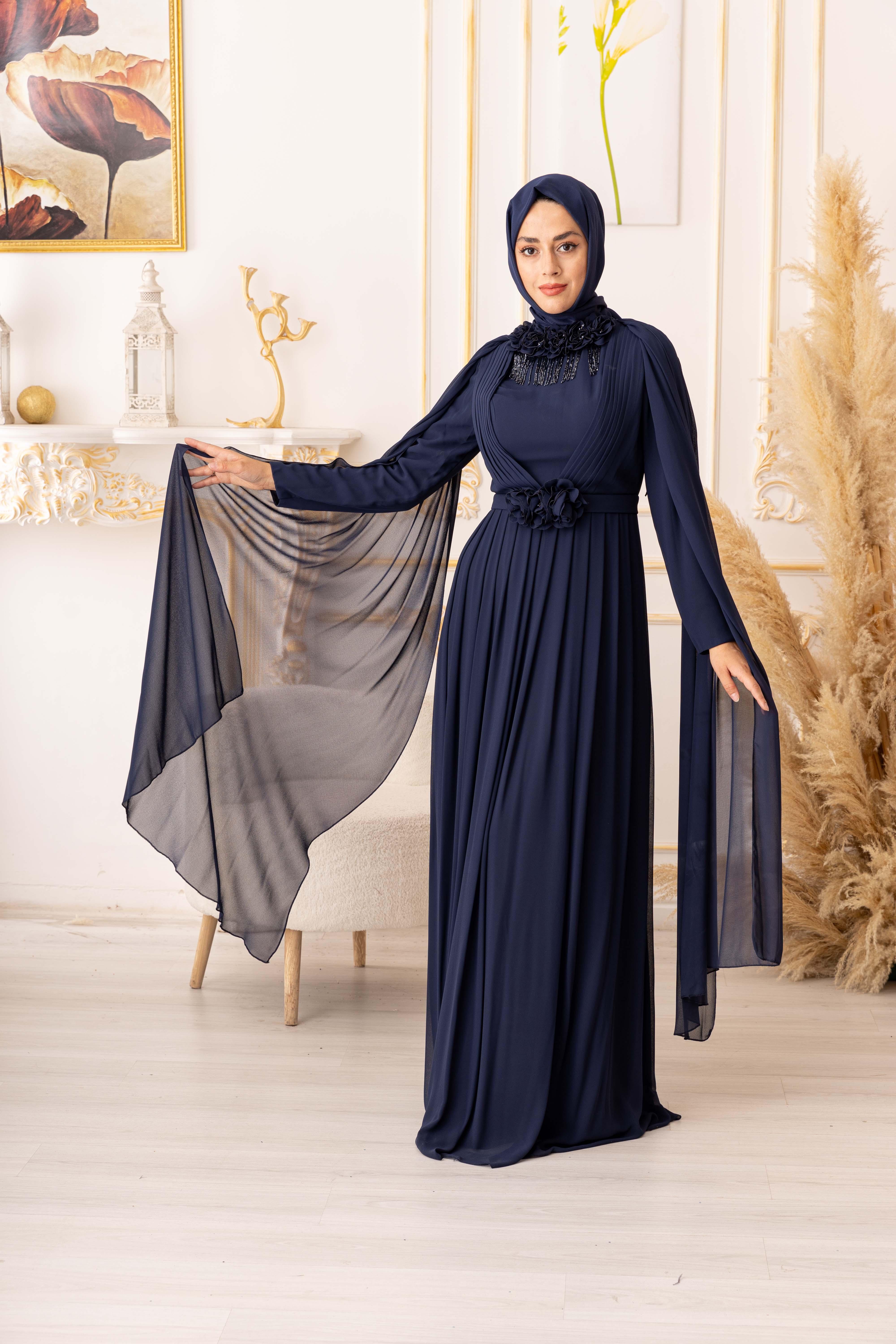 OMUZDAN PELERİNLİ ŞİFON KUMAŞ ÇİÇEK VE SALLANAN TAŞ DETAYLI TESETTÜR ABİYE (K13560), özel gecelerde ya da davetlerde rahatlıkla tercih edebileceğiniz bir abiye seçeneğidir. Zarif ve şık tasarımı, hafif ve ferah dokusuyla bir araya gelerek size adeta bir prensesin zarafetini yaşatır. Siz de tesettür giyimde şıklığı yakalamak istiyorsanız, bu abiye tam size göre!