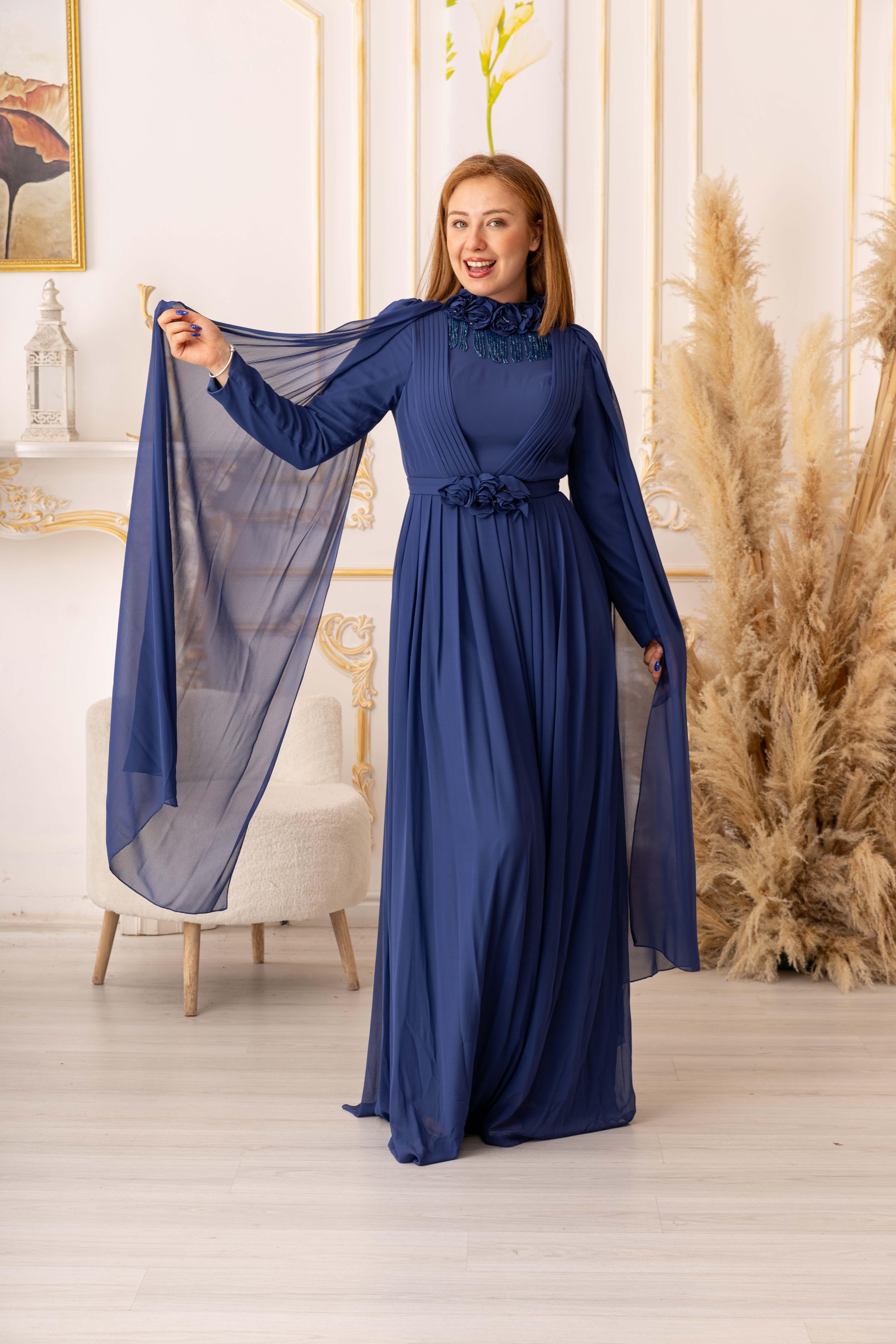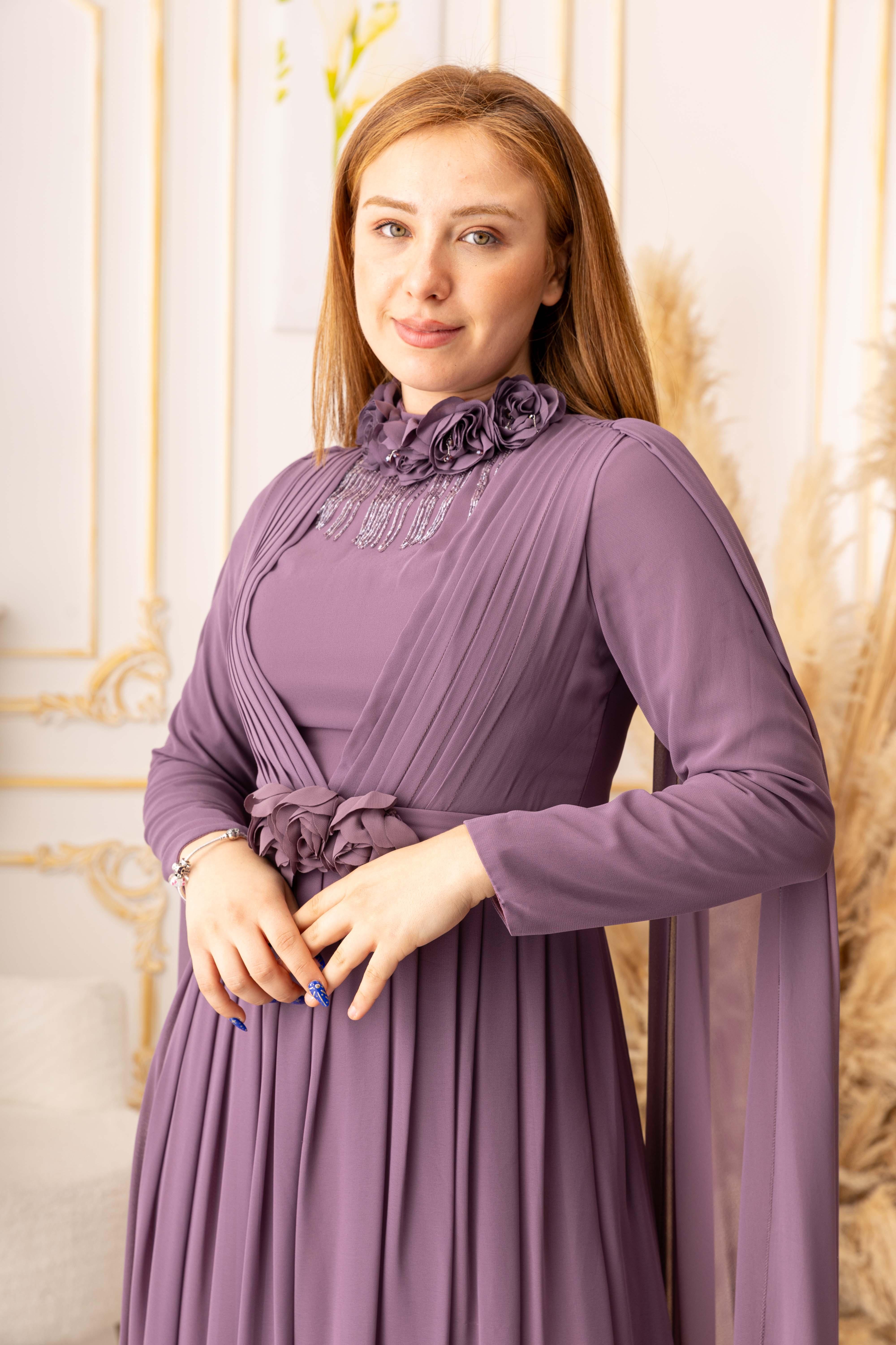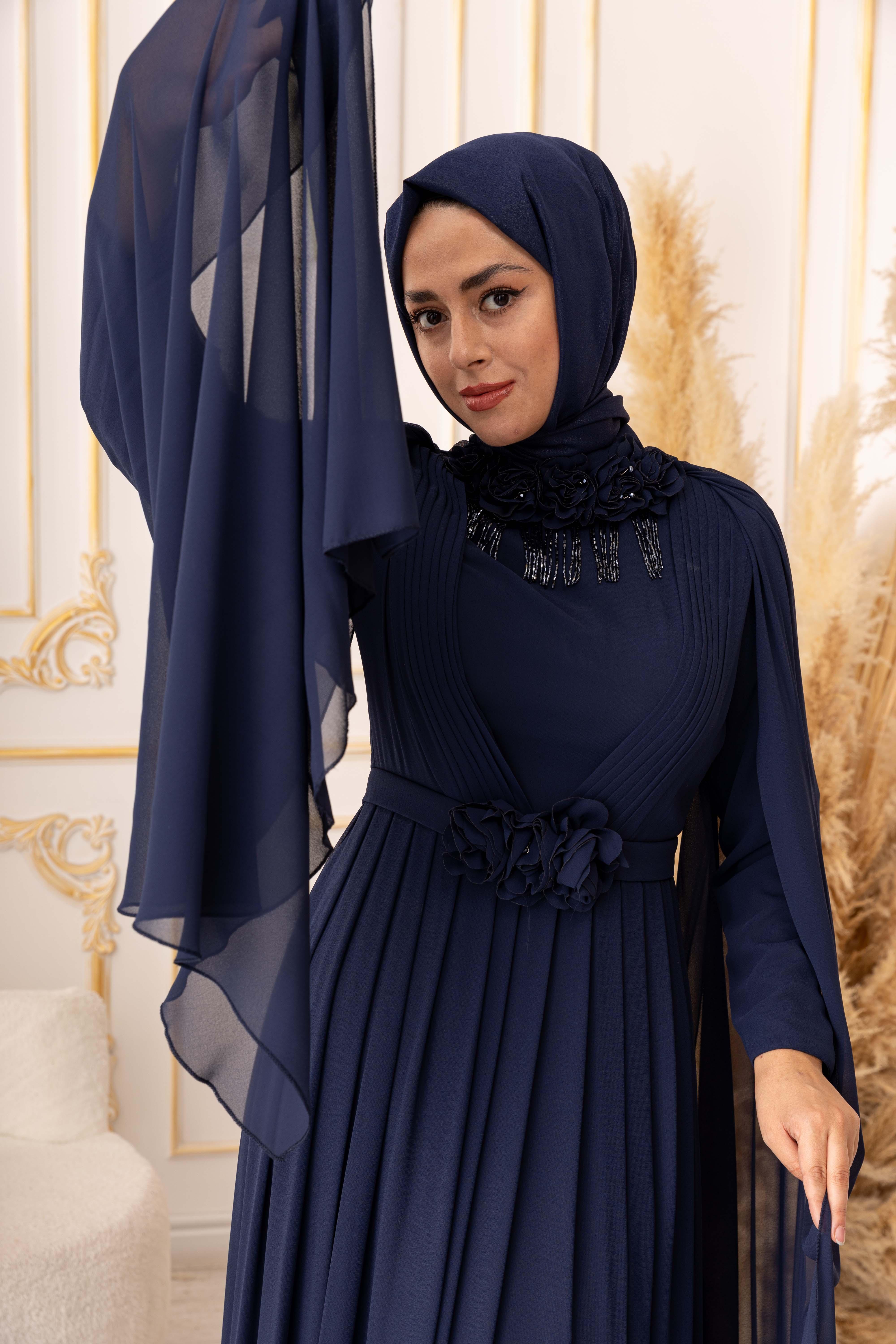 OMUZDAN PELERİNLİ ŞİFON KUMAŞ ÇİÇEK VE SALLANAN TAŞ DETAYLI TESETTÜR ABİYE (K13560), özel gecelerde ya da davetlerde rahatlıkla tercih edebileceğiniz bir abiye seçeneğidir. Zarif ve şık tasarımı, hafif ve ferah dokusuyla bir araya gelerek size adeta bir prensesin zarafetini yaşatır. Siz de tesettür giyimde şıklığı yakalamak istiyorsanız, bu abiye tam size göre!