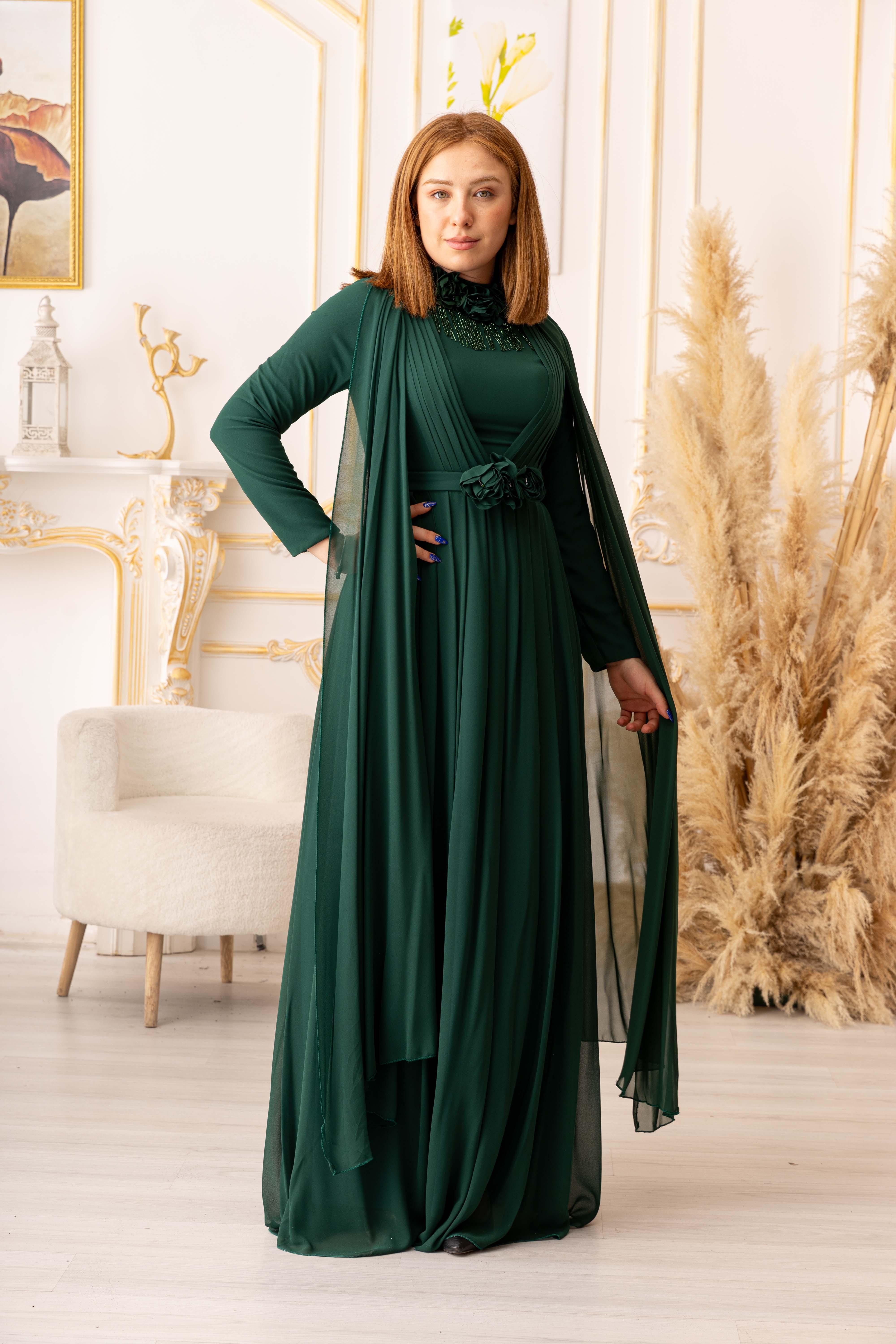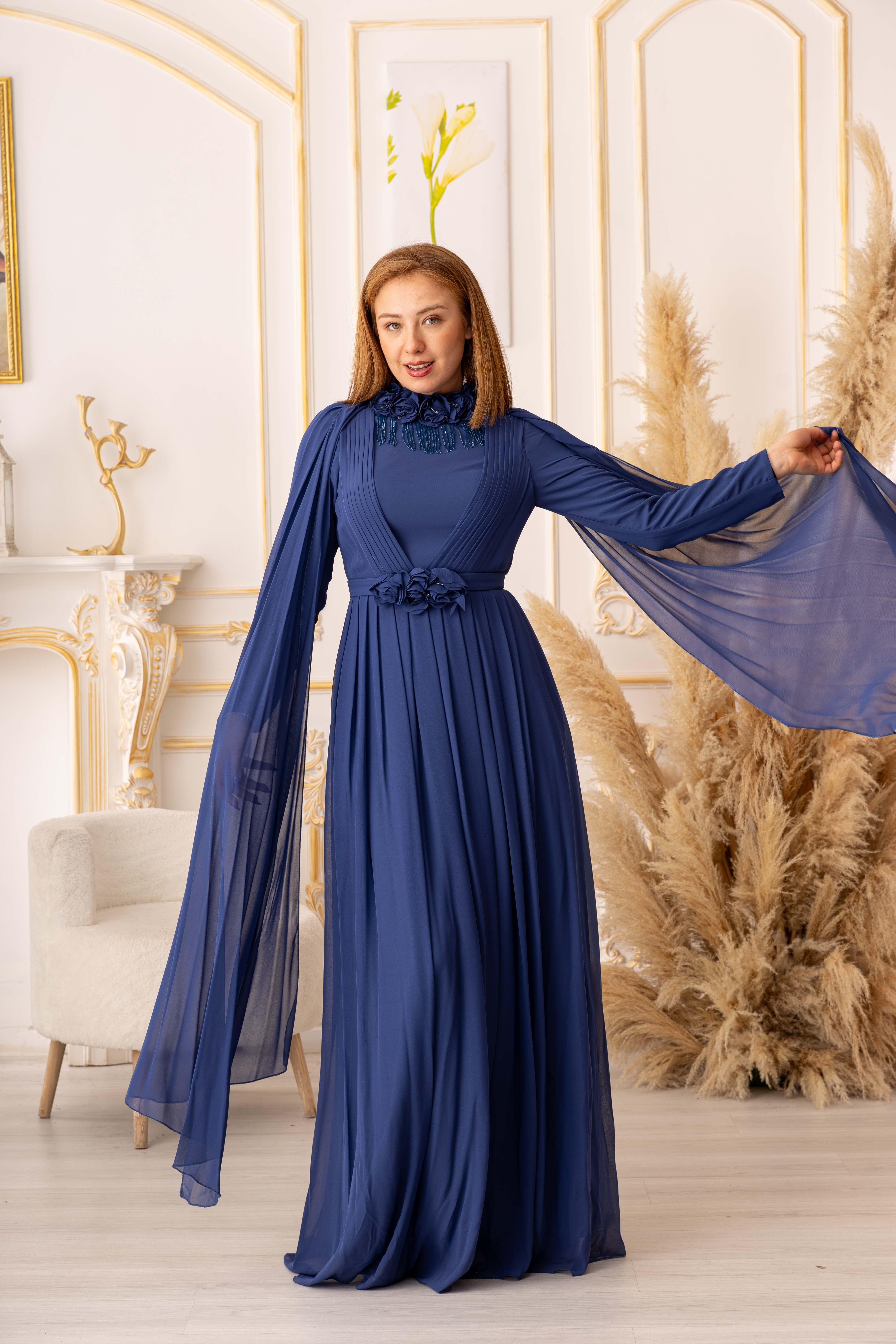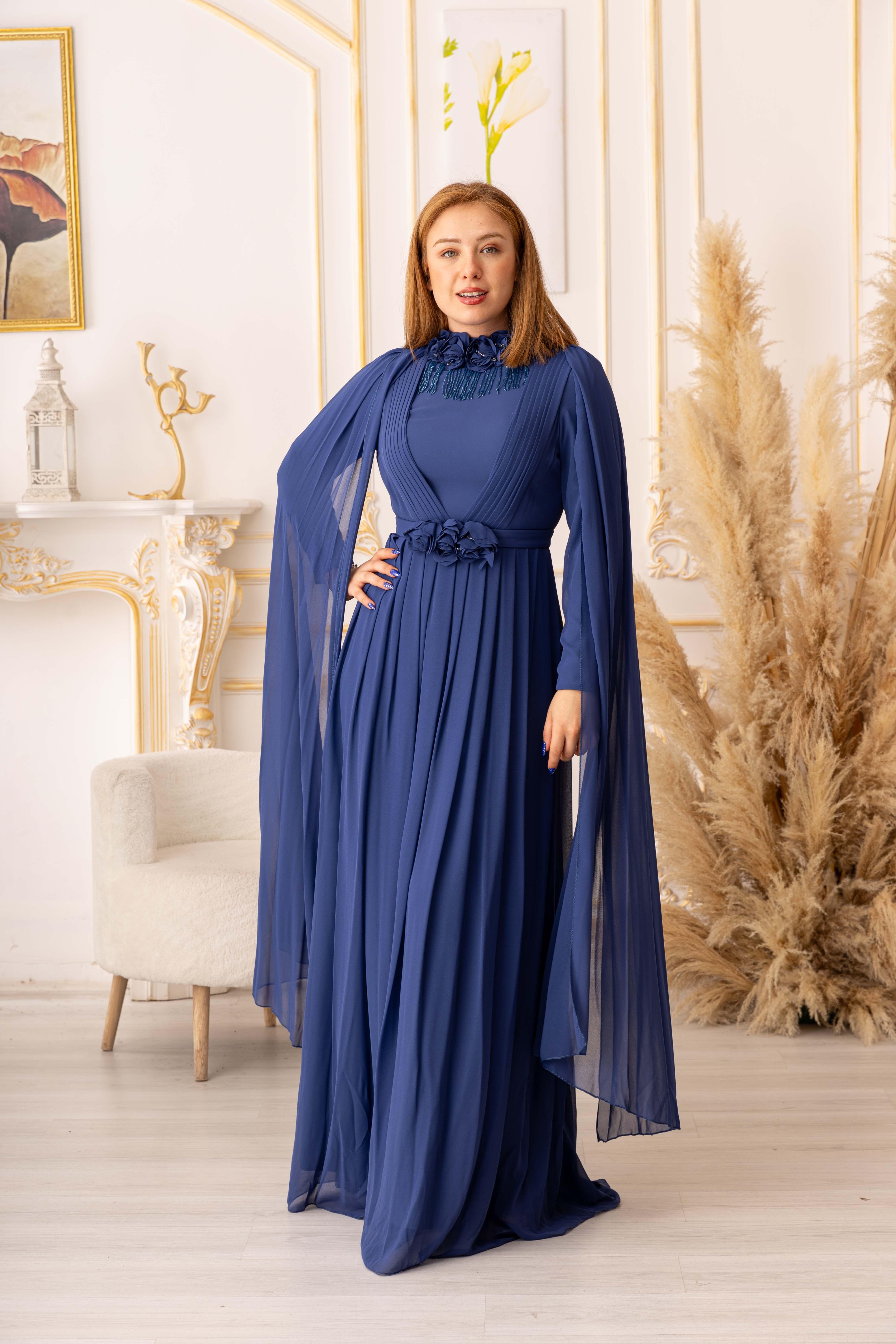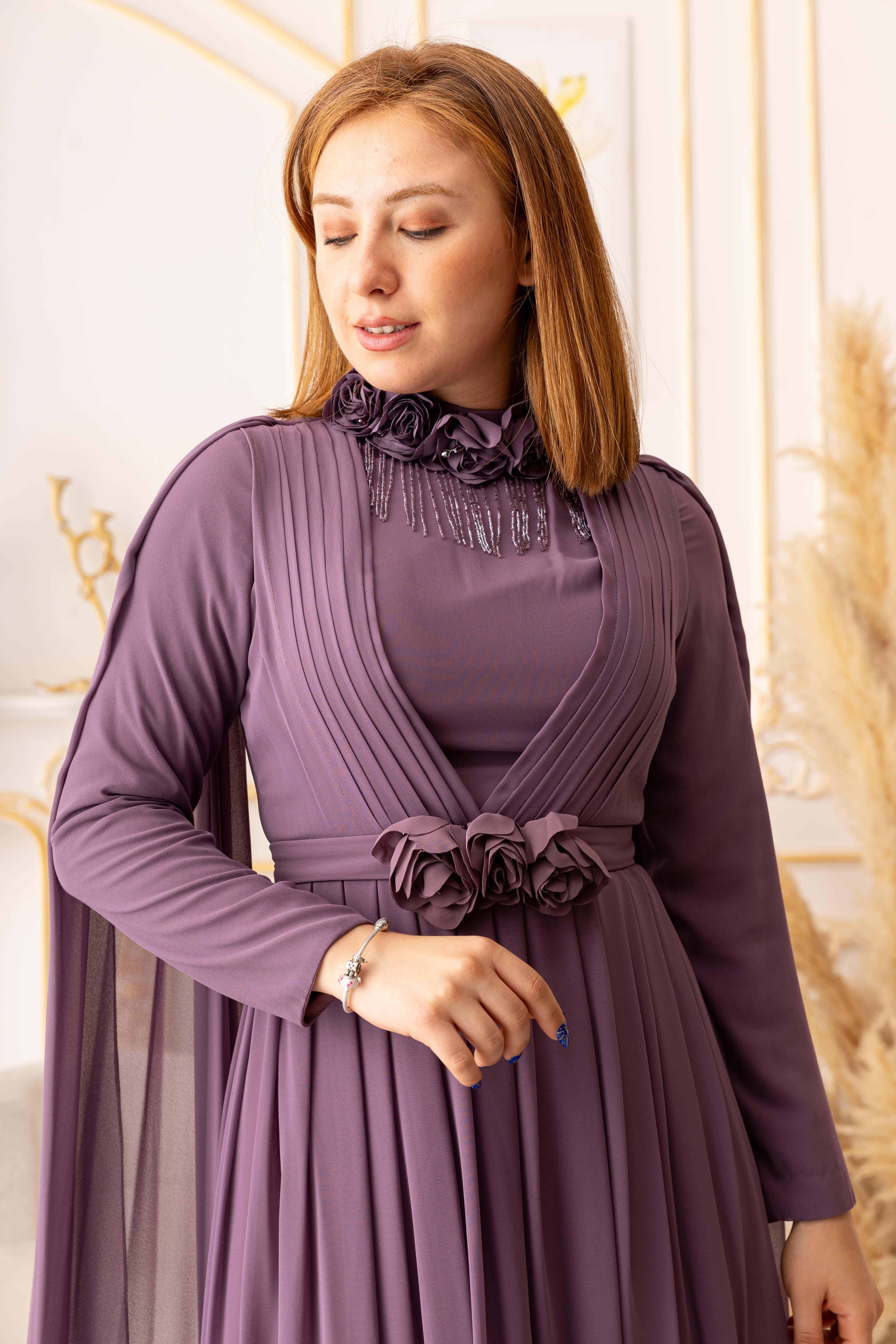 OMUZDAN PELERİNLİ ŞİFON KUMAŞ ÇİÇEK VE SALLANAN TAŞ DETAYLI TESETTÜR ABİYE (K13560), özel gecelerde ya da davetlerde rahatlıkla tercih edebileceğiniz bir abiye seçeneğidir. Zarif ve şık tasarımı, hafif ve ferah dokusuyla bir araya gelerek size adeta bir prensesin zarafetini yaşatır. Siz de tesettür giyimde şıklığı yakalamak istiyorsanız, bu abiye tam size göre!