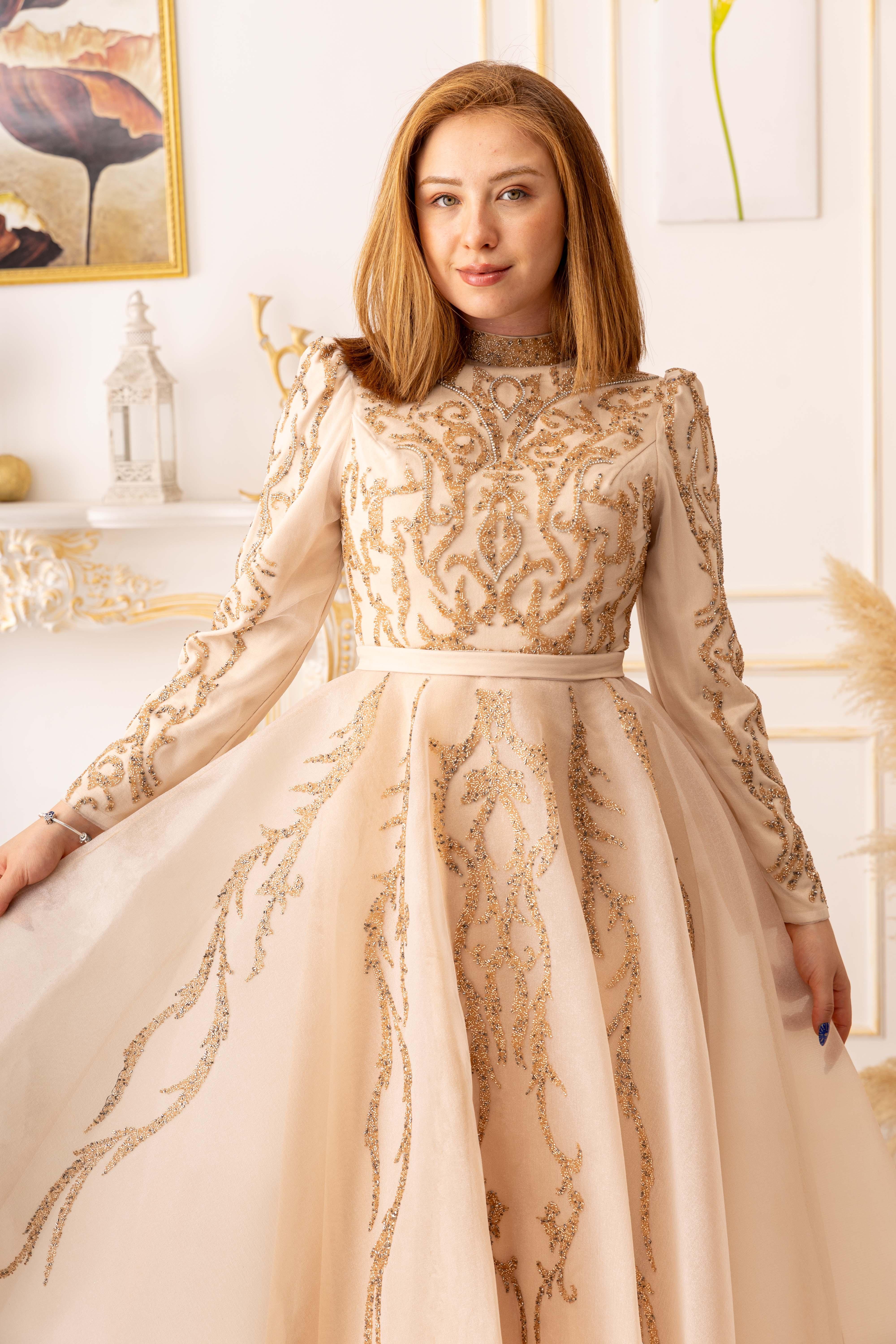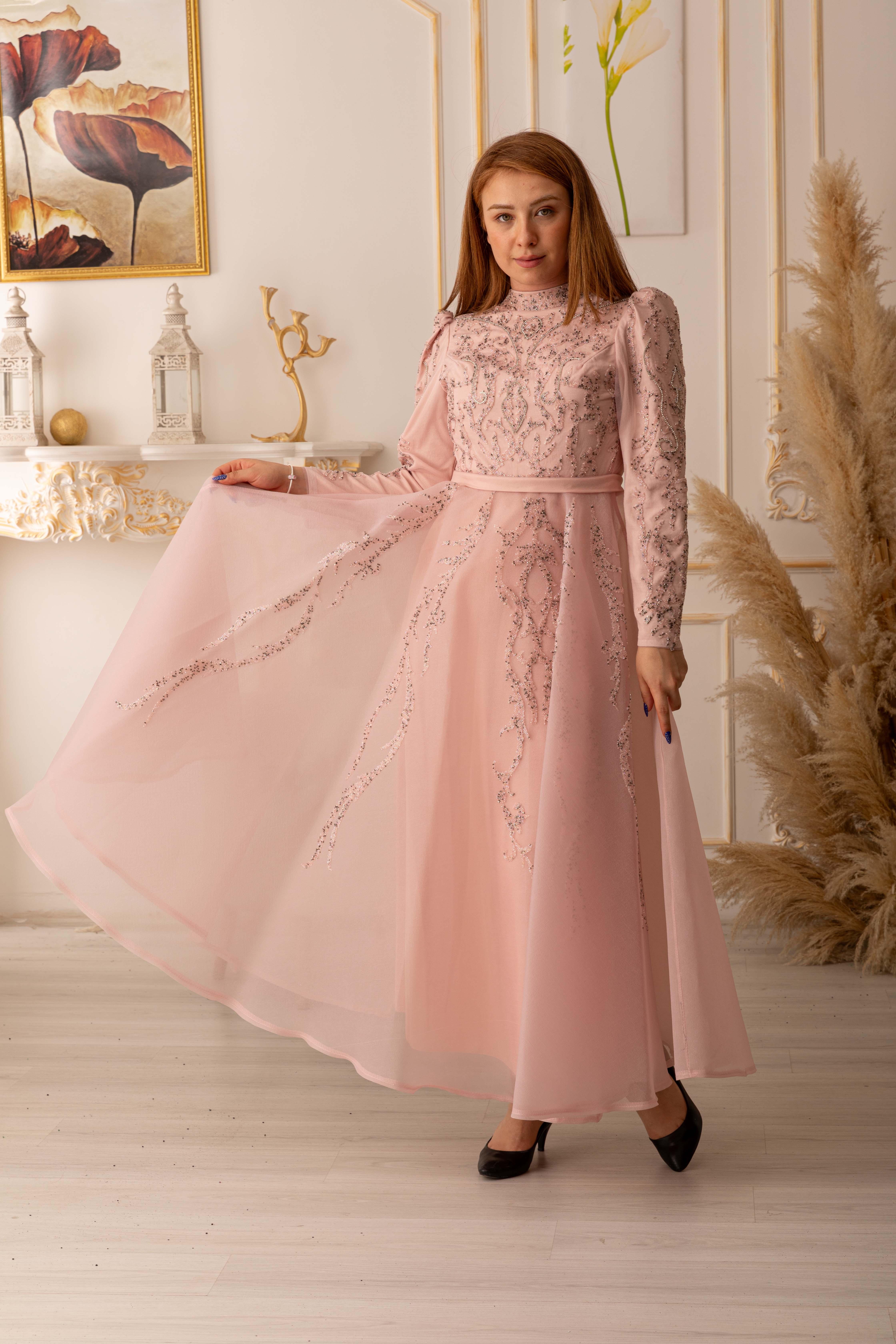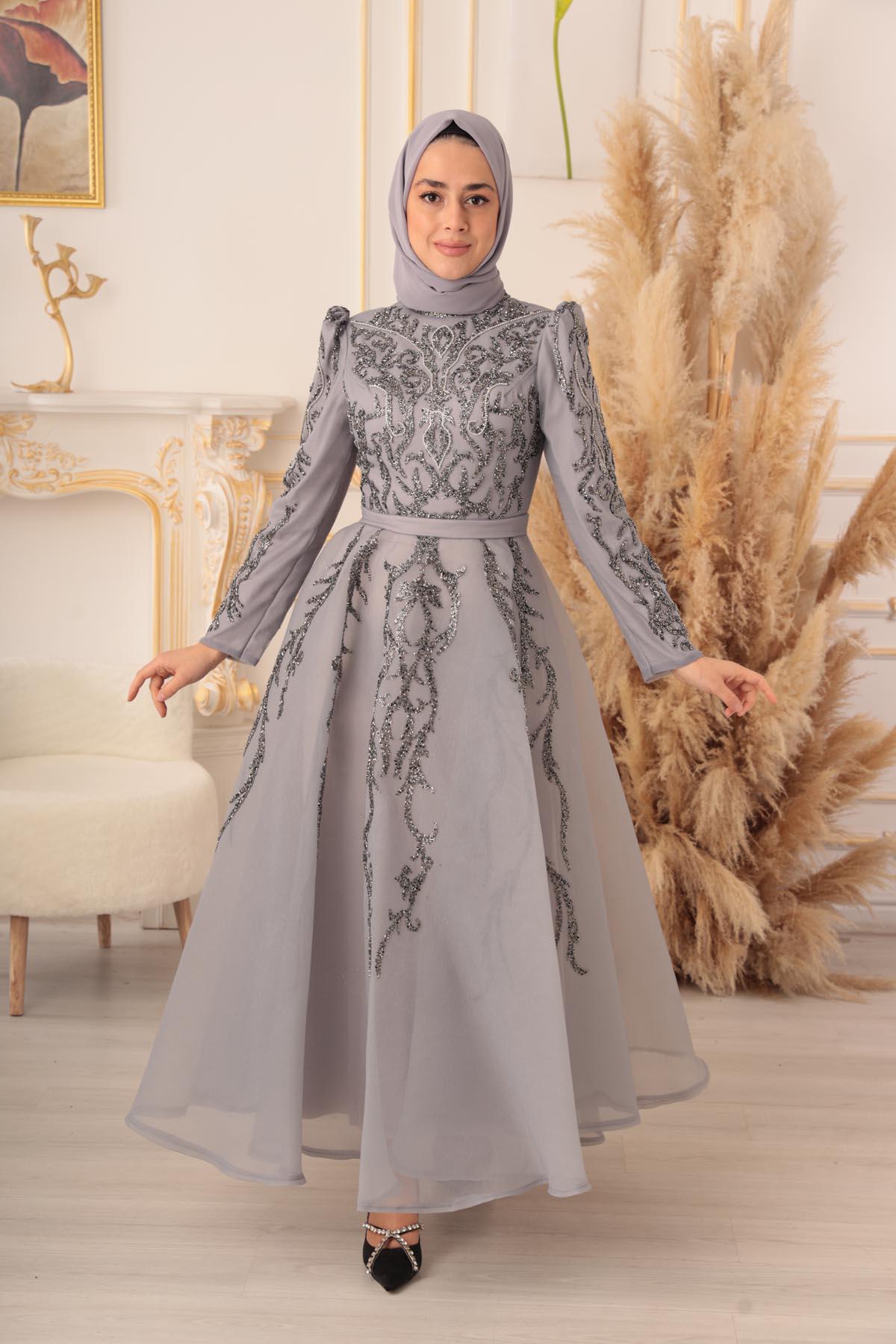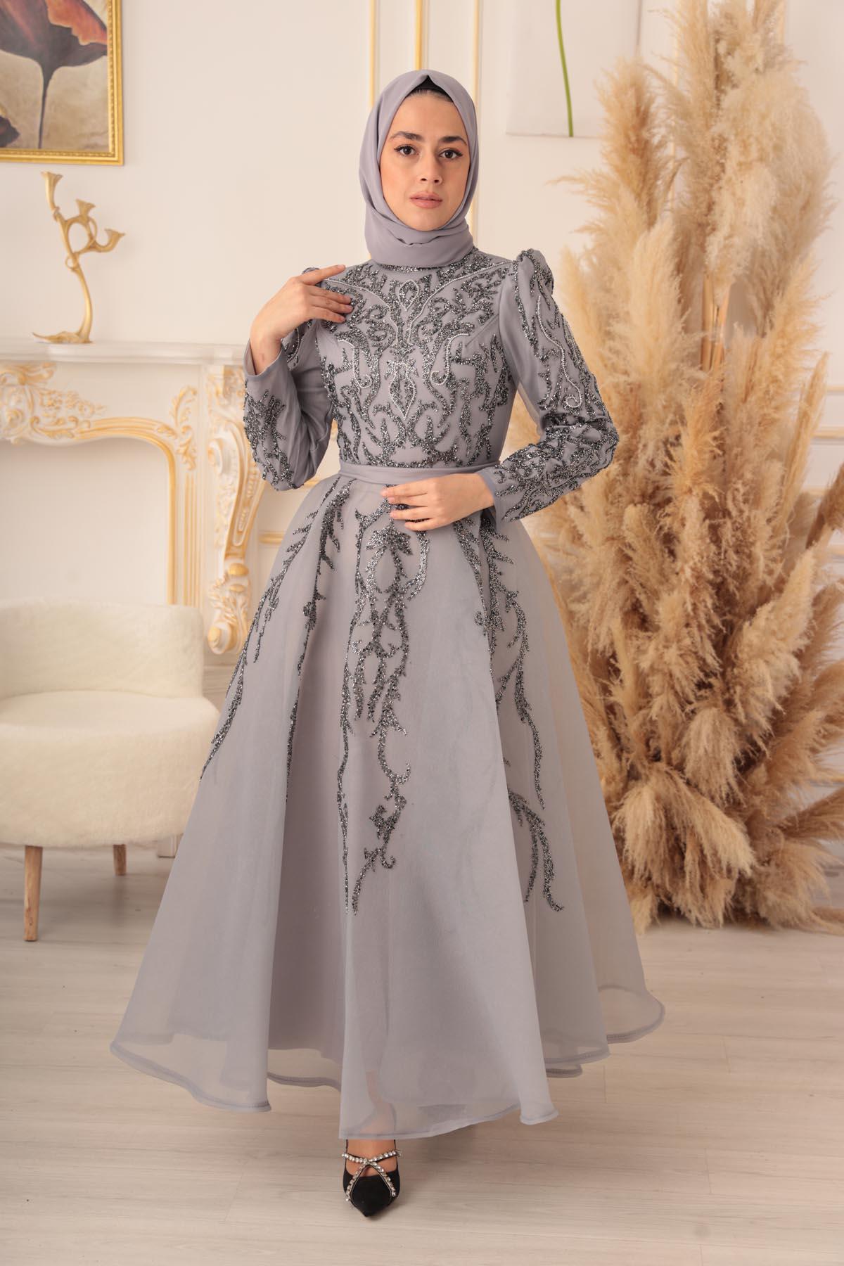 Taş işlemeli kabarık model tesettür abiye, özel günlerinizde size mükemmel bir görünüm kazandıracak. Düğünlerden, nişanlara, mezuniyet törenlerinden gala gecelerine kadar her türlü özel etkinlikte şıklığınızla öne çıkacaksınız.