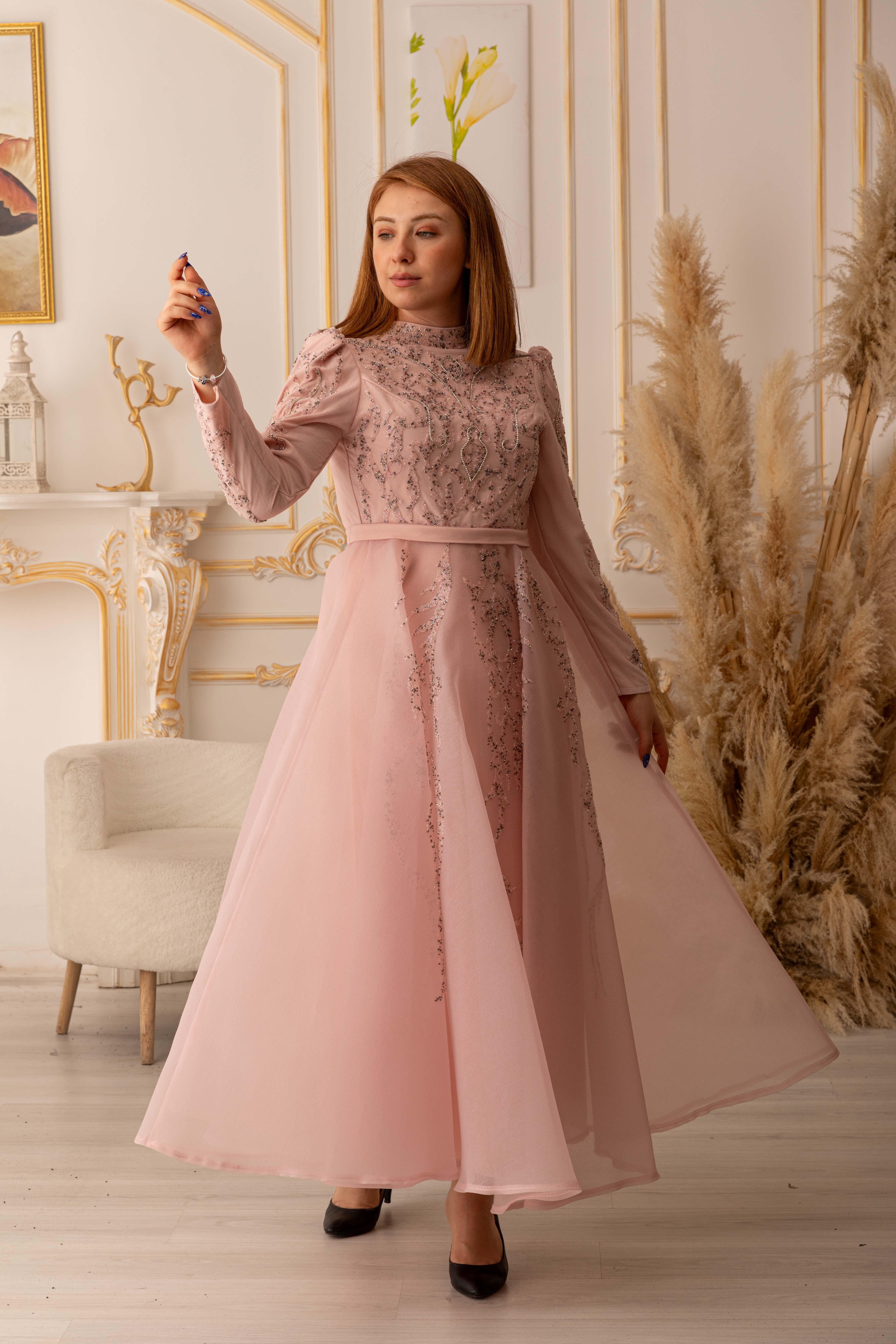 TAŞ İŞLEMELİ KABARIK MODEL TESETTÜR ABİYE (K18455), modern ve şık tasarımıyla öne çıkan bir tesettür abiye modelidir.