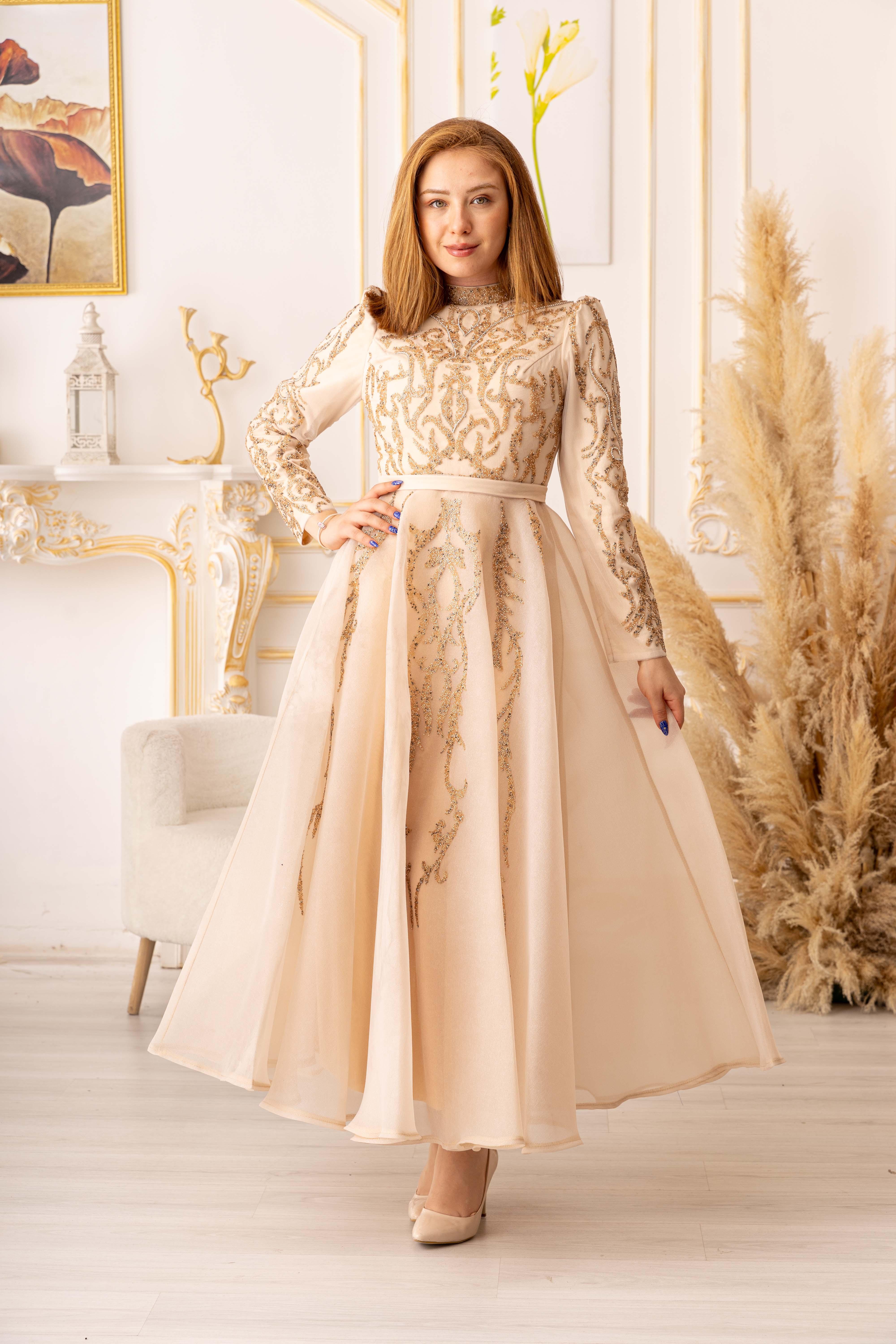 Bu abiye, gelinlikten farklı bir konseptte tasarlanmıştır. Geline gölge düşürmeyecek ve onun özel gününe saygı gösterecek şekilde tasarlanmıştır. Bu nedenle, tercih edebileceğiniz birçok renk seçeneği bulunmaktadır. Ayrıca, saten kumaşın yanı sıra dantel detaylar da mevcuttur.