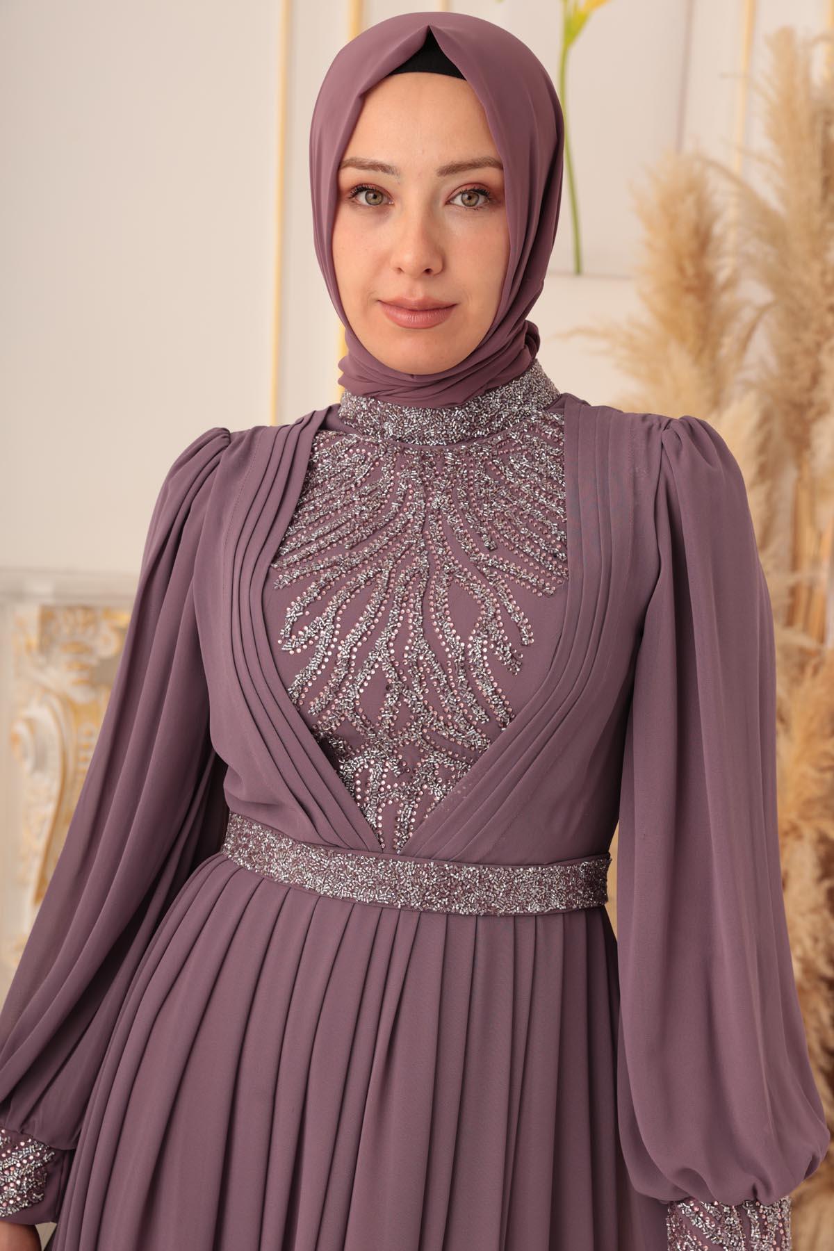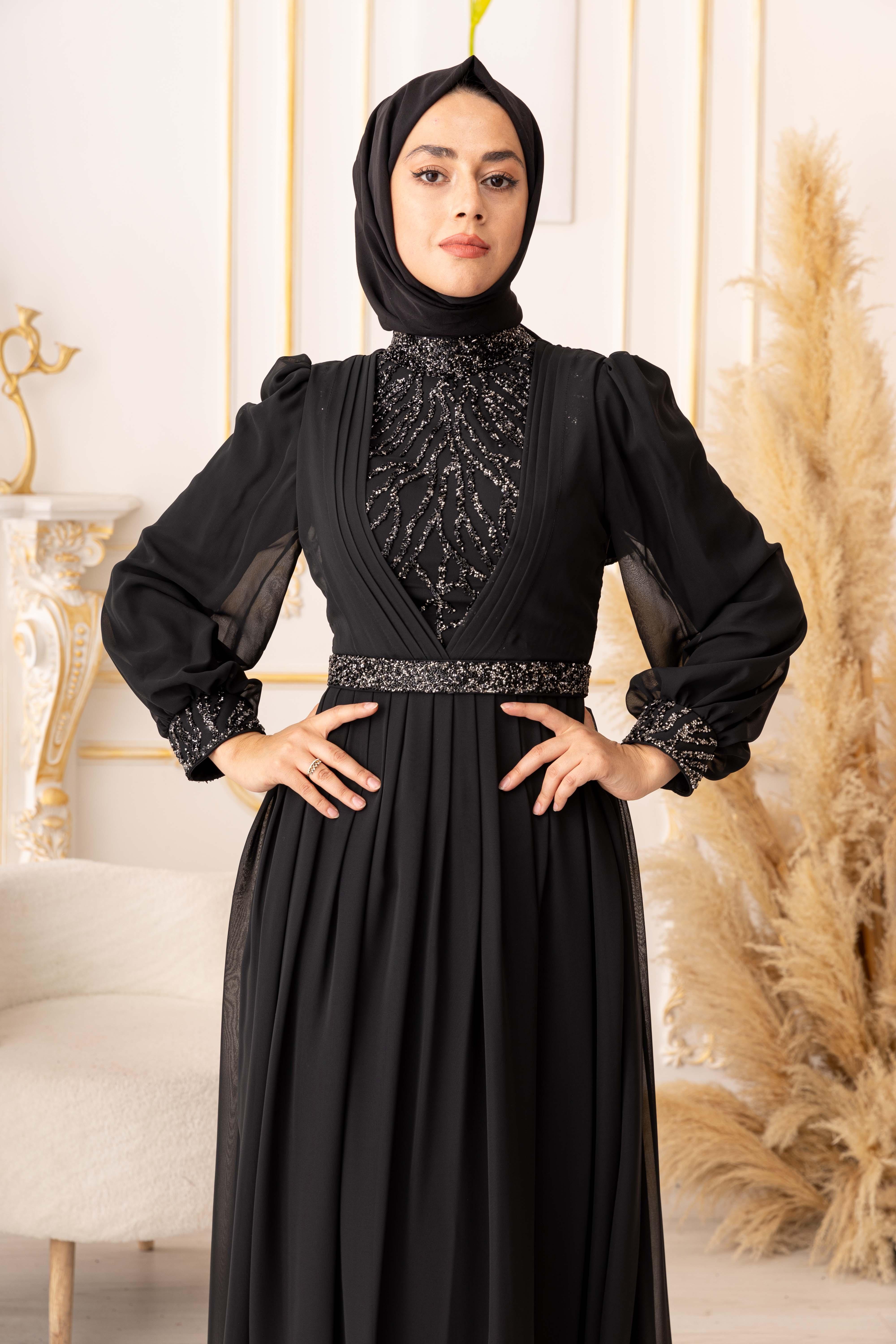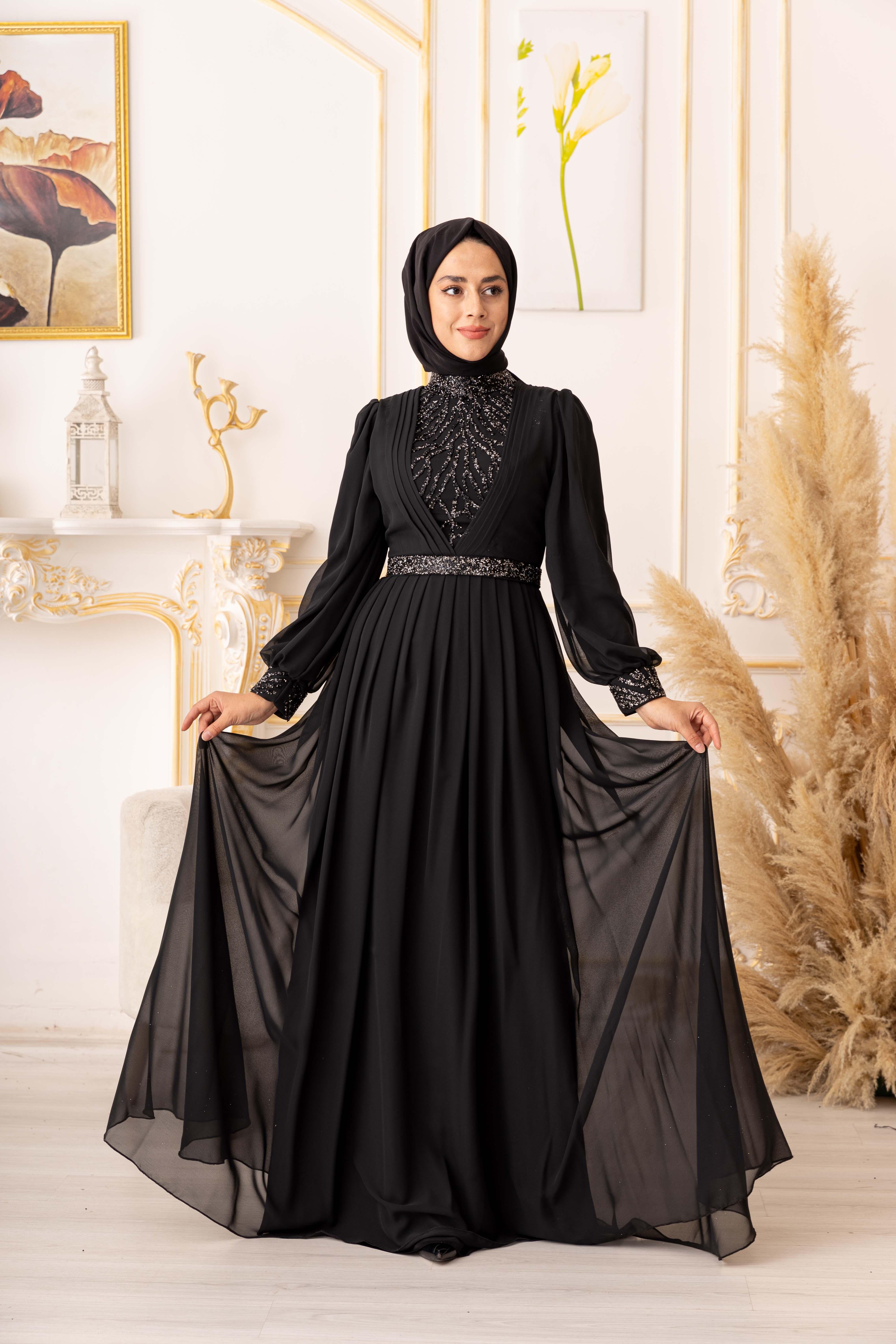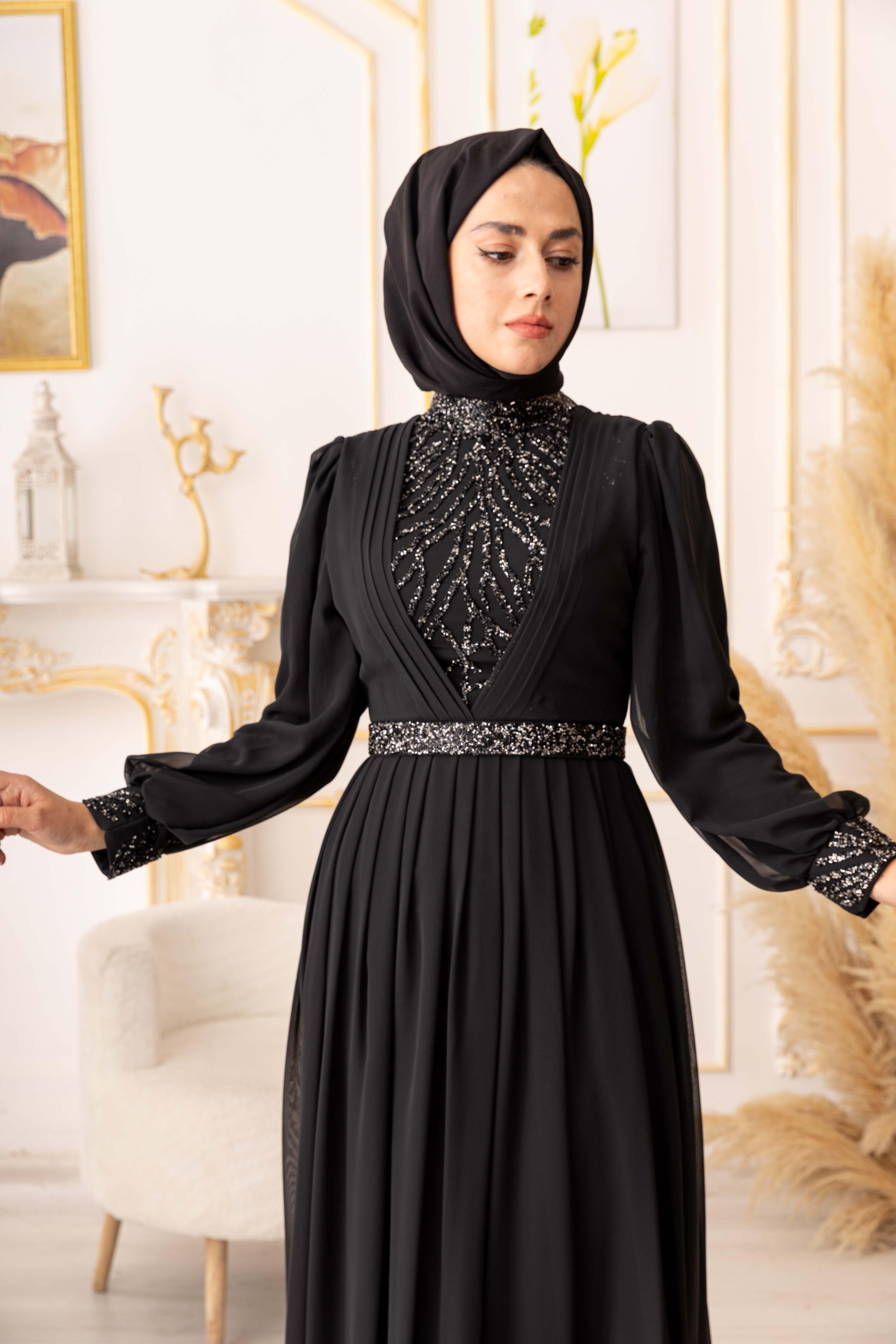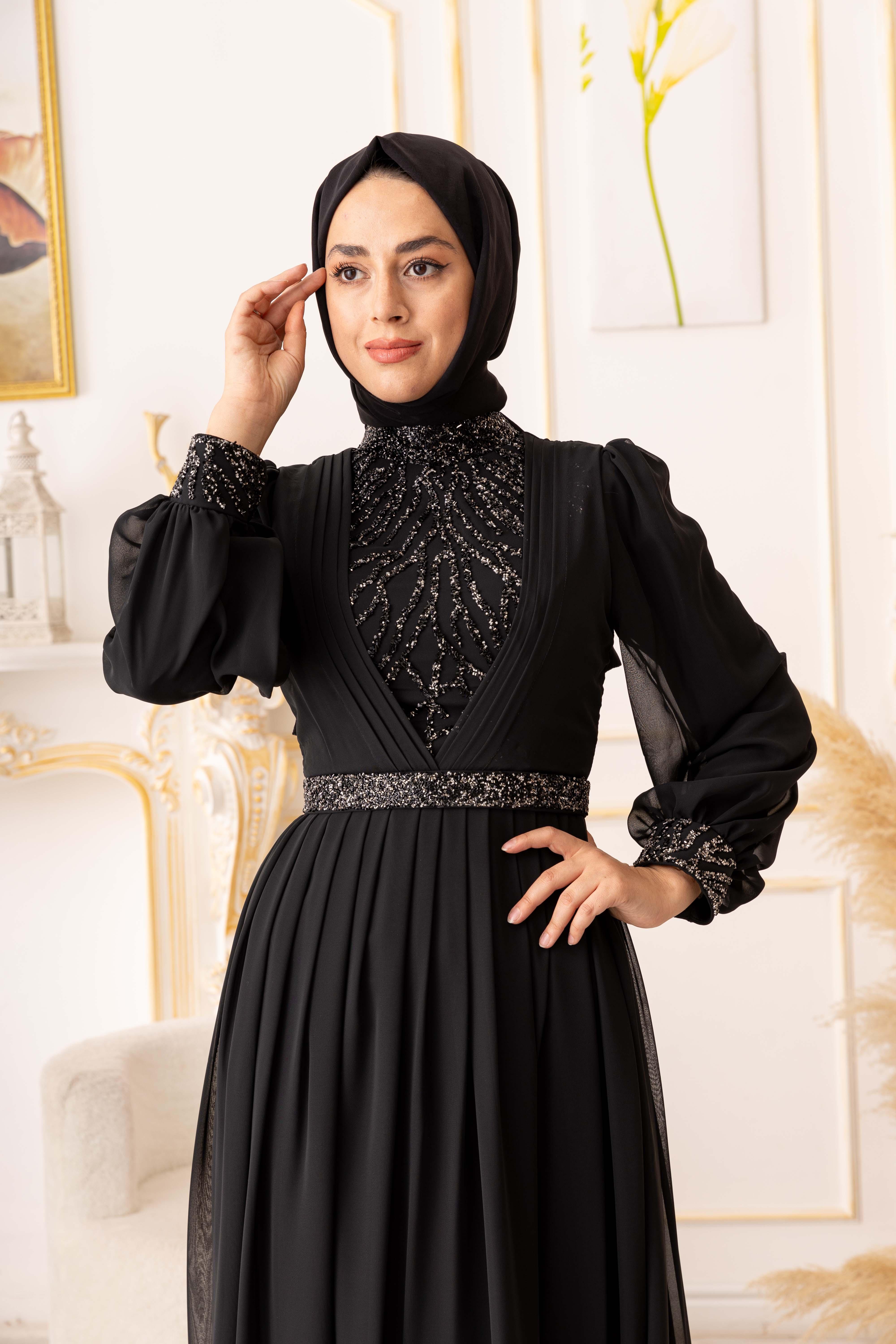 Özel bir davet, düğün, nişan gibi özel günlerinizde şıklığınızı ve asaletinizi ortaya koymak için ideal bir seçim olan TAŞ VE PLİSE DETAYLI ŞİFON TESETTÜR ABİYE (17925), size mükemmel bir görünüm kazandıracak ve sizi özel kılacaktır.