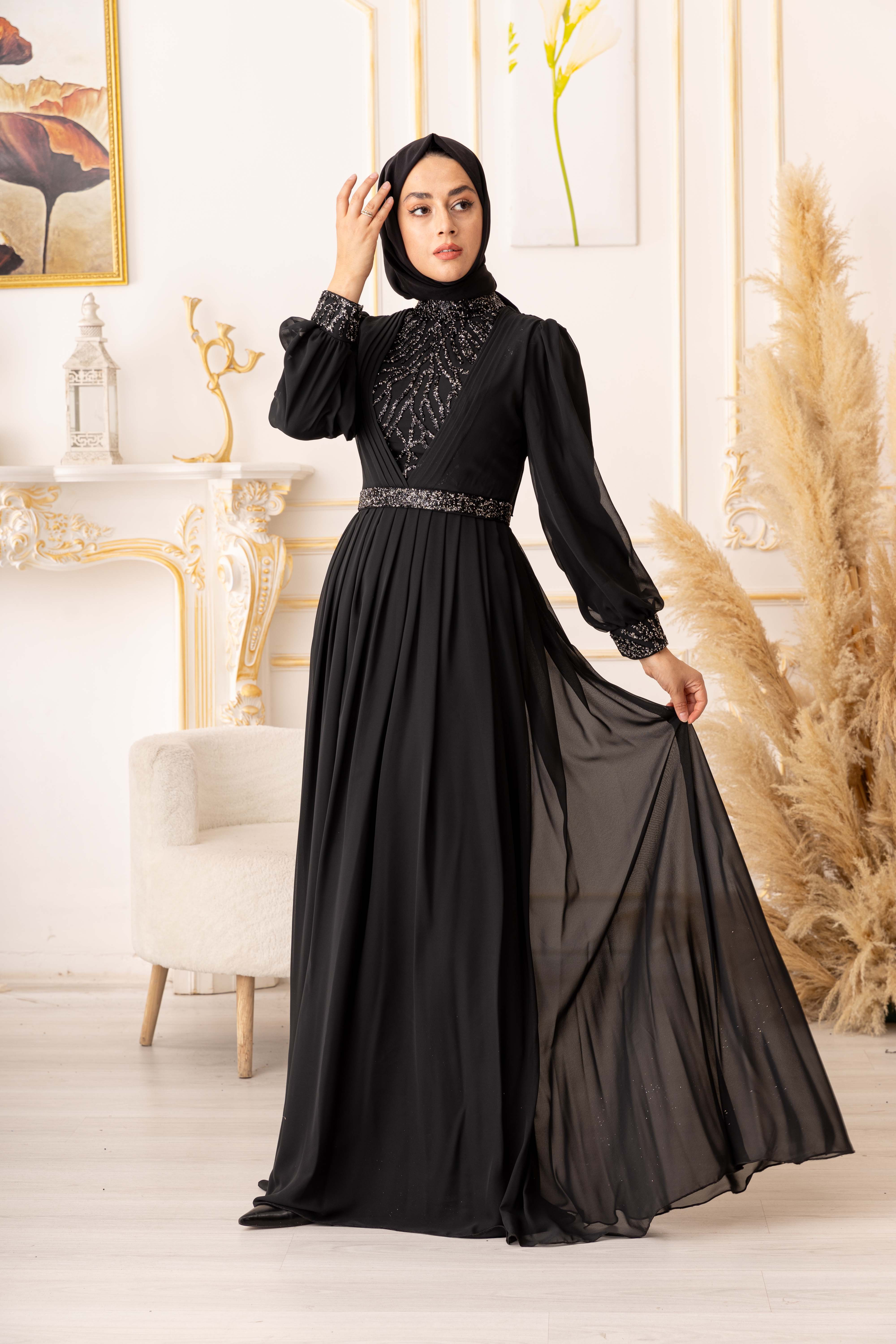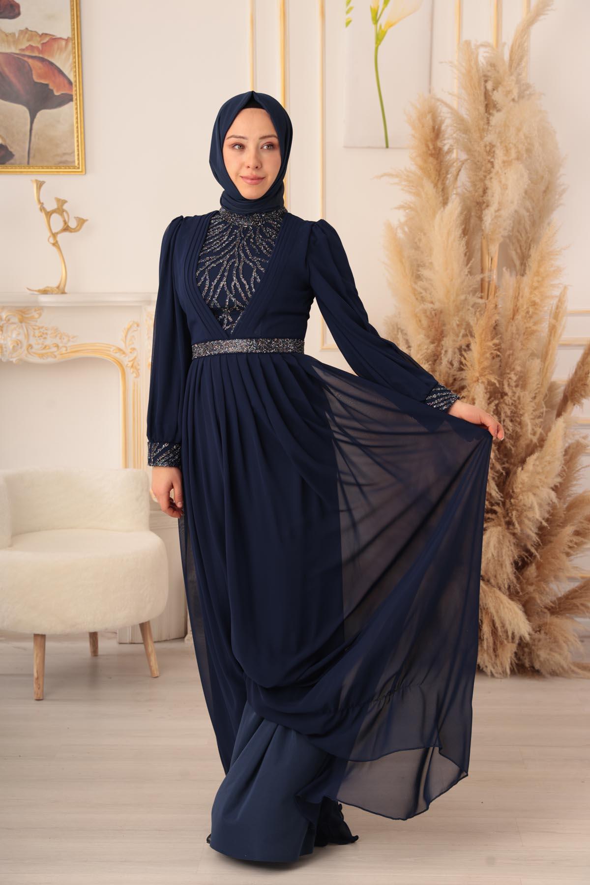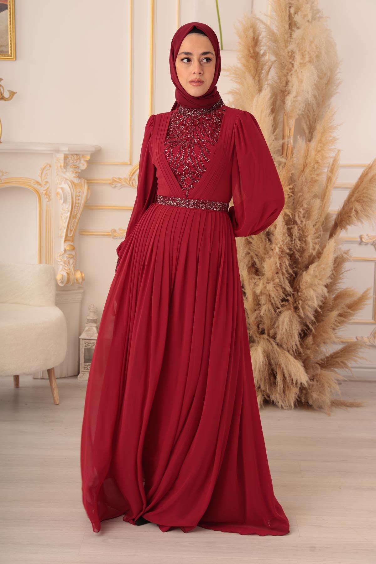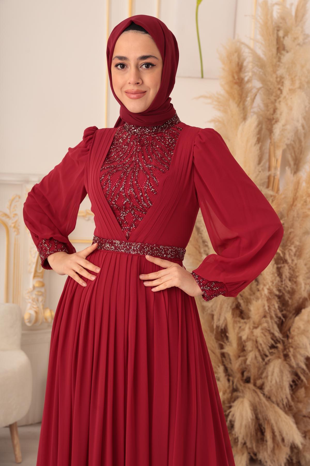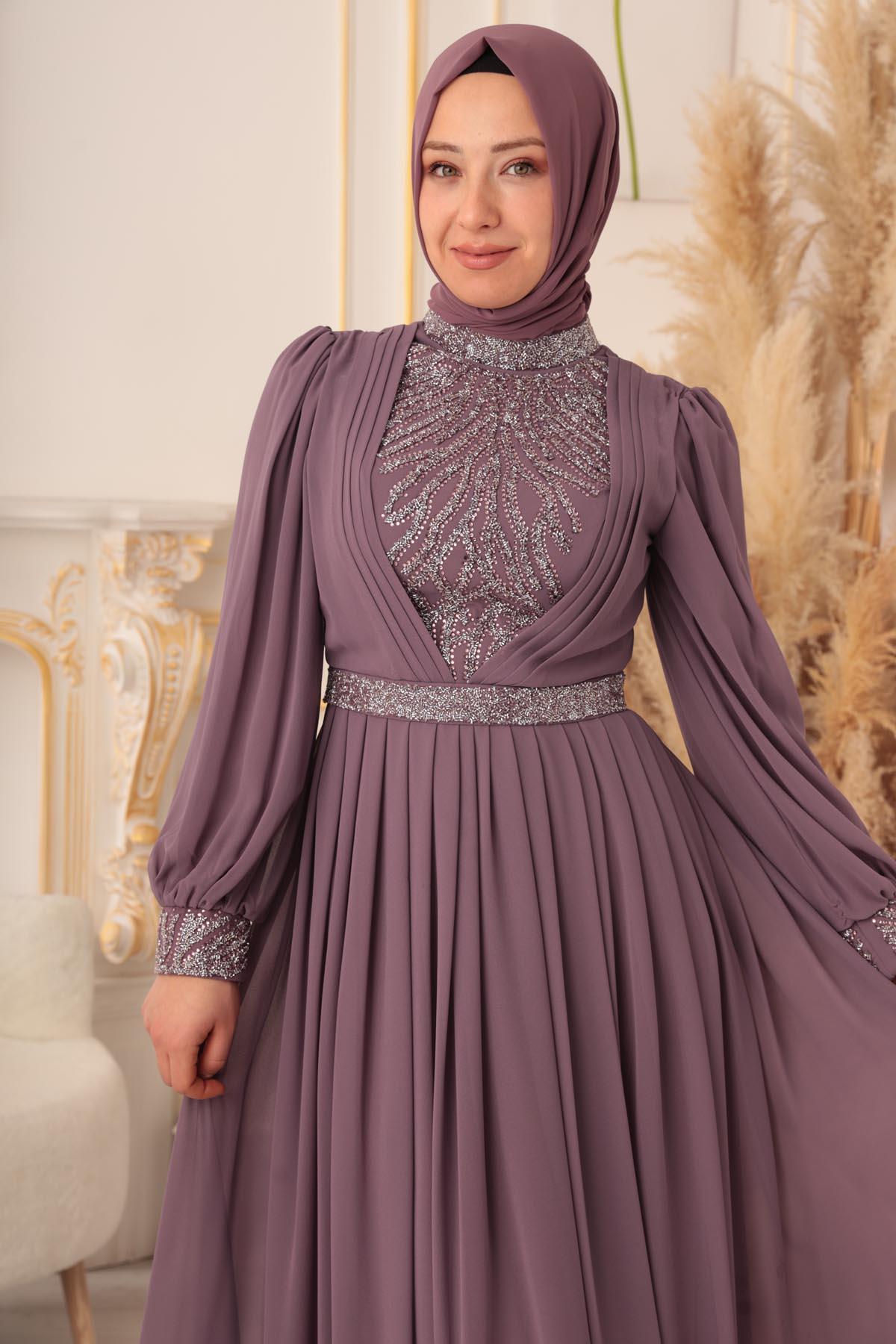 Özel bir davet, düğün, nişan gibi özel günlerinizde şıklığınızı ve asaletinizi ortaya koymak için ideal bir seçim olan TAŞ VE PLİSE DETAYLI ŞİFON TESETTÜR ABİYE (17925), size mükemmel bir görünüm kazandıracak ve sizi özel kılacaktır.