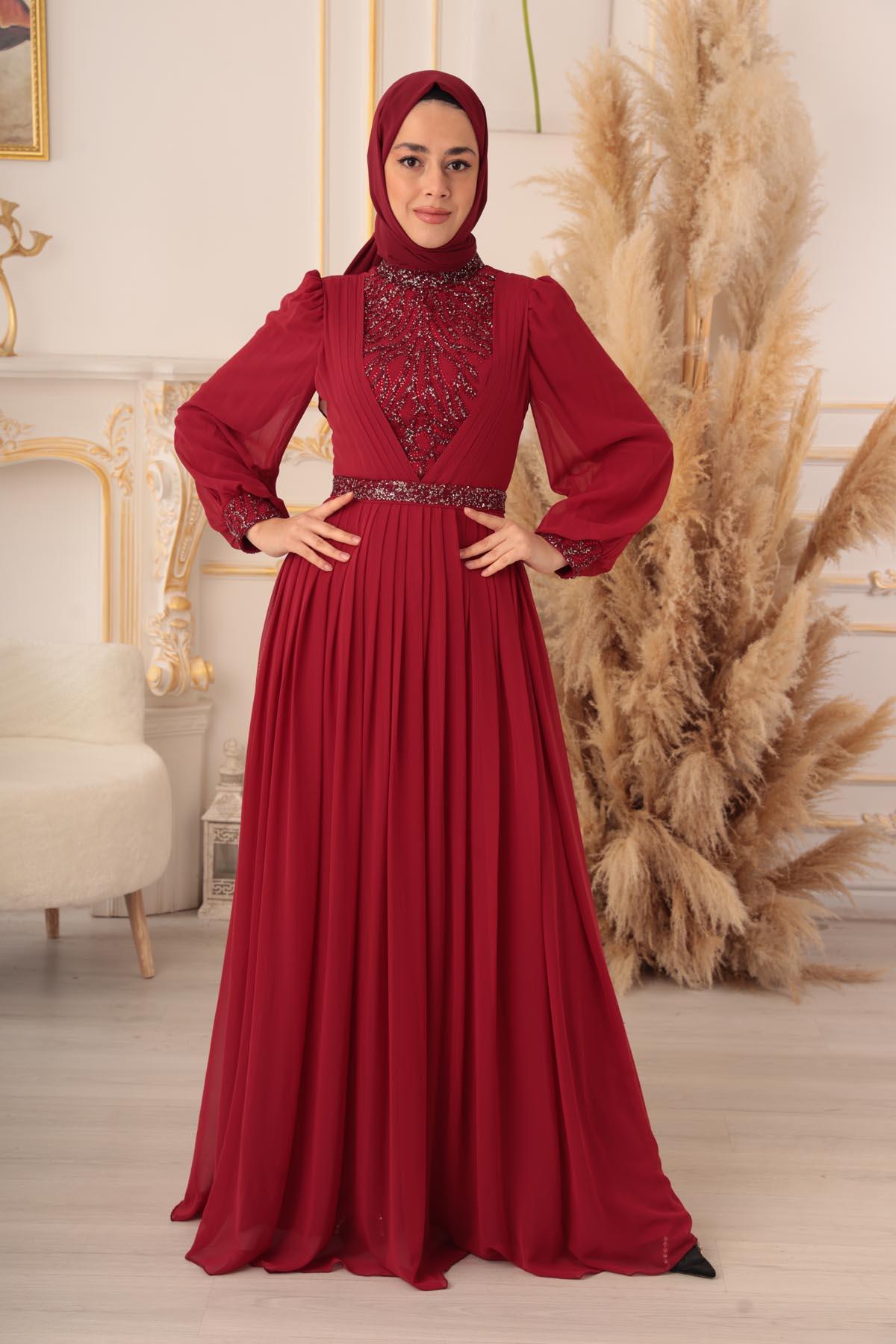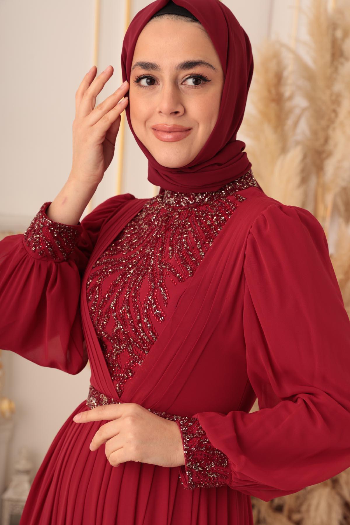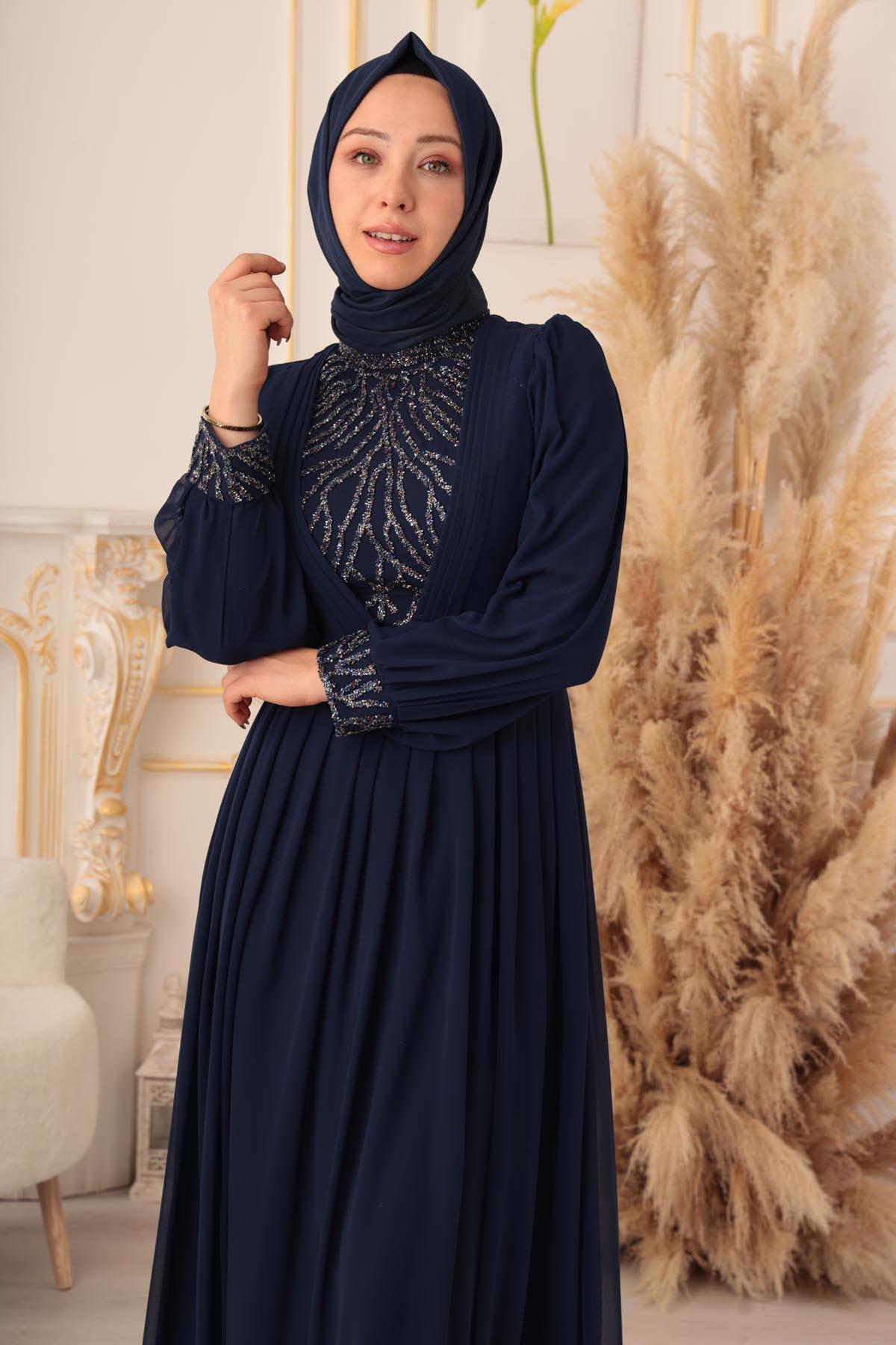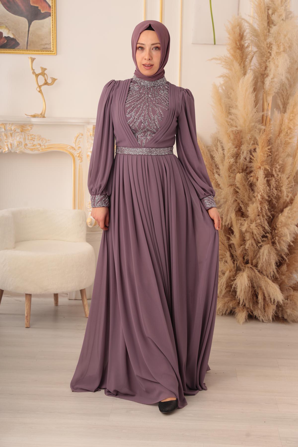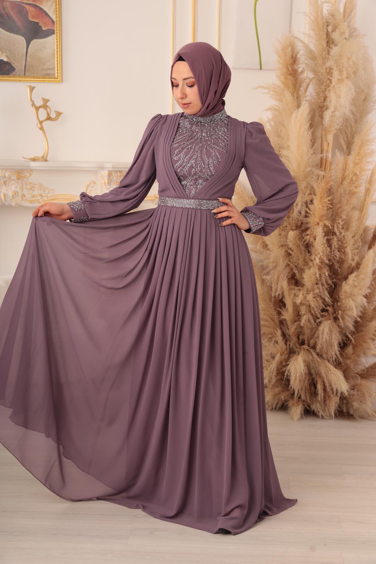 Özel bir davet, düğün, nişan gibi özel günlerinizde şıklığınızı ve asaletinizi ortaya koymak için ideal bir seçim olan TAŞ VE PLİSE DETAYLI ŞİFON TESETTÜR ABİYE (17925), size mükemmel bir görünüm kazandıracak ve sizi özel kılacaktır.