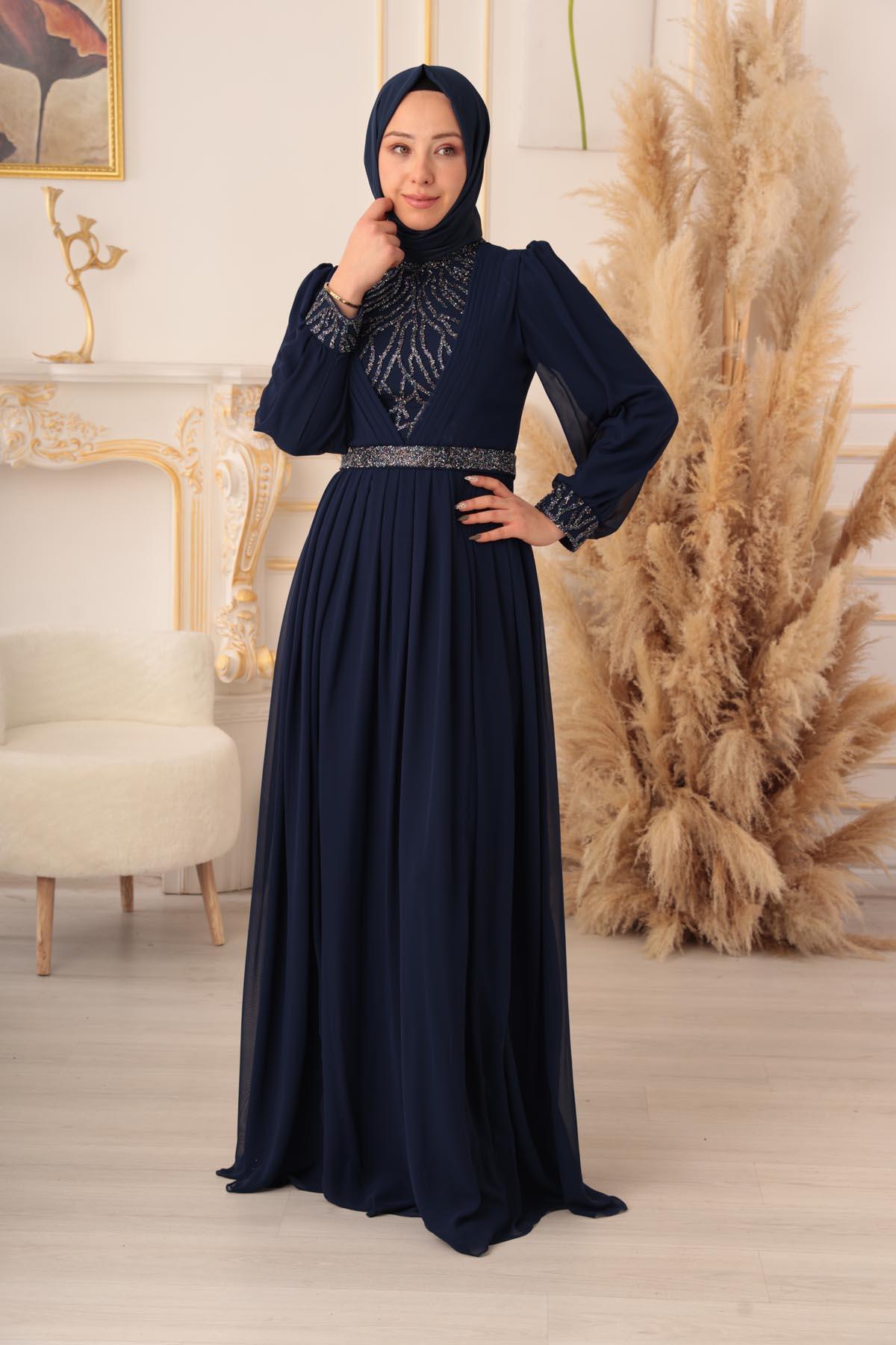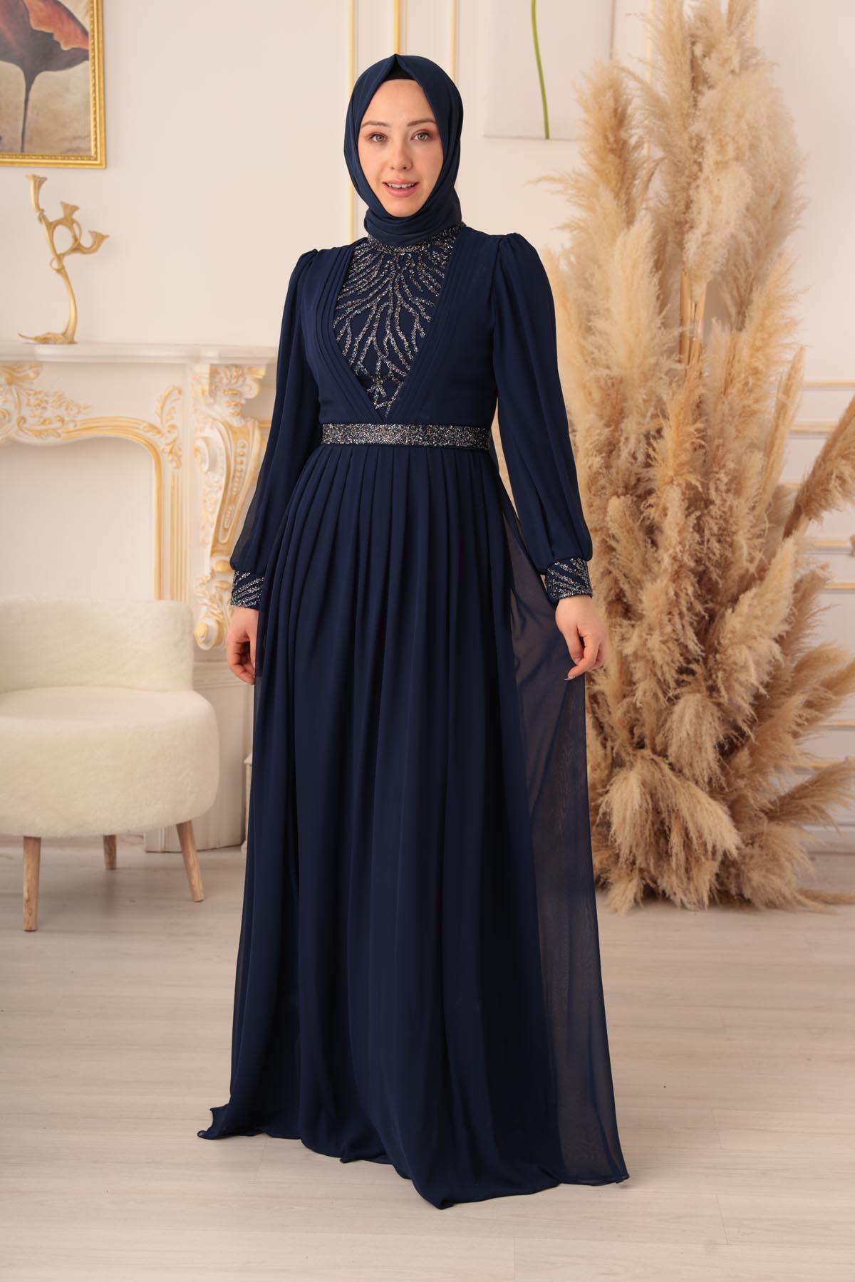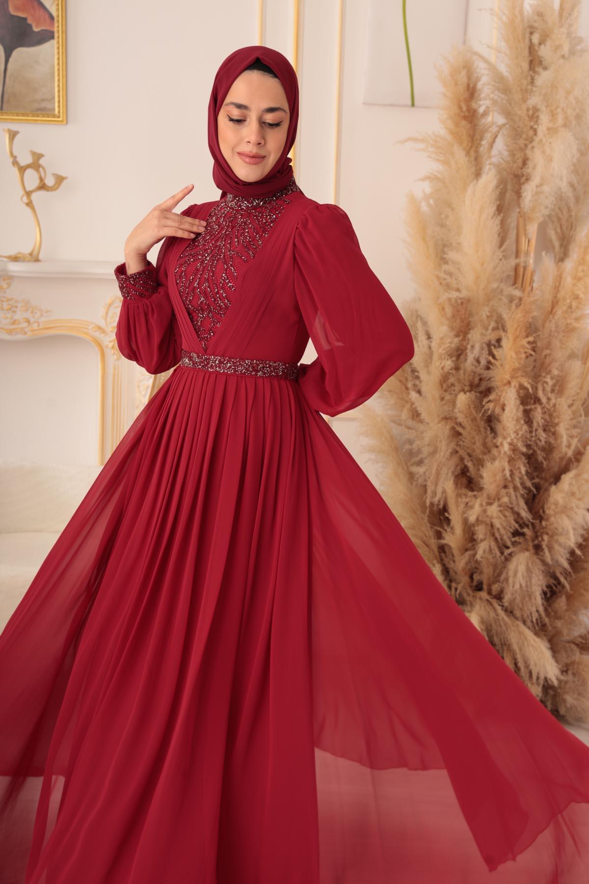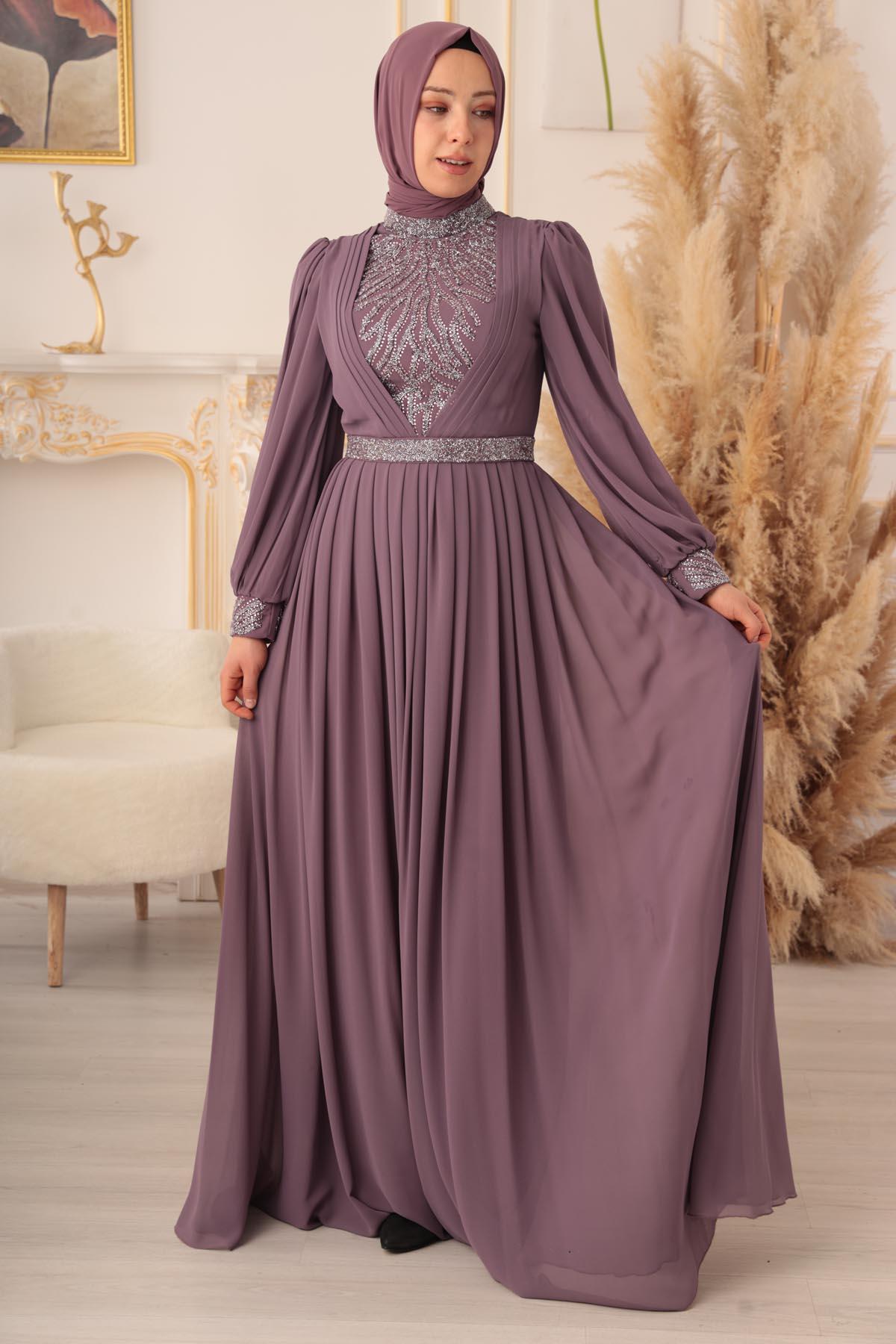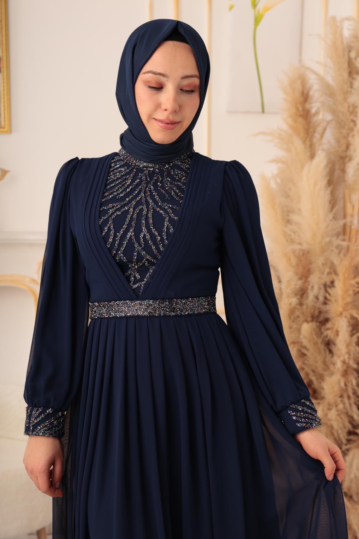 Özel bir davet, düğün, nişan gibi özel günlerinizde şıklığınızı ve asaletinizi ortaya koymak için ideal bir seçim olan TAŞ VE PLİSE DETAYLI ŞİFON TESETTÜR ABİYE (17925), size mükemmel bir görünüm kazandıracak ve sizi özel kılacaktır.