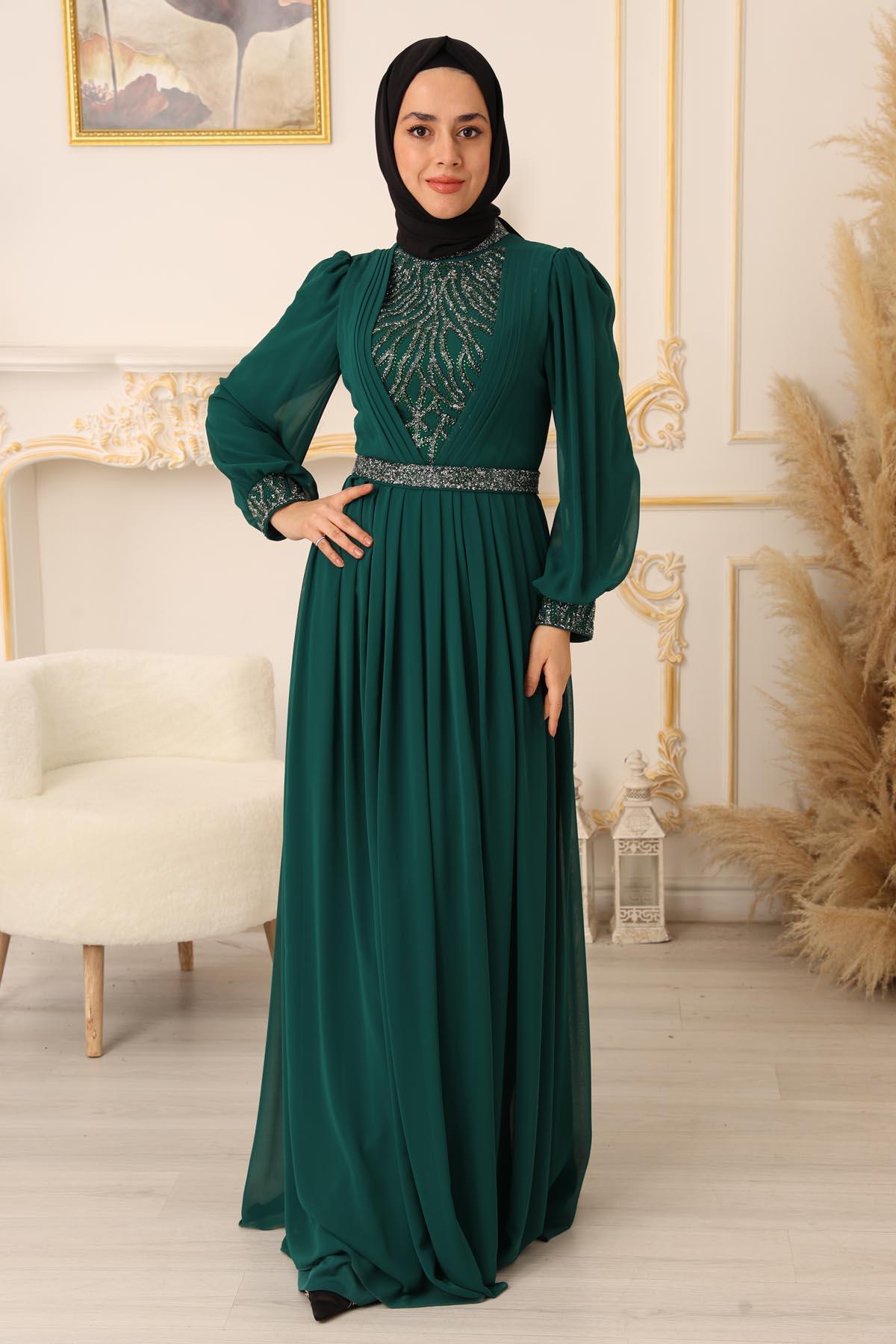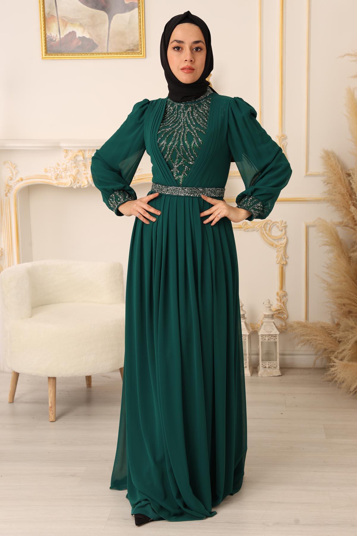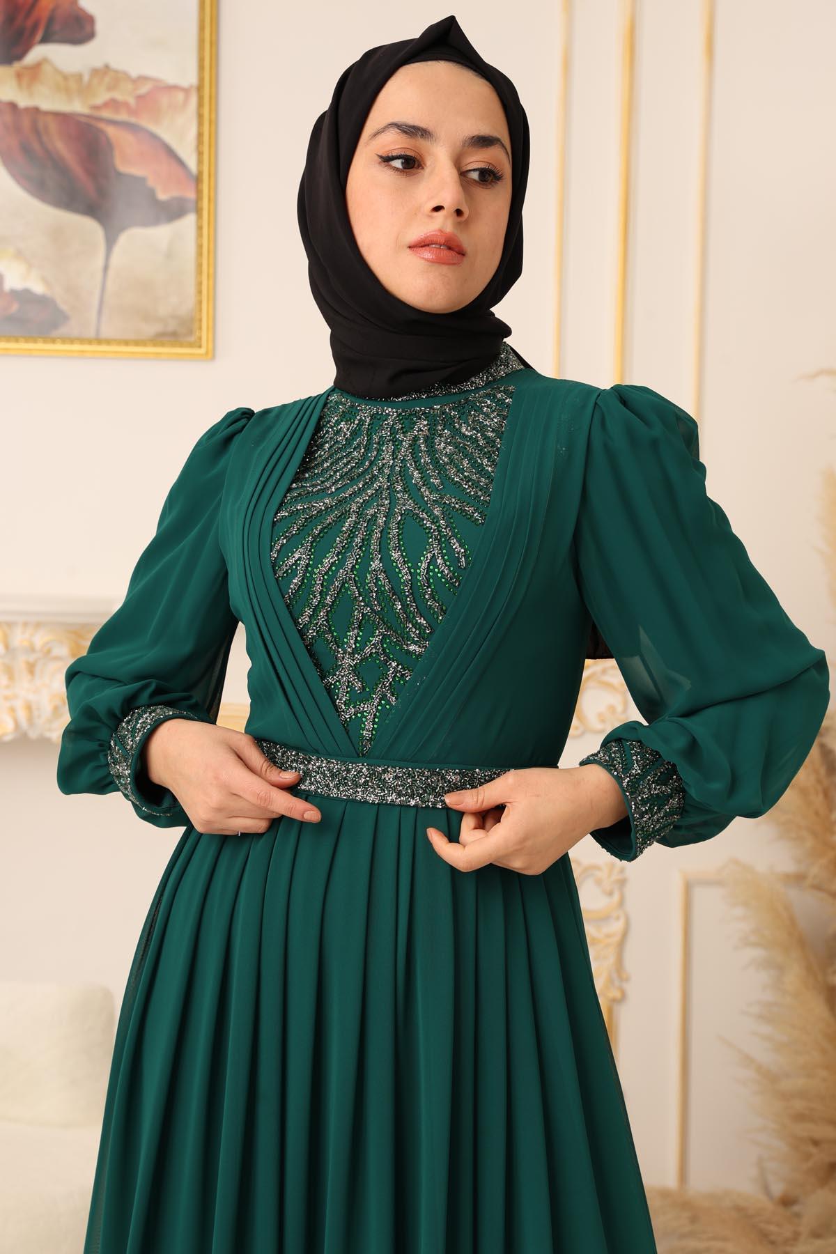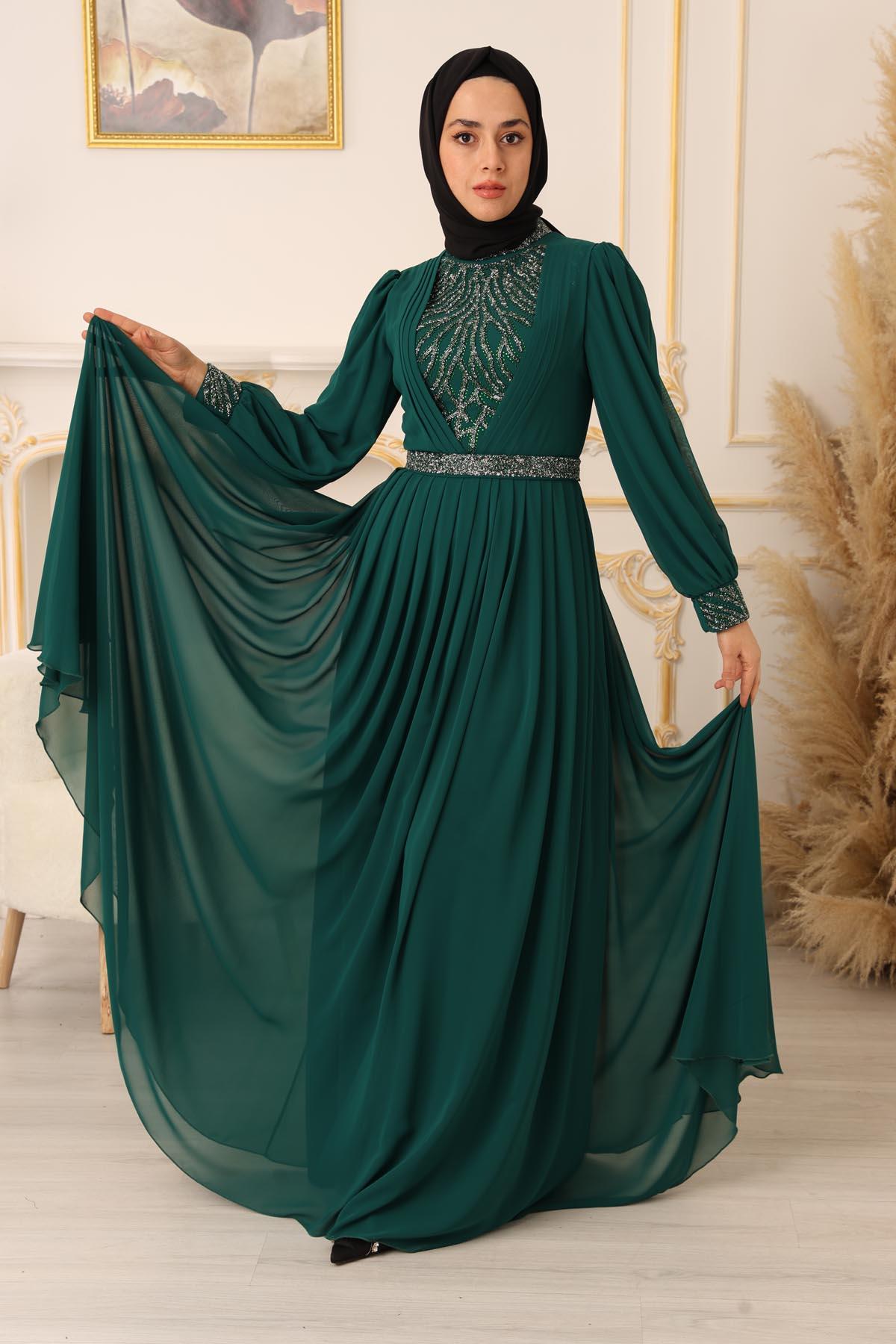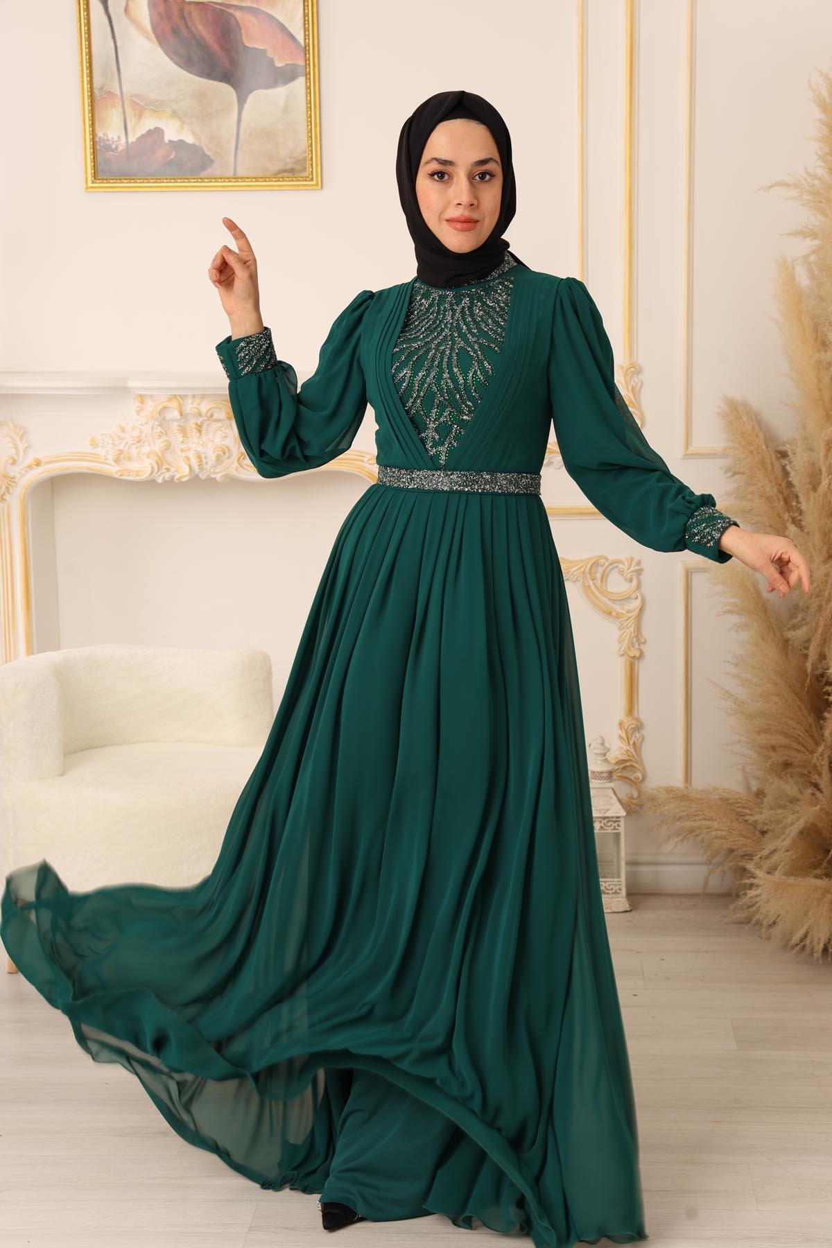 Özel bir davet, düğün, nişan gibi özel günlerinizde şıklığınızı ve asaletinizi ortaya koymak için ideal bir seçim olan TAŞ VE PLİSE DETAYLI ŞİFON TESETTÜR ABİYE (17925), size mükemmel bir görünüm kazandıracak ve sizi özel kılacaktır.