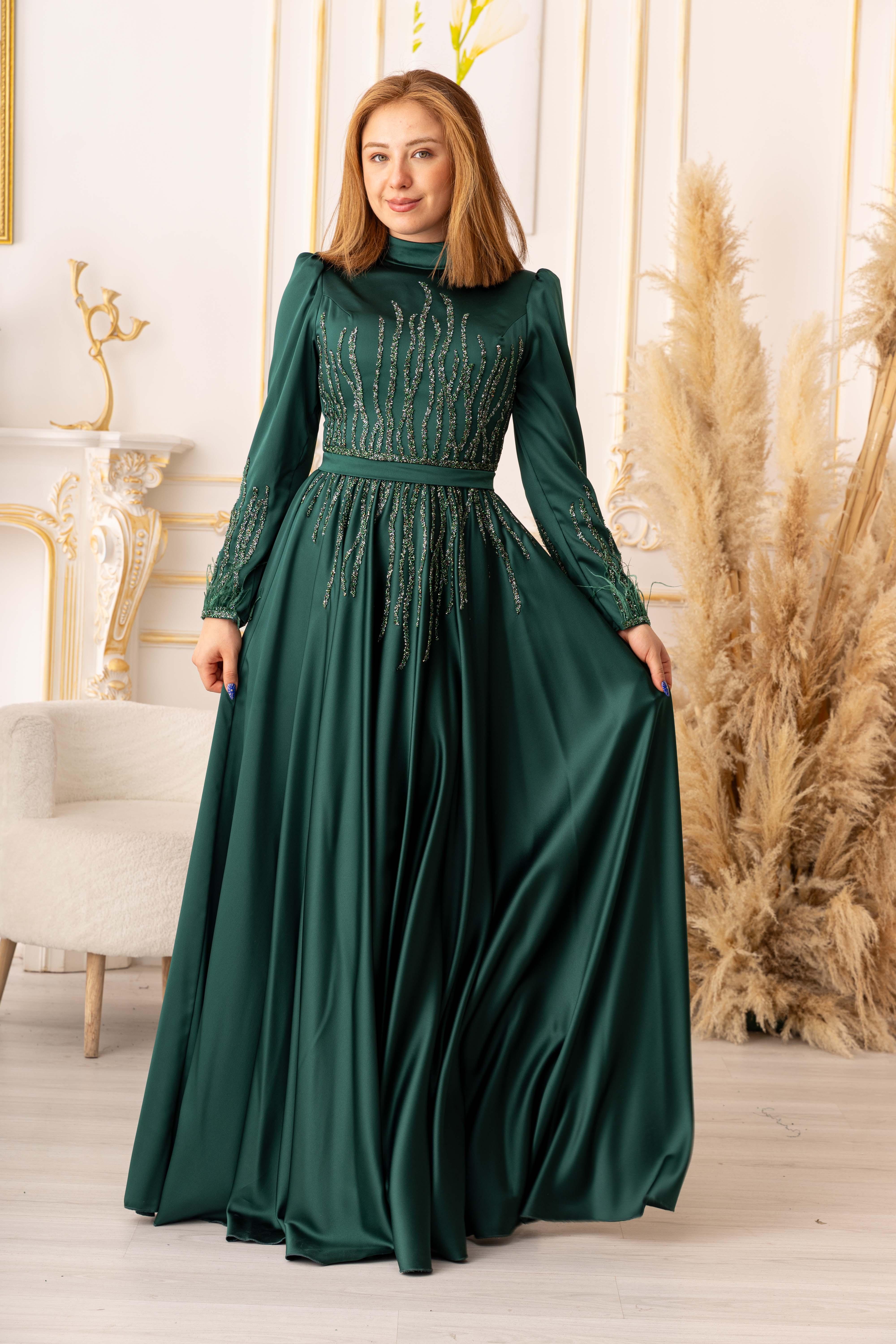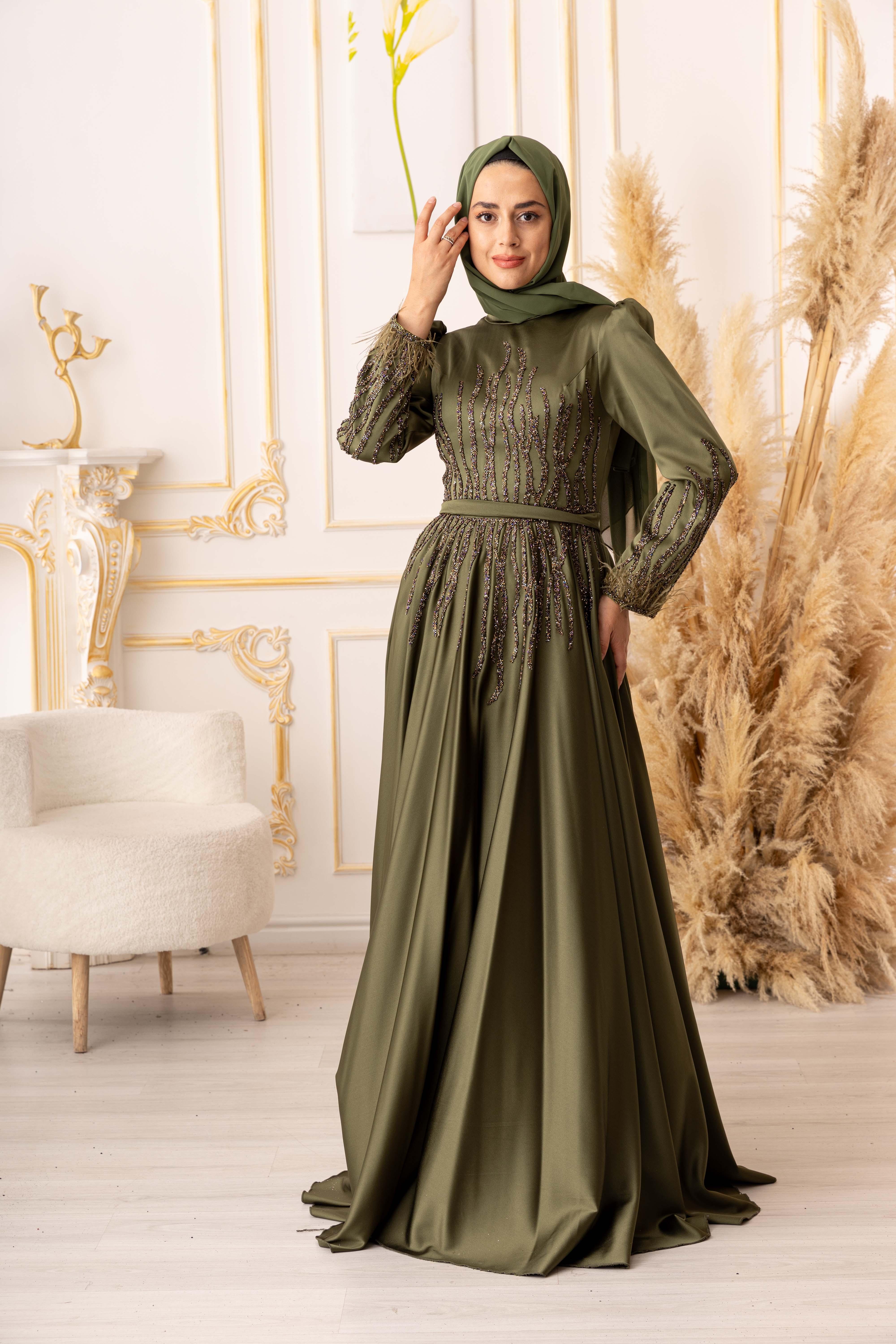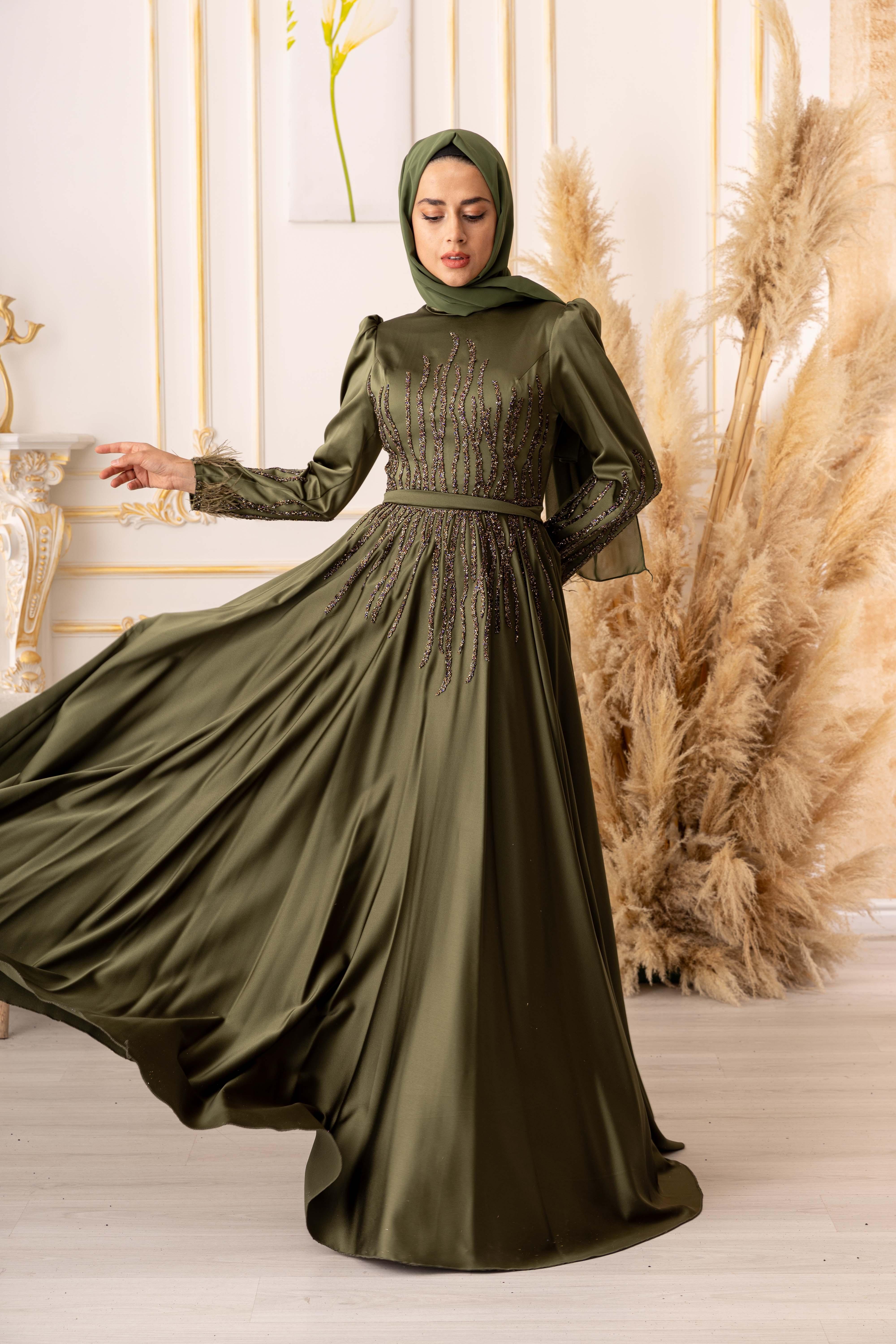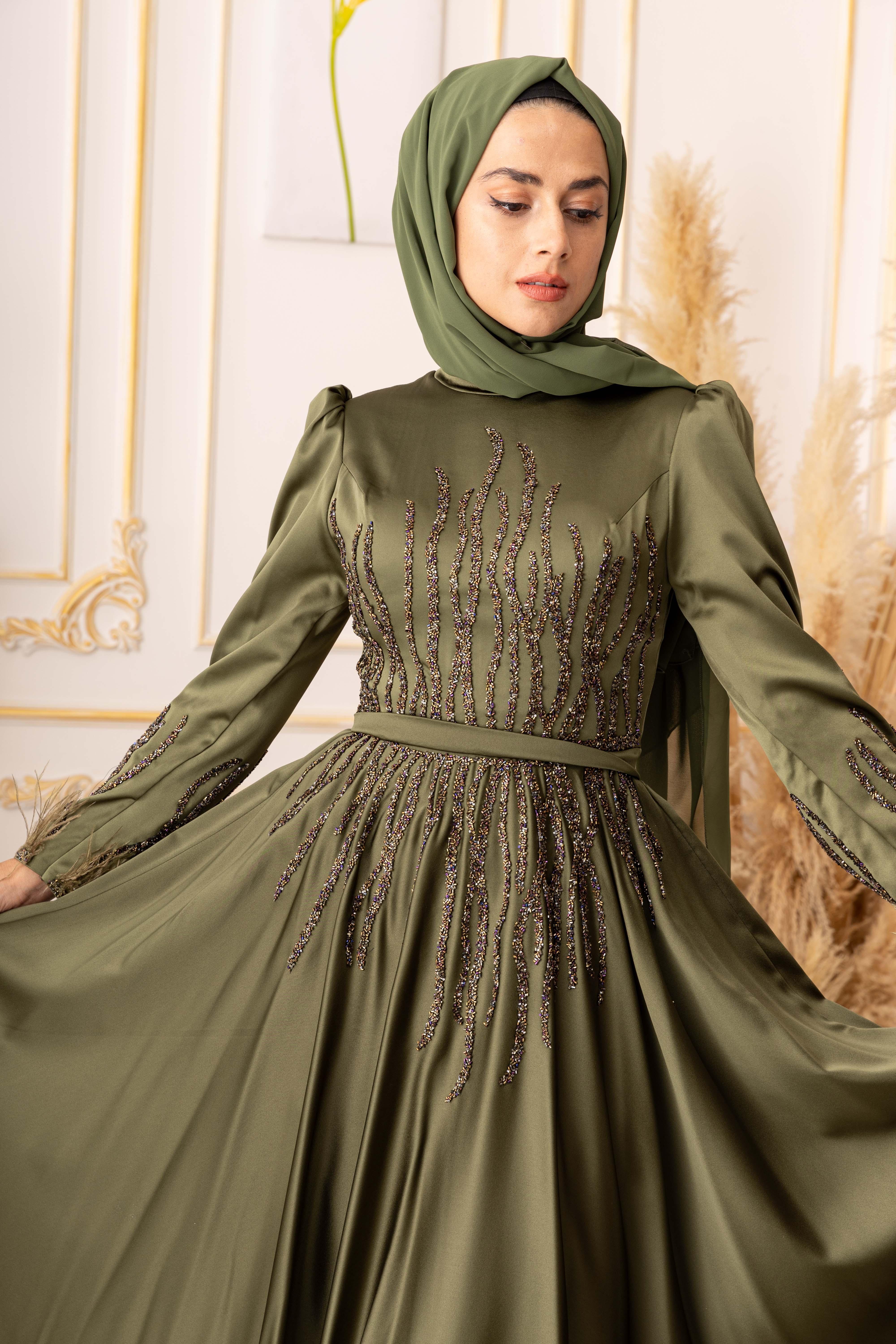 Tesettür modasına uygun olarak tasarlanan bu abiye elbise, uzun kollu ve uzun bir boy kesimine sahiptir. Bu sayede vücudu tamamen kapatarak tesettür standartlarına uygun olan bir tarz oluşturur. Ayrıca, bel bölümünde yer alan bant sayesinde bedeninize oturarak, vücut hatlarınızı daha da güzel bir şekilde ortaya çıkarmaktadır.