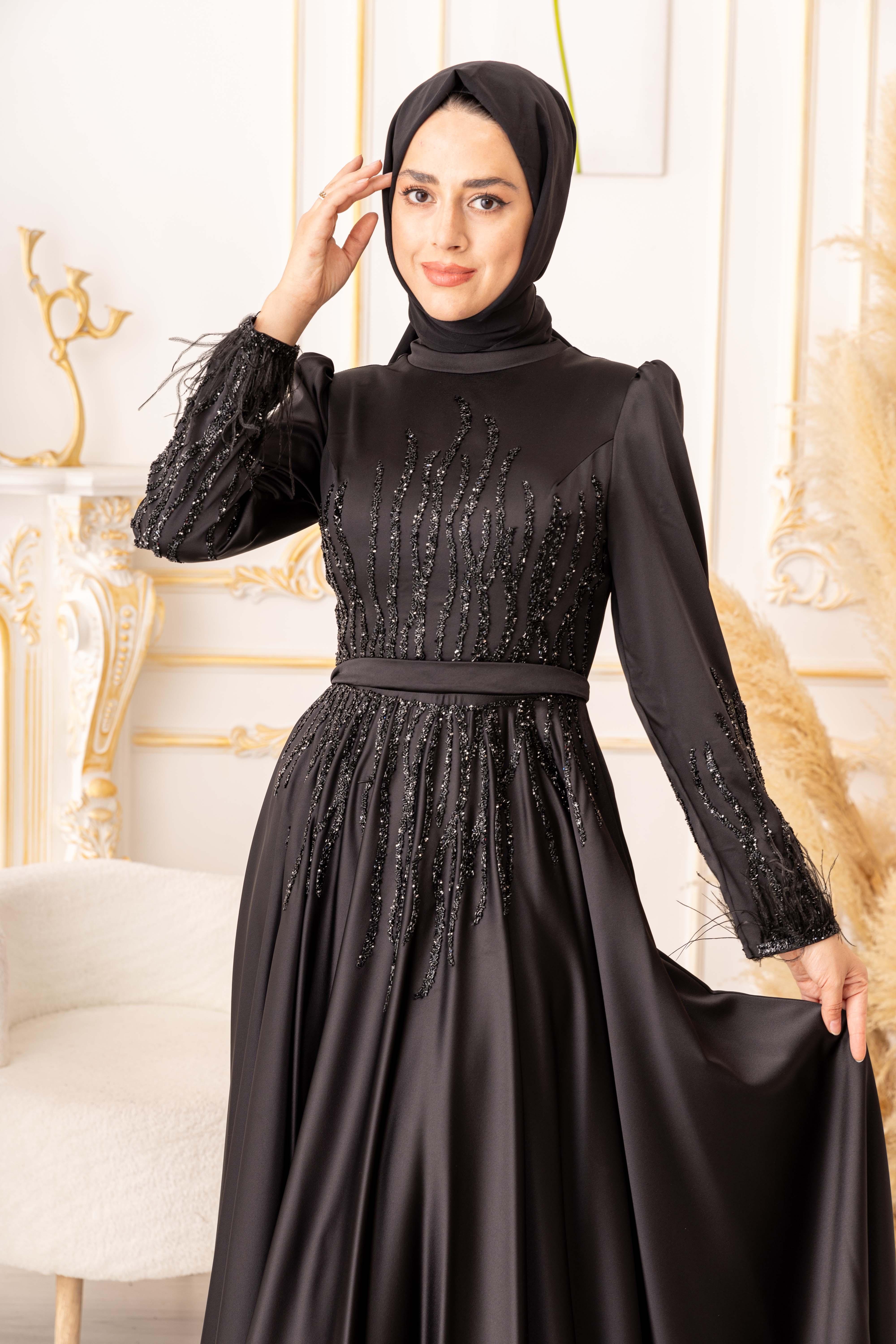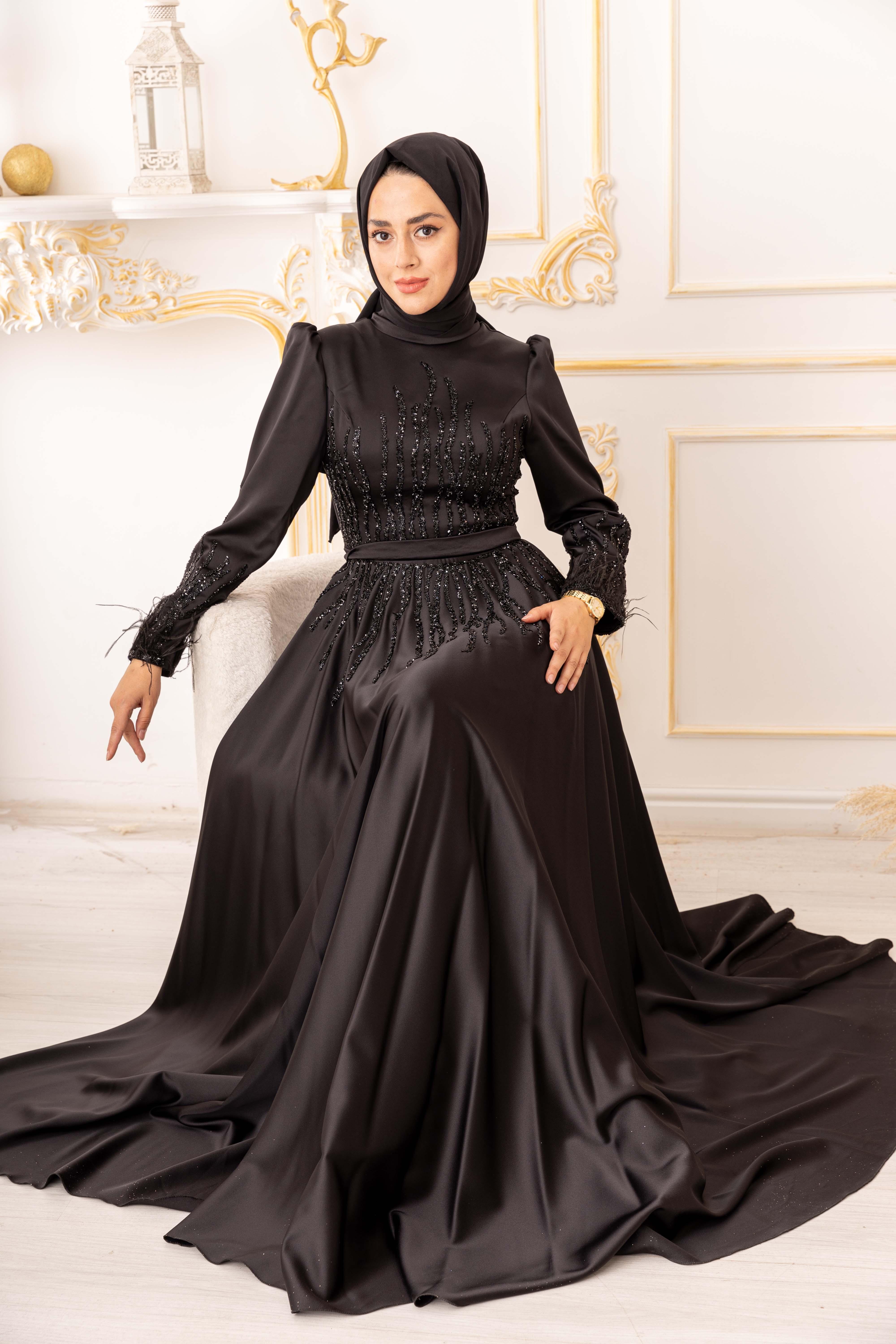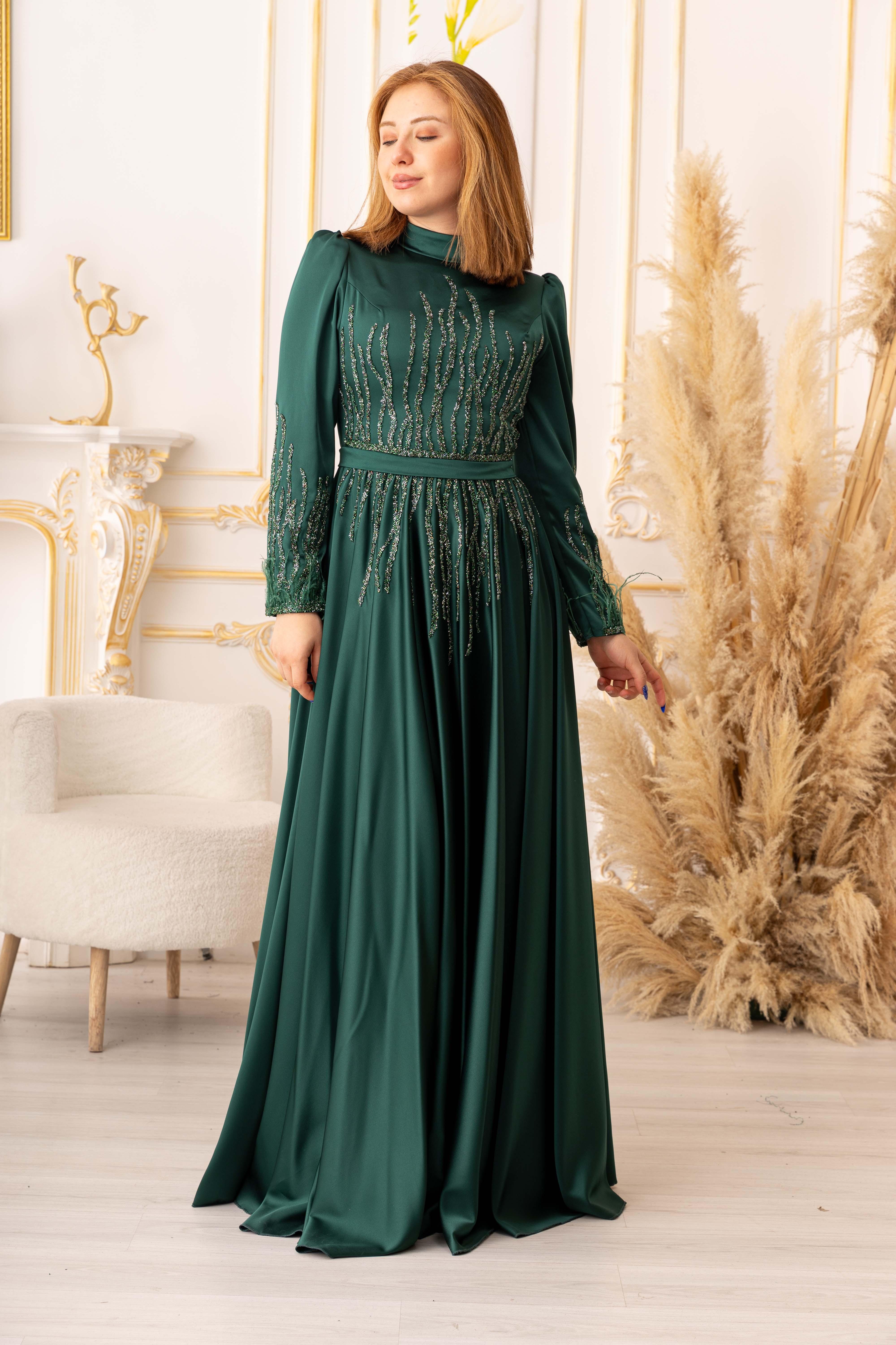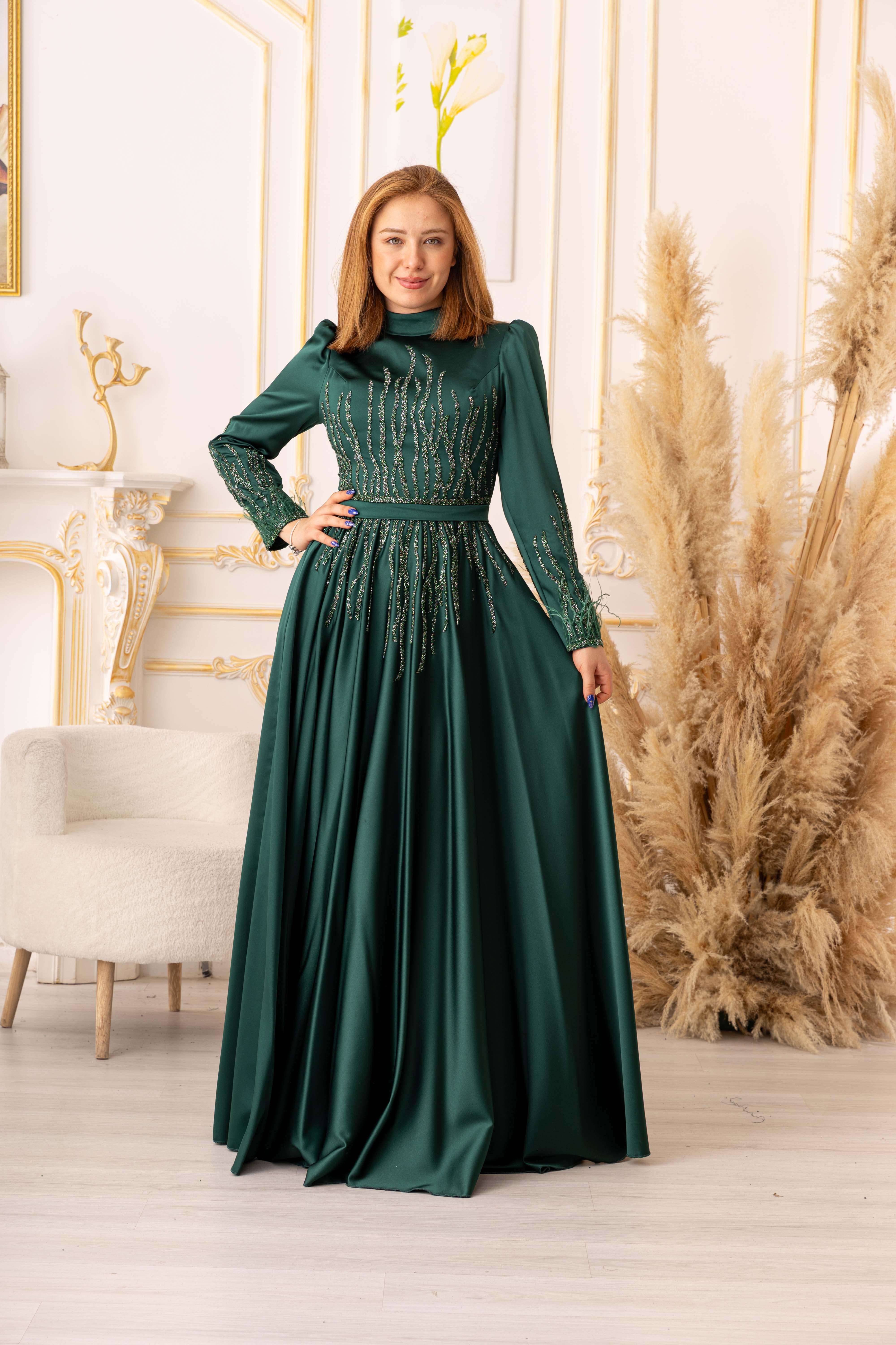 Tesettür modasına uygun olarak tasarlanan bu abiye elbise, uzun kollu ve uzun bir boy kesimine sahiptir. Bu sayede vücudu tamamen kapatarak tesettür standartlarına uygun olan bir tarz oluşturur. Ayrıca, bel bölümünde yer alan bant sayesinde bedeninize oturarak, vücut hatlarınızı daha da güzel bir şekilde ortaya çıkarmaktadır.