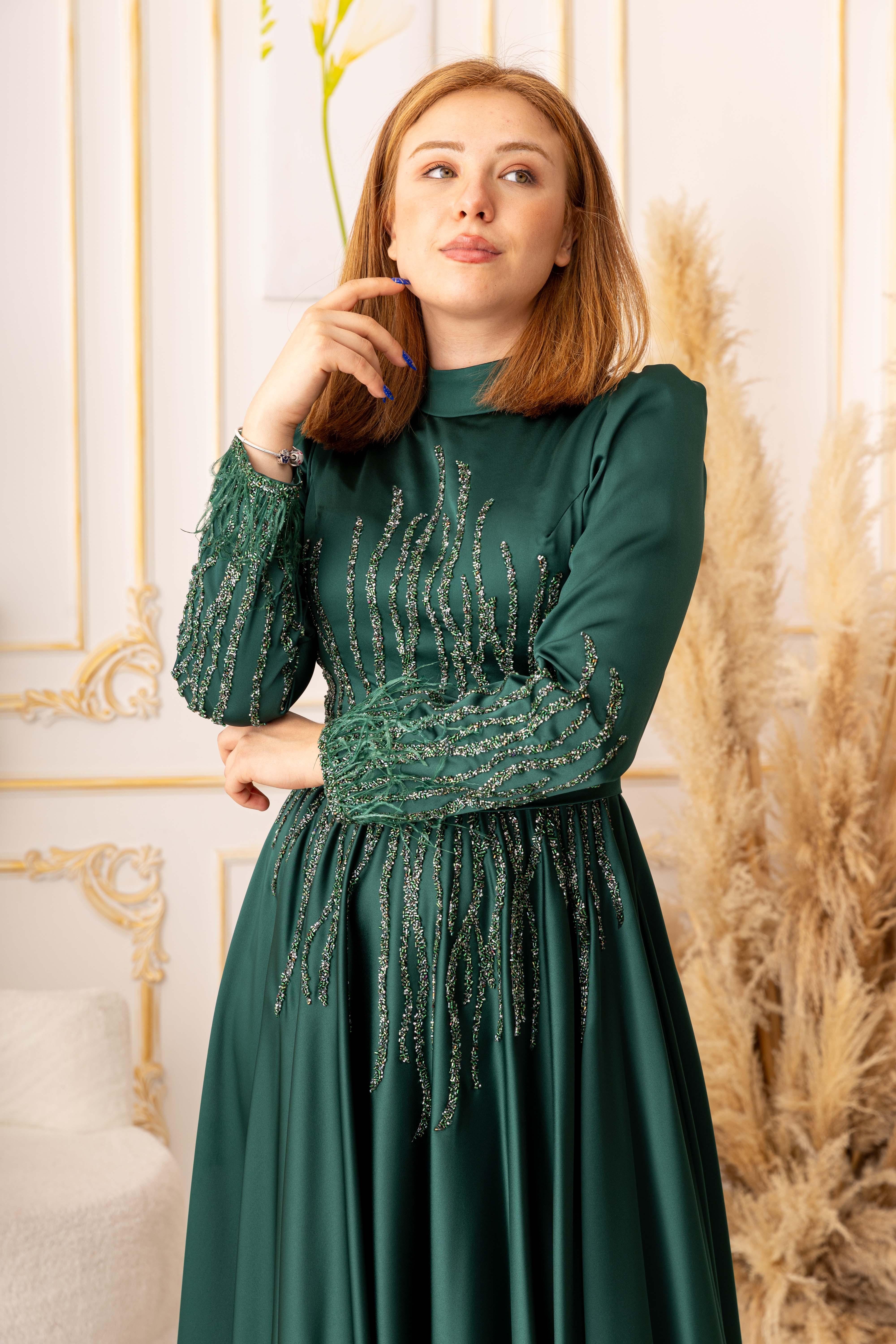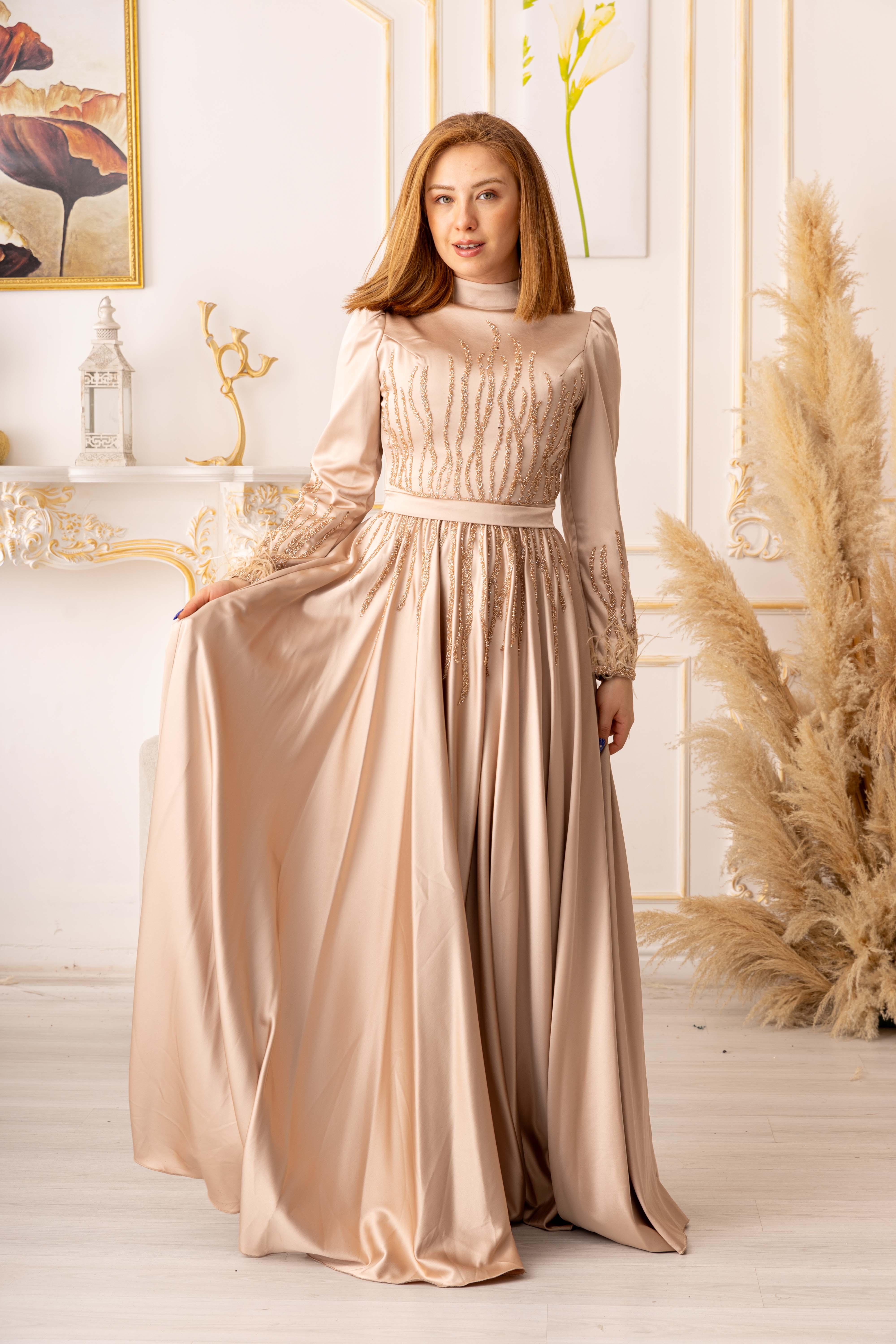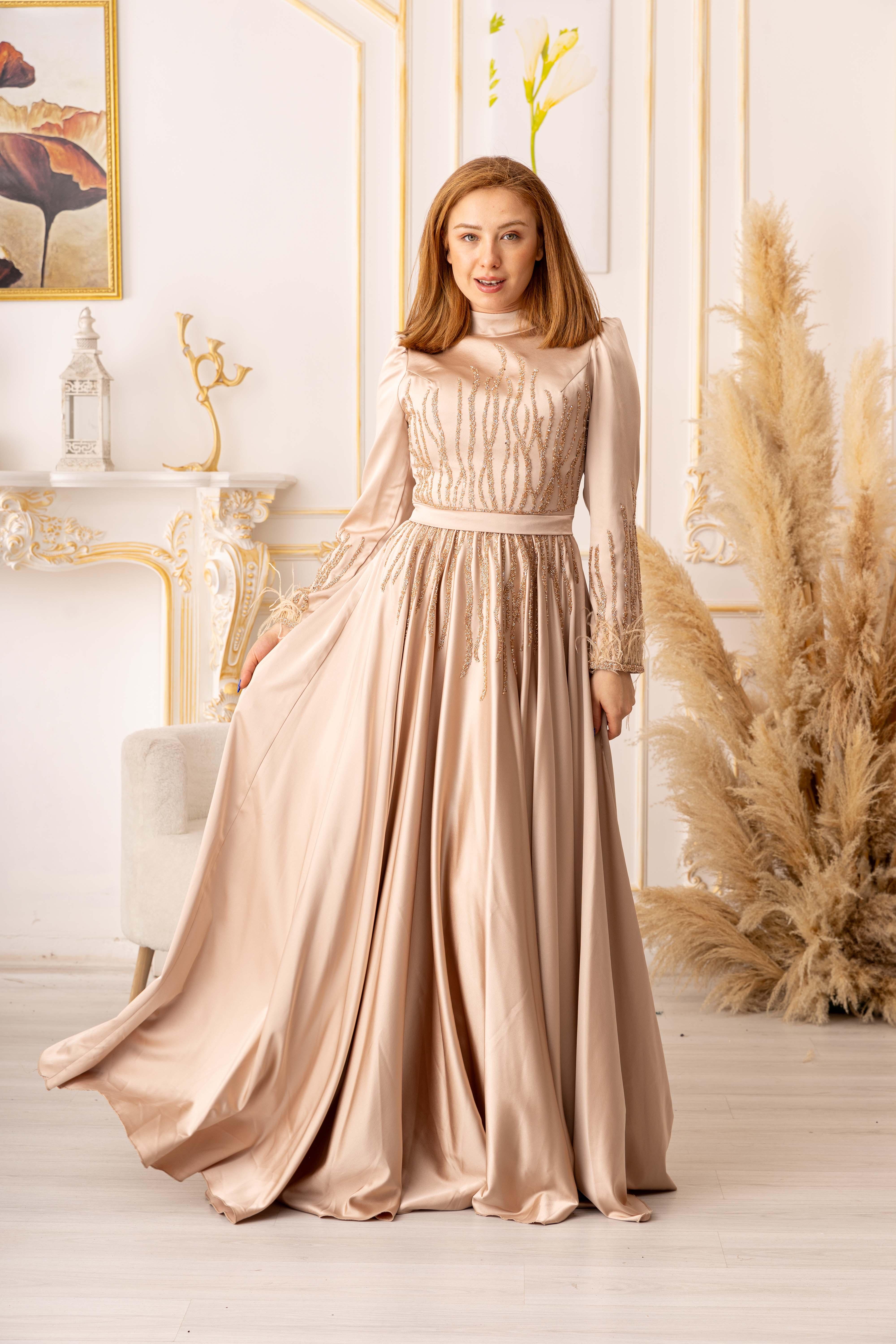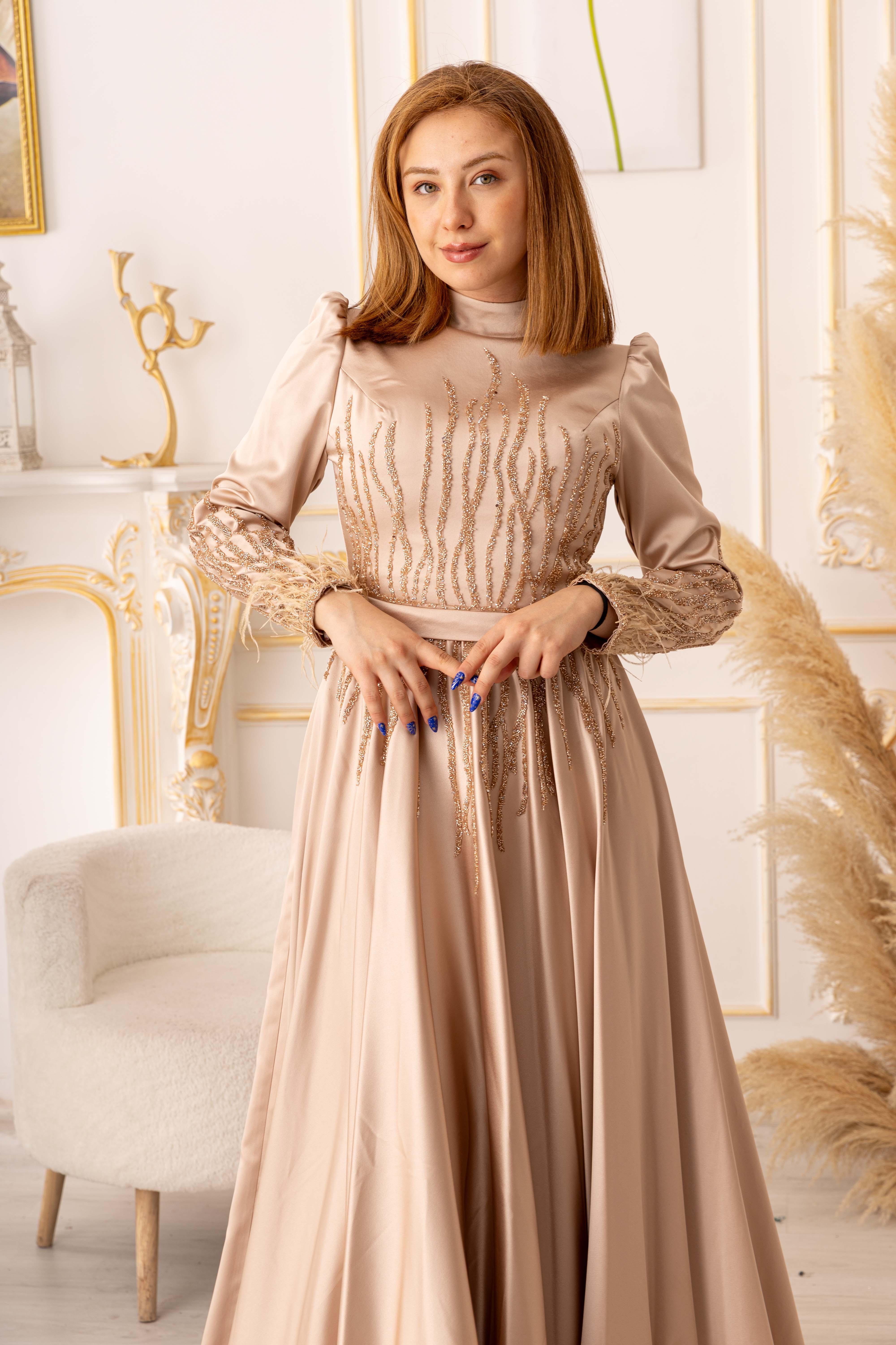 Elbisenin kumaşı saten olup, oldukça yumuşak ve parlak bir dokuya sahiptir. Bu sayede vücutta çok rahat bir şekilde durur ve özel günlerinizde size konforlu bir kullanım sağlar. Aynı zamanda elbisenin üzerinde yer alan tüy ve taş detayları, tasarımına farklı bir hava katmaktadır. Bu özel detaylar, elbiseye zarafet ve şıklık kazandırmaktadır.
